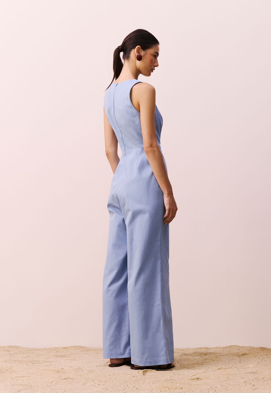 O Macacão Nó Faixa Lateral da CaCay é a escolha ideal para quem busca elegância com leveza. Com modelagem ampla e caimento fluido, ele valoriza a silhueta sem abrir mão do conforto. O detalhe do nó lateral cria uma linha visual que alonga o corpo, enquanto o design sem mangas e o decote limpo trazem sofisticação atemporal. A peça é confeccionada em 100% algodão, garantindo respirabilidade e toque suave na pele ideal para diferentes ocasiões, do dia a dia ao evento casual. A modelo tem 1,77m e veste tamanho P, evidenciando o ajuste versátil da peça.