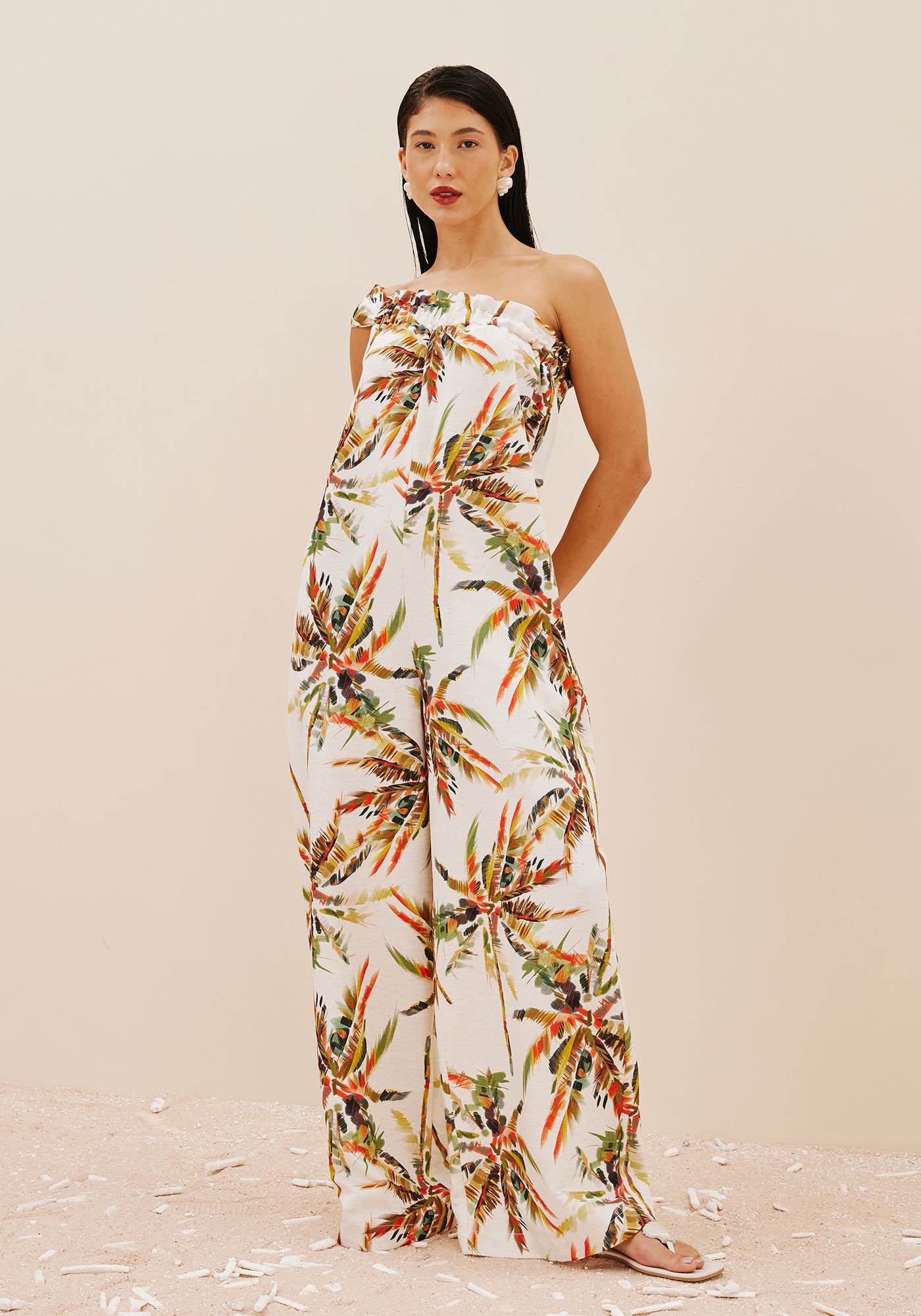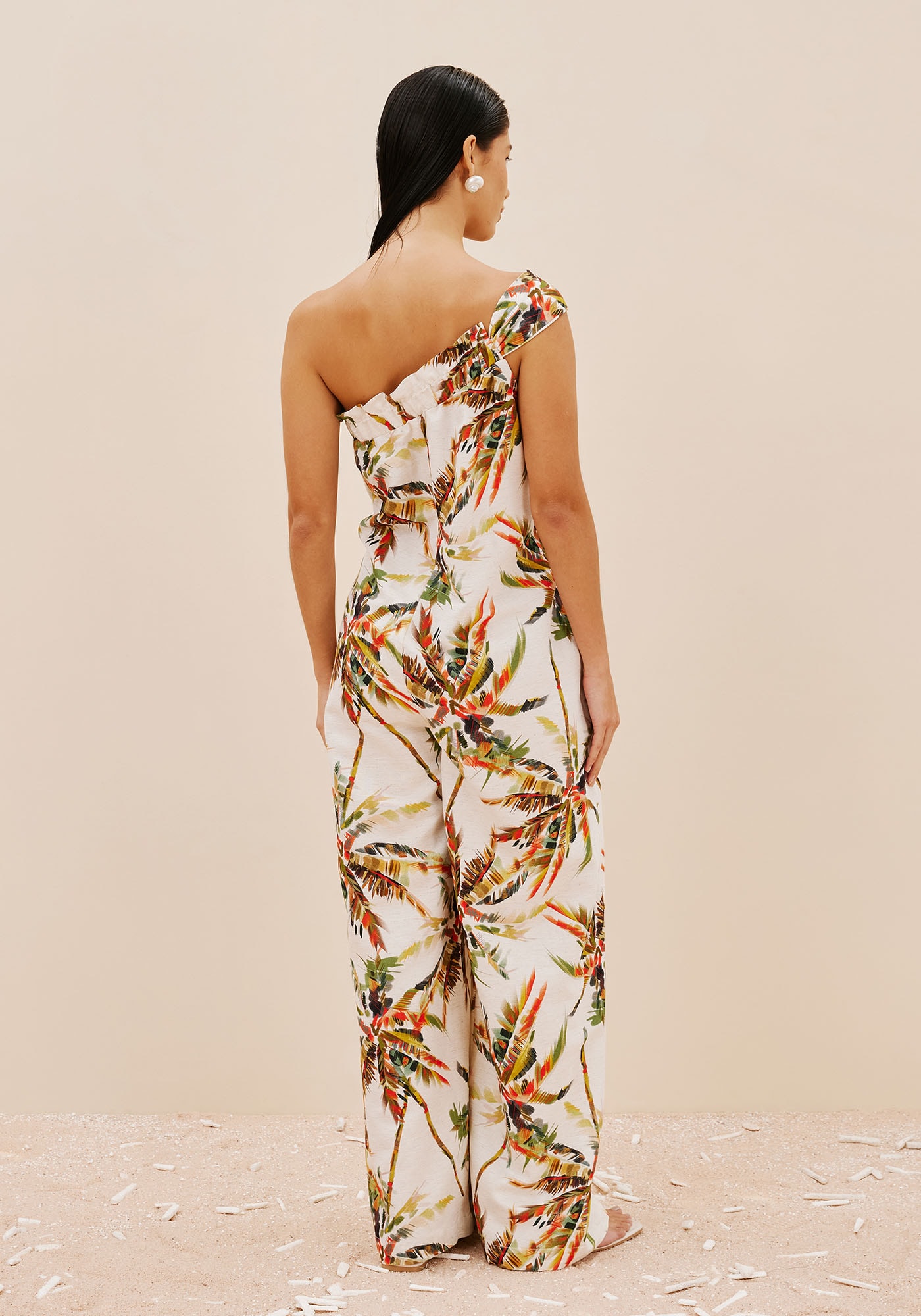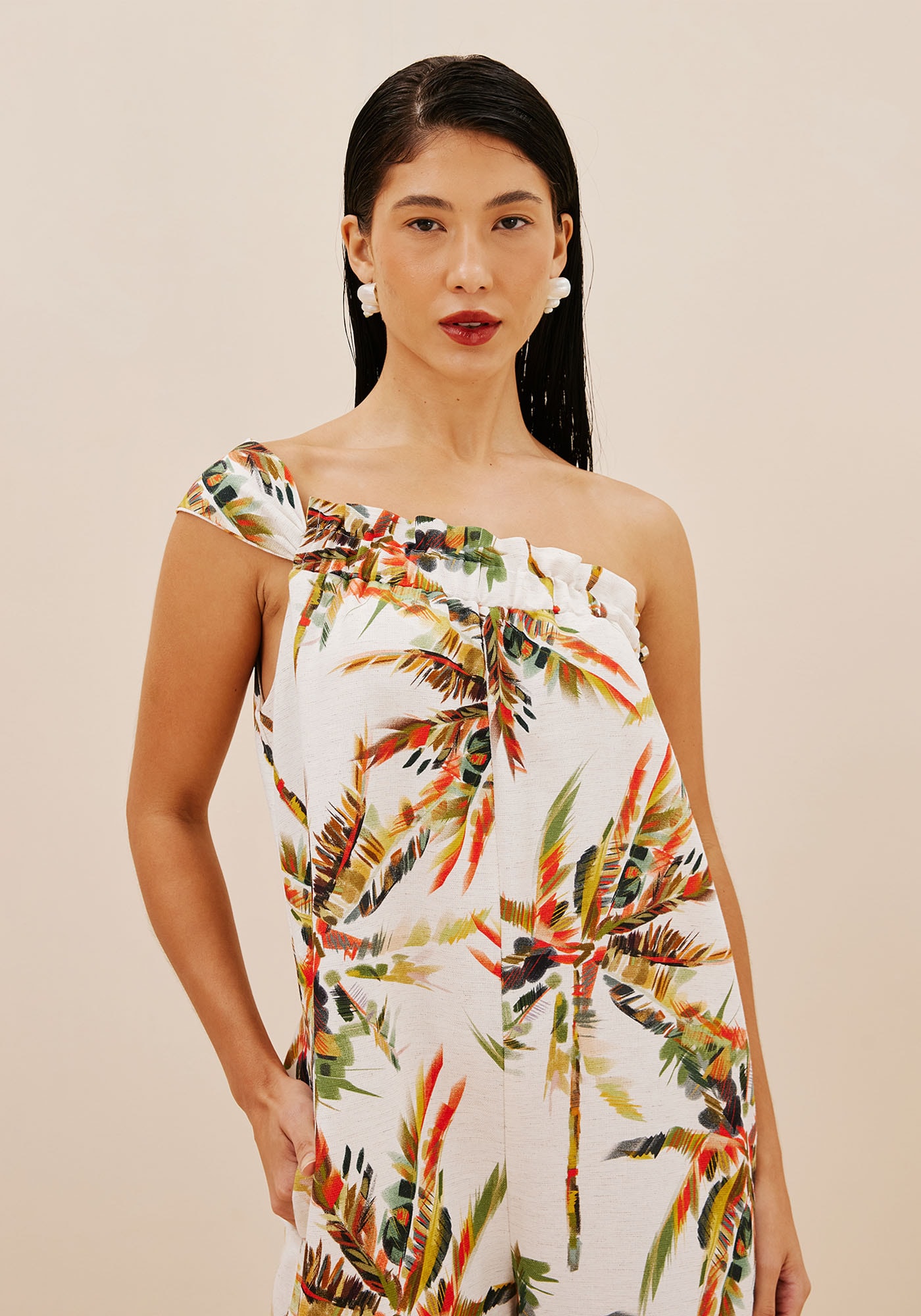 O macacão estampado Itapuã é confeccionado em tecido 50% algodão 29% viscose 15% modal e 6% linho. Com o shape soltinho e bolsos laterais, é um modelo de um ombro com babado na alça, elegante e charmoso.