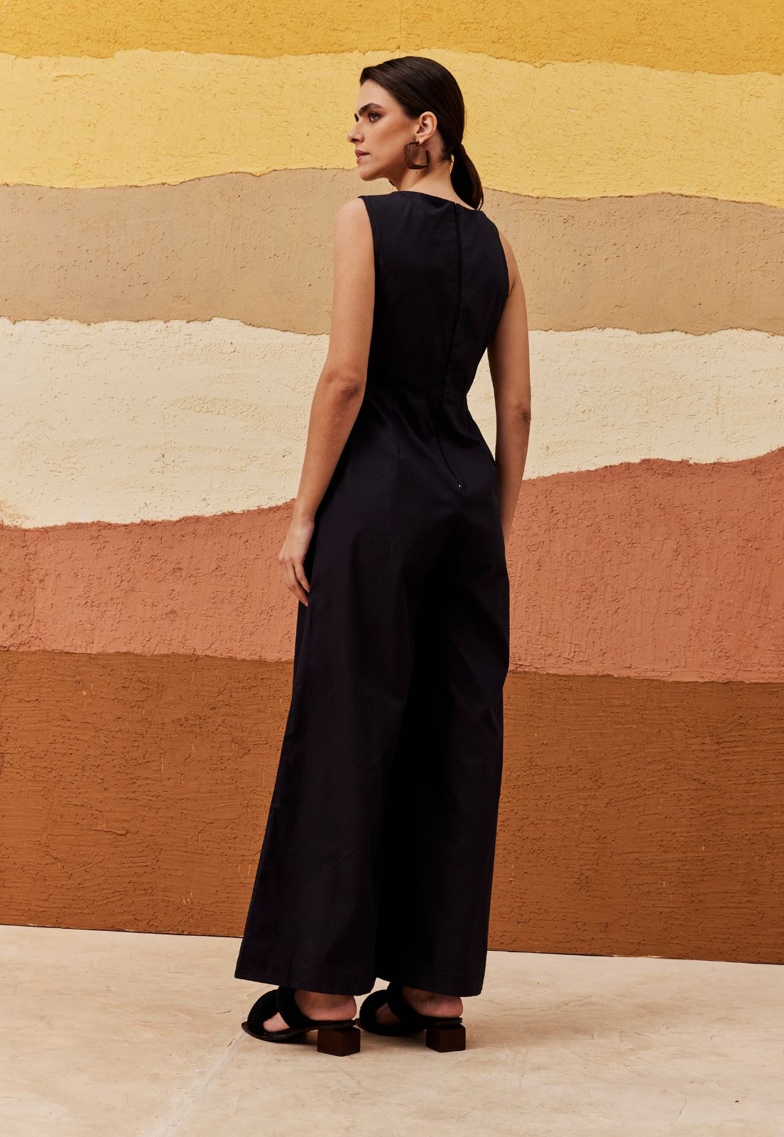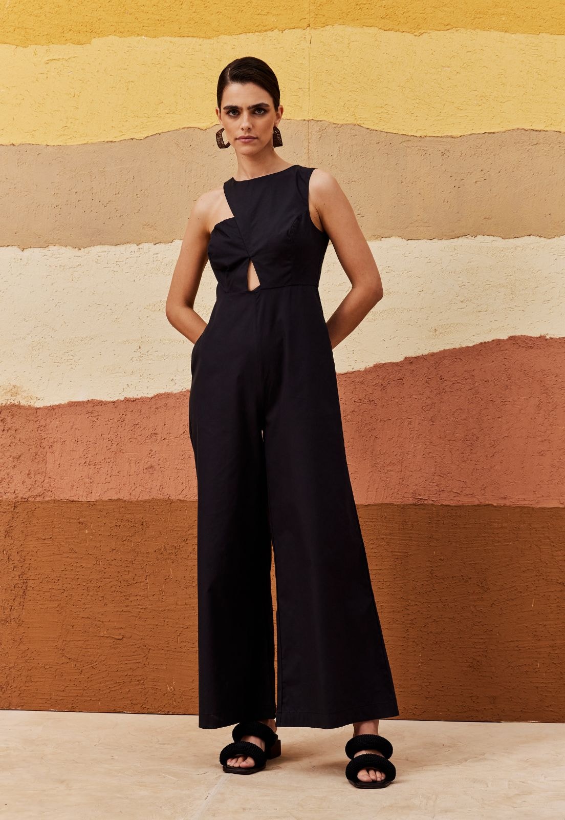 O macacão liso é confeccionado em tecido 100% algodão. O modelo elegante possui calça pantalona com decote alto e recorte assimétrico na frente. Tem fechamento em zíper nas costas.