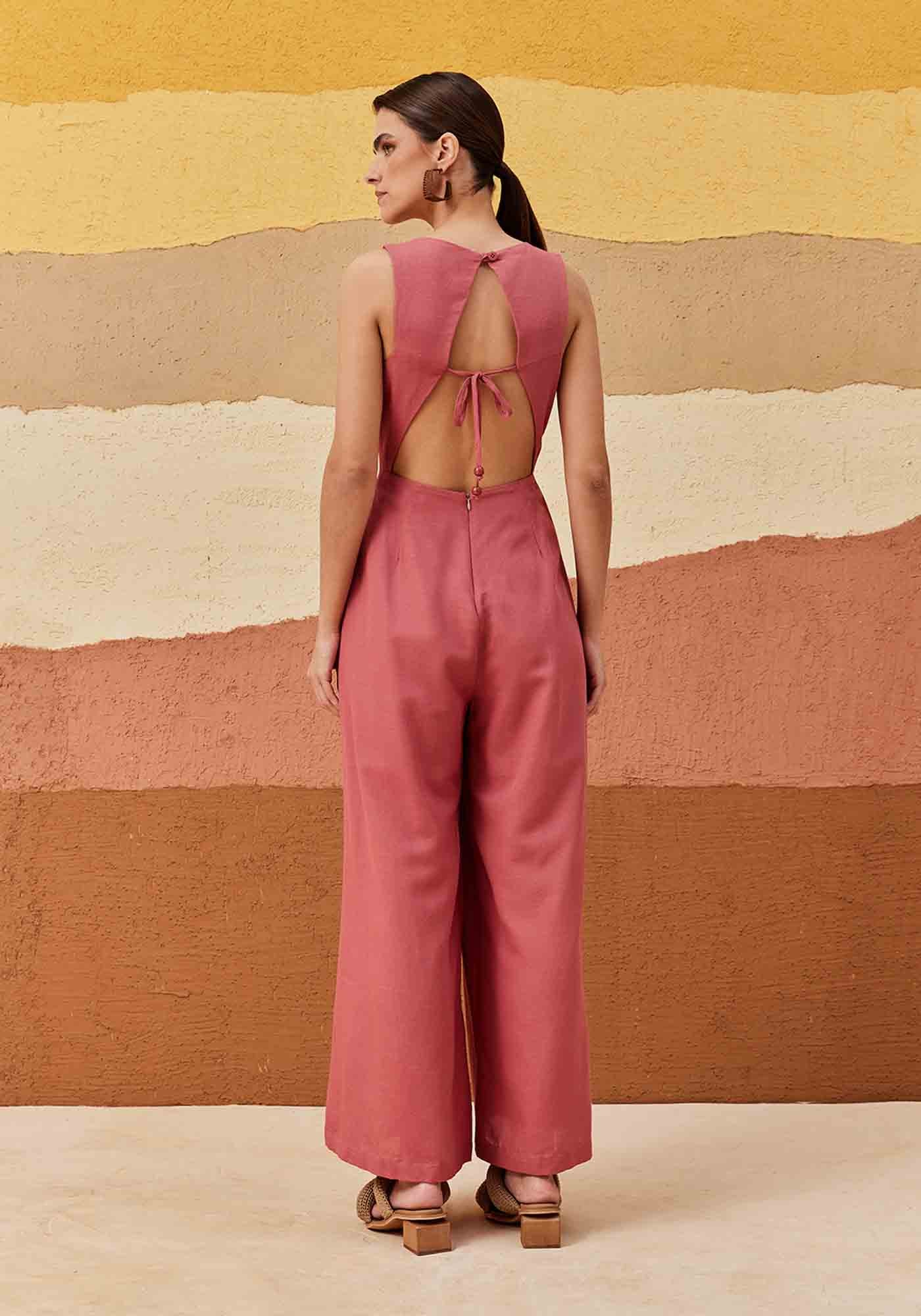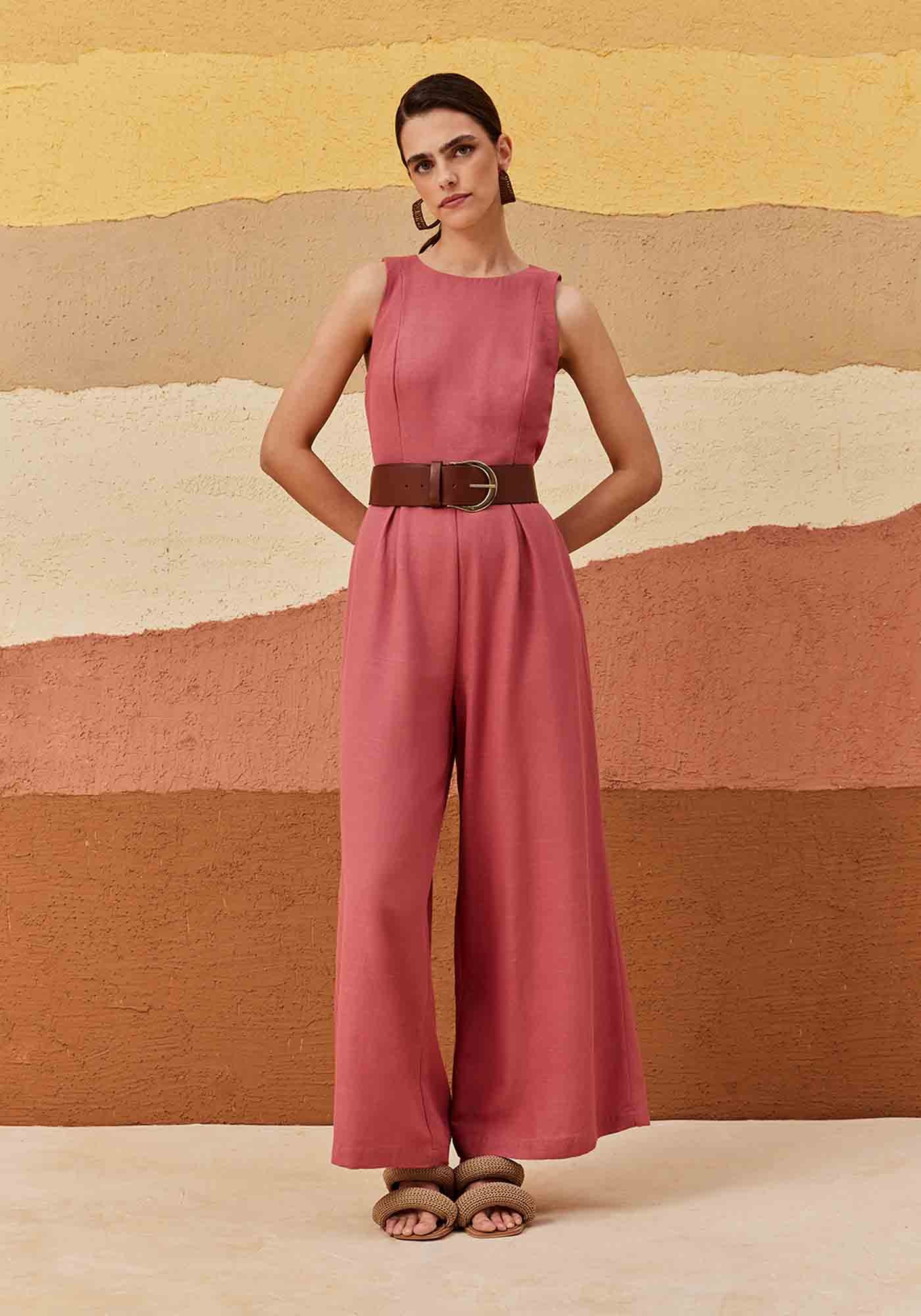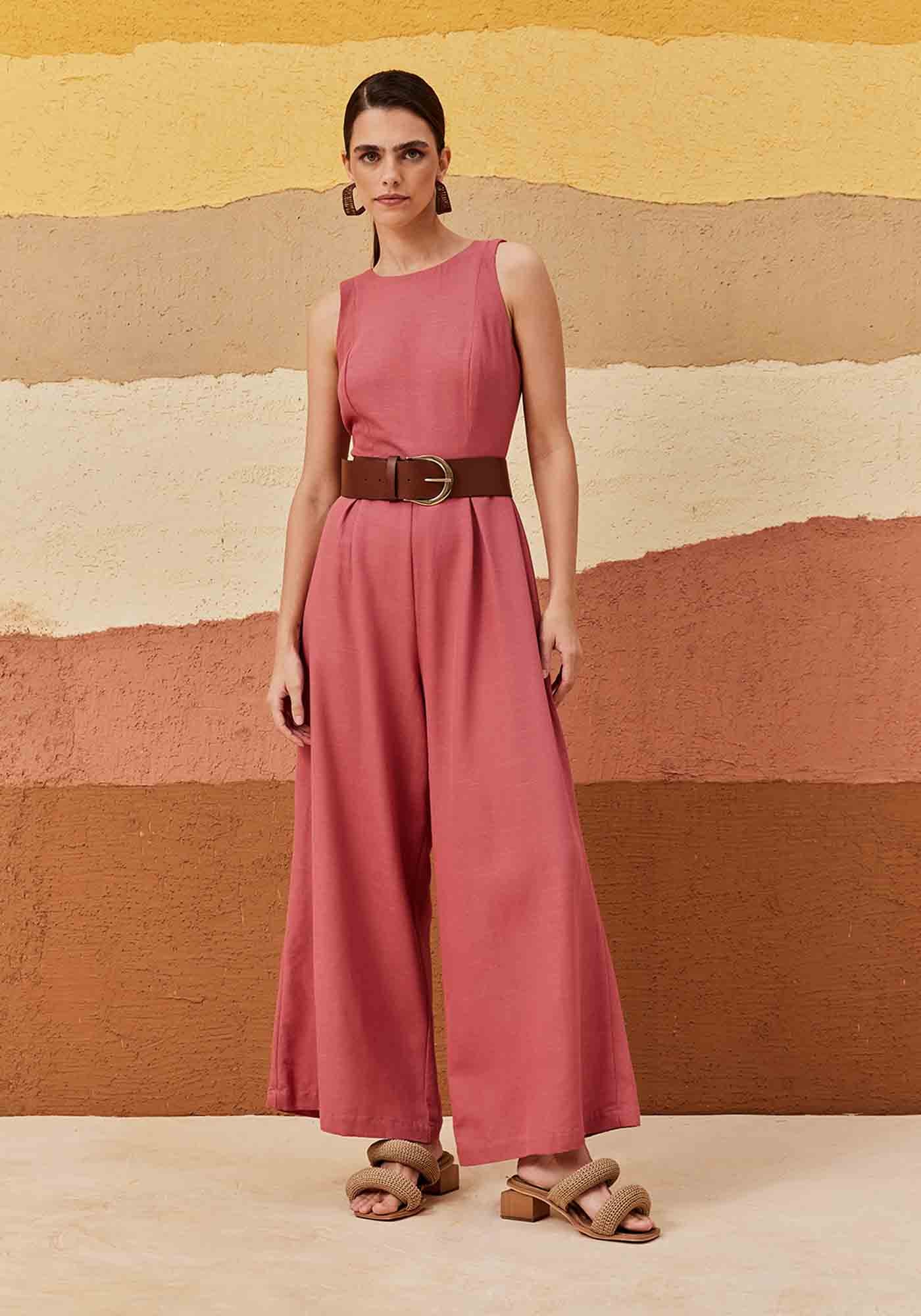 Omacacão em cor lisa é confeccionado em tecido 61% viscose e 35% algodão. Omodelo possui um recorte nas costas com amarração e fechamento em botão, além dashape sem manga ajustado com calça estilo pantalona, que garante um toque desofisticação para a peça.