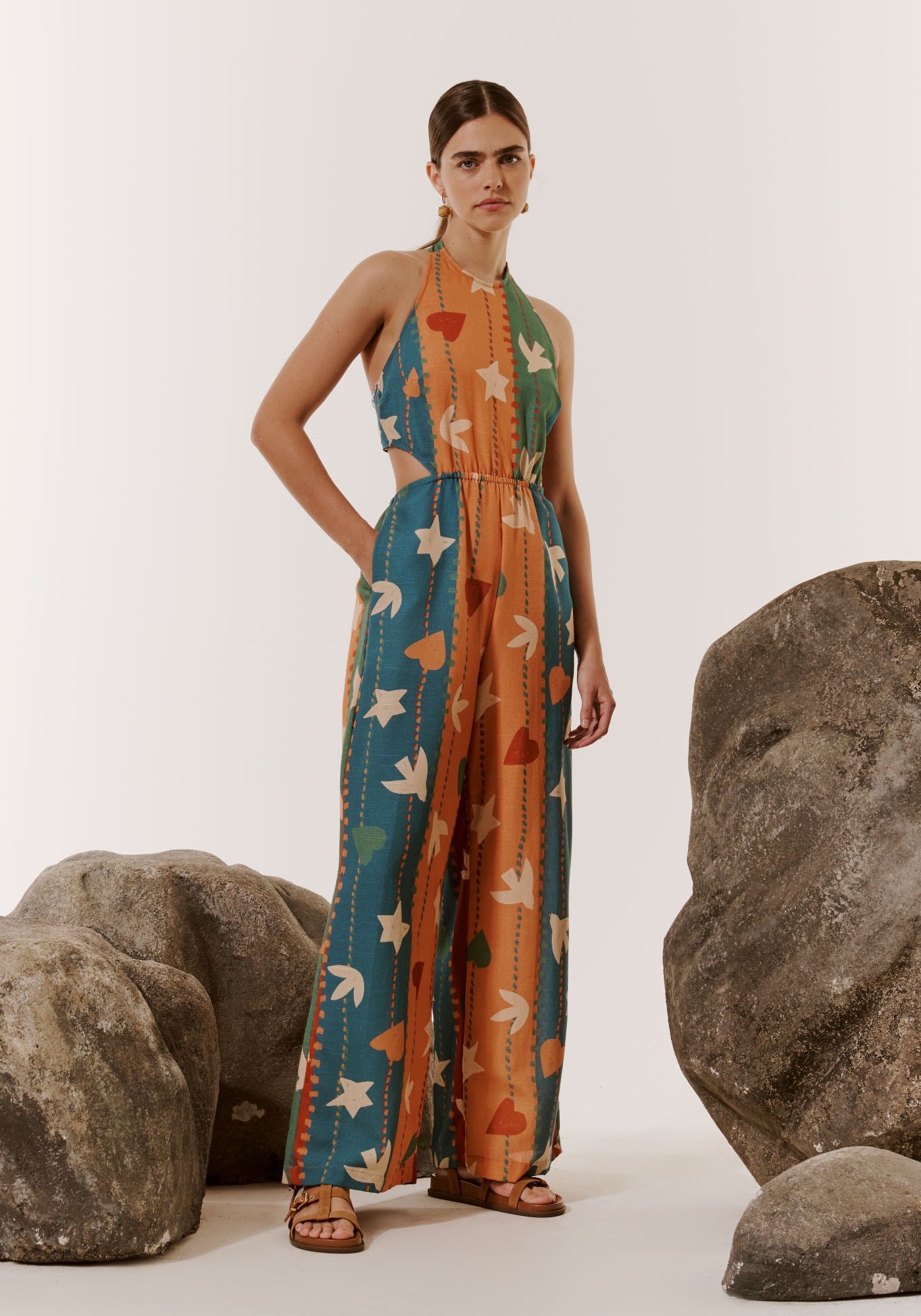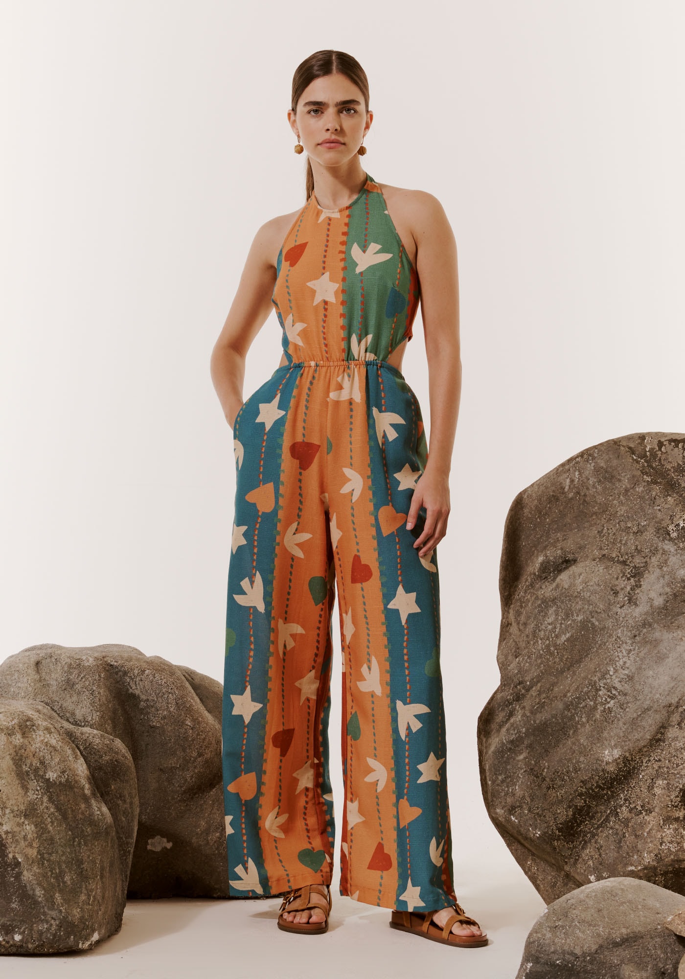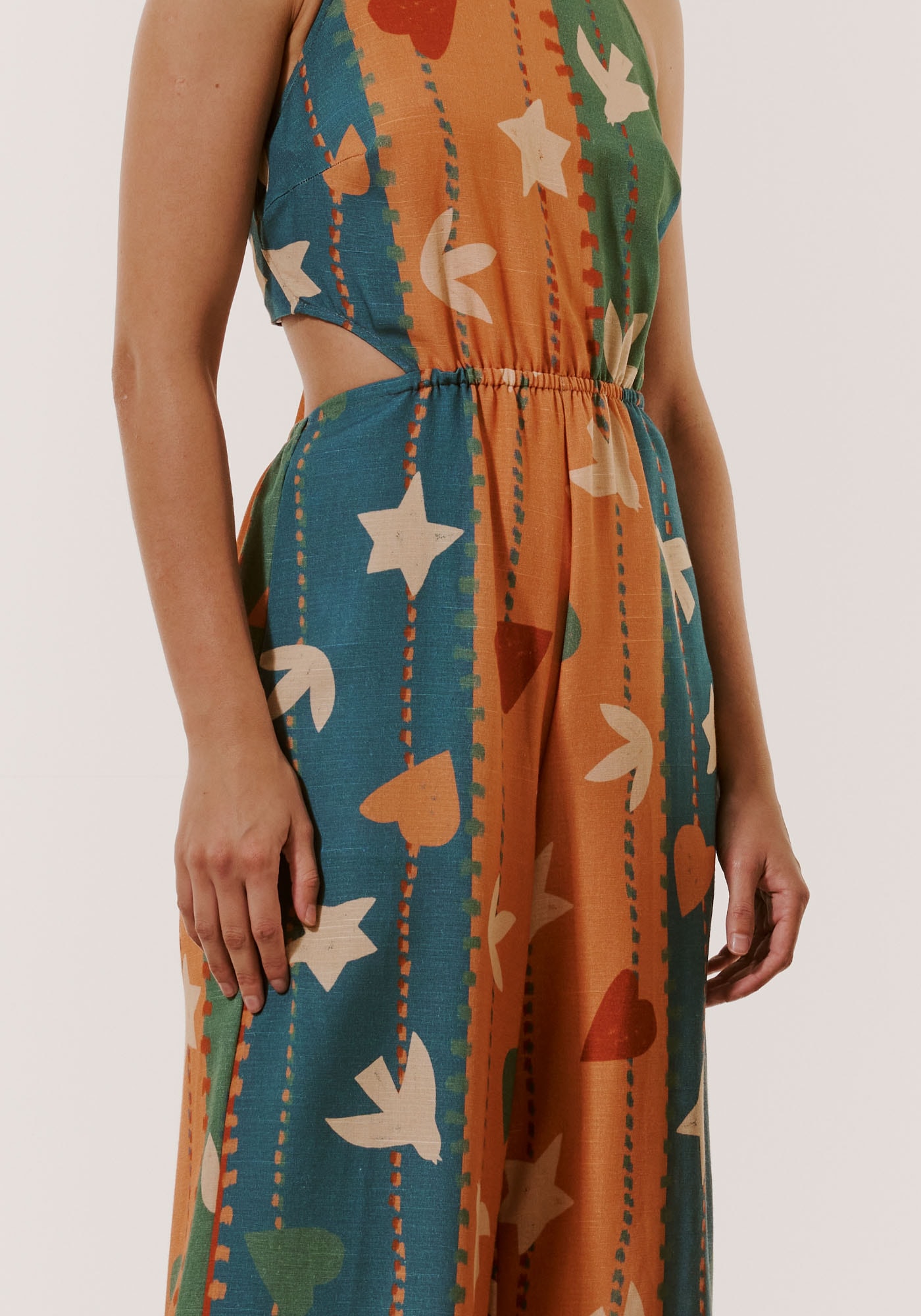 Confeccionado com tecido misto, 61%viscose 39% algodão, a modelagem possui decote alto sem manga, com recortelateral. O detalhe do elástico deixa a cintura mais marcada. Os bolsos lateraistornam o modelo prático.