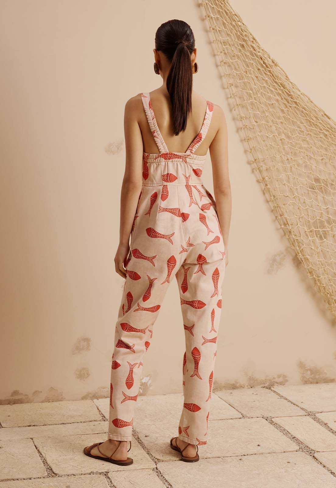 Feito em sarja leve de 100% algodão, o Macacão Sarja Estampado Manzuá da CaCay combina estrutura e fluidez com um toque artesanal. Seu design valoriza o corpo com caimento solto e elegante, ideal para diferentes biotipos e alturas como mostra a modelo, que veste tamanho P e tem 1,77m. A estampa exclusiva com elementos gráficos inspirados no universo marinho adiciona personalidade à peça, sem perder a sofisticação. É uma opção certeira para quem busca roupas femininas estilosas para o dia a dia, viagens ou eventos informais com toque criativo.