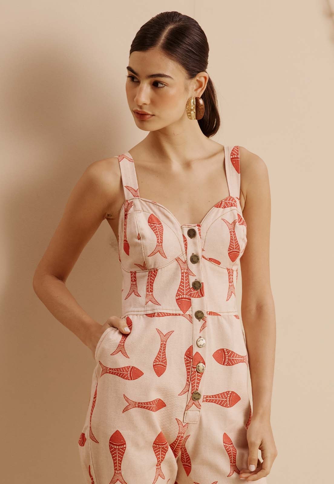 Com alças largas e fechamento frontal por botões, o macacão oferece praticidade e liberdade de movimento. Para compor o look, aposte em sandálias rasteiras, brincos marcantes ou uma bolsa de palha para realçar o mood descontraído. Seja para um passeio à beira-mar ou um encontro casual na cidade, essa peça é um convite ao vestir com autenticidade. Descubra o Macacão Sarja Estampado Manzuá da CaCay e leve para o seu guarda-roupa uma dose de leveza com design brasileiro.