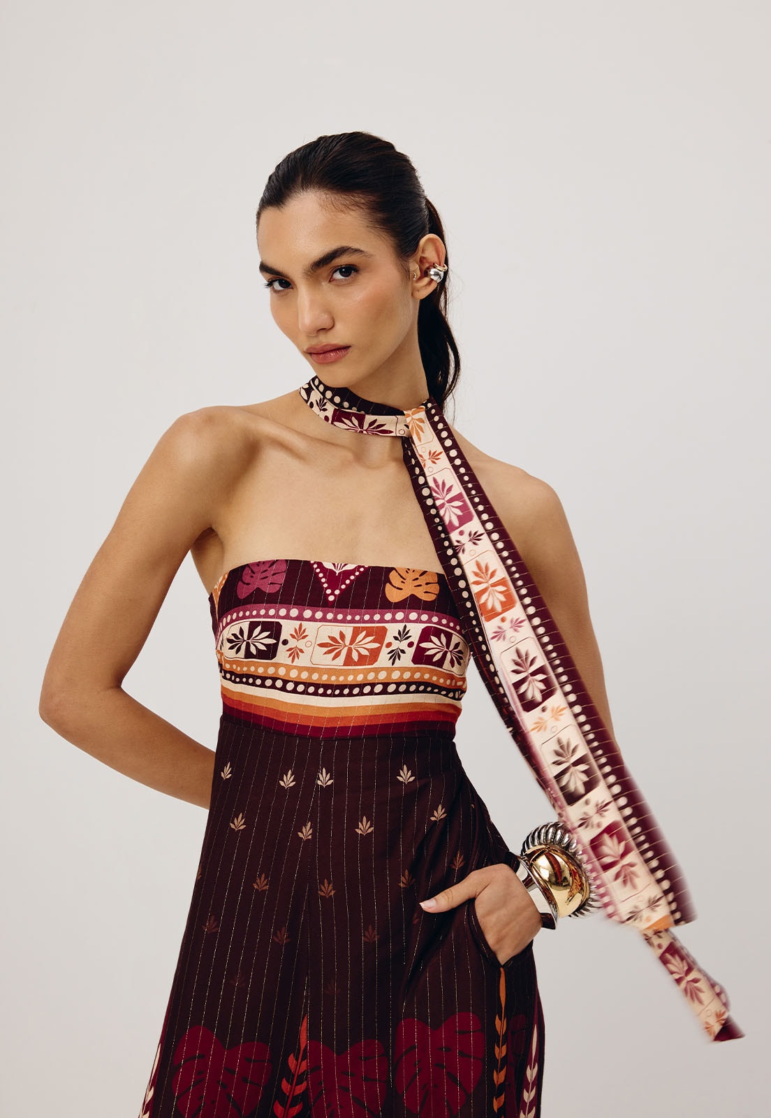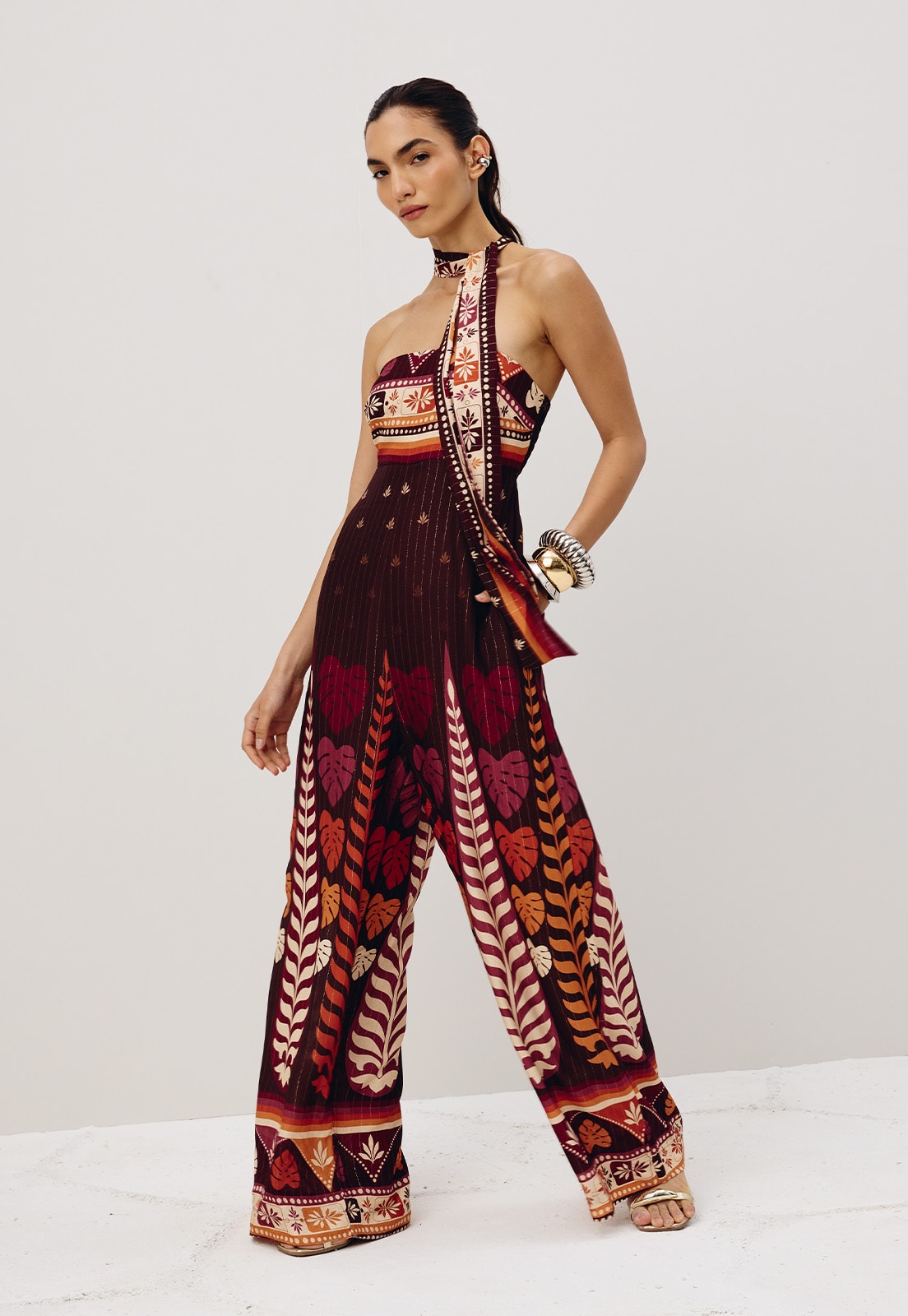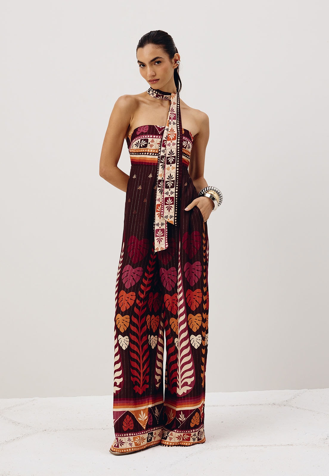 O macacão estampado Hera é confeccionado em tecido 99% viscose e 1% poliéster. É um modelo elegante sem alça, que possui lastex nas costas e um shape amplo com bolsos laterais. Possui como detalhe principal a faixa que pode ser amarrada de diferentes ao redor do pescoço.