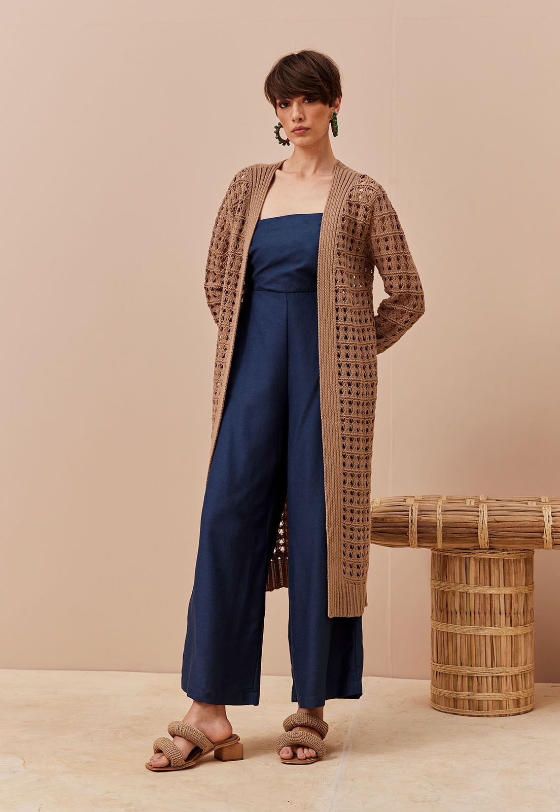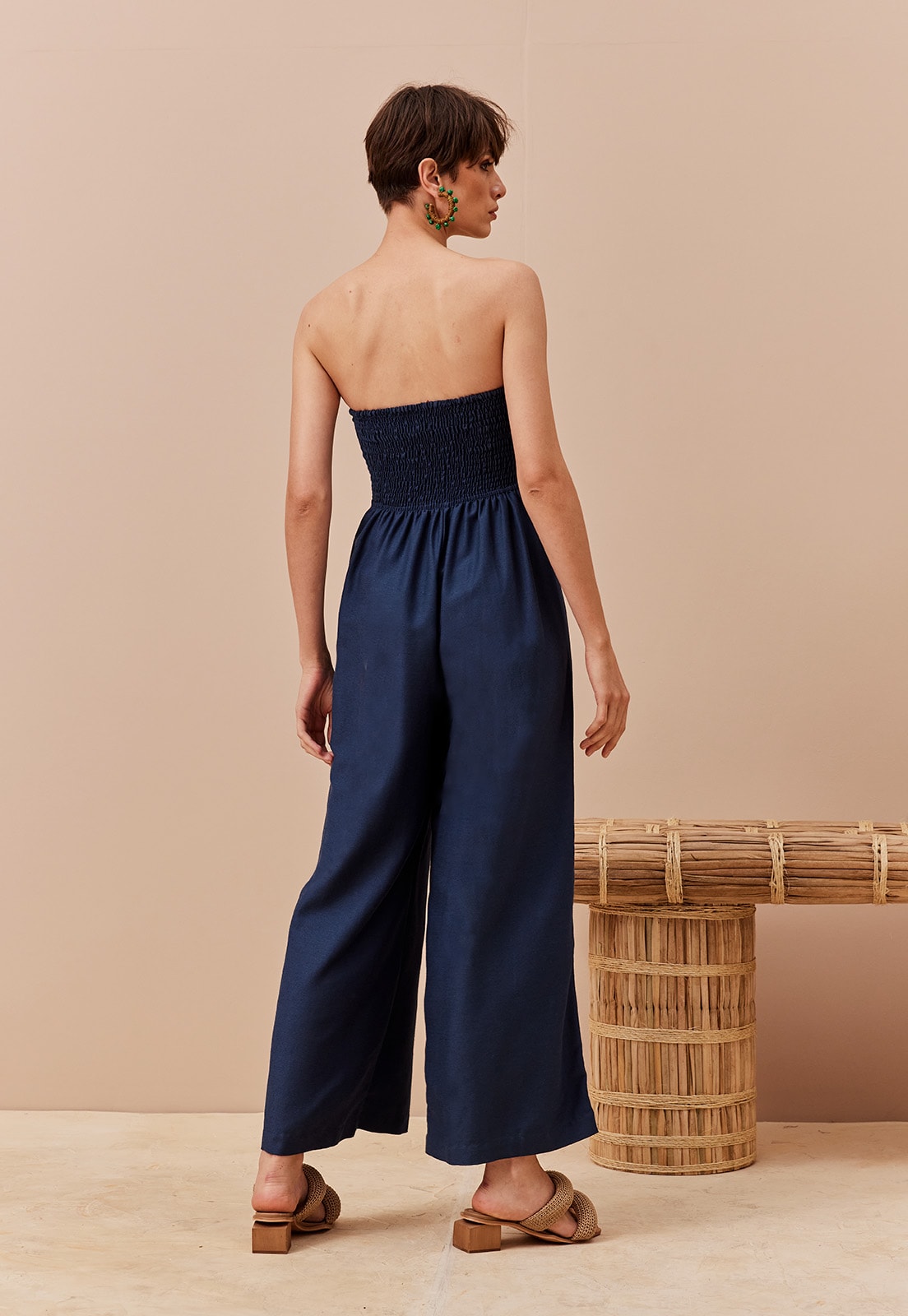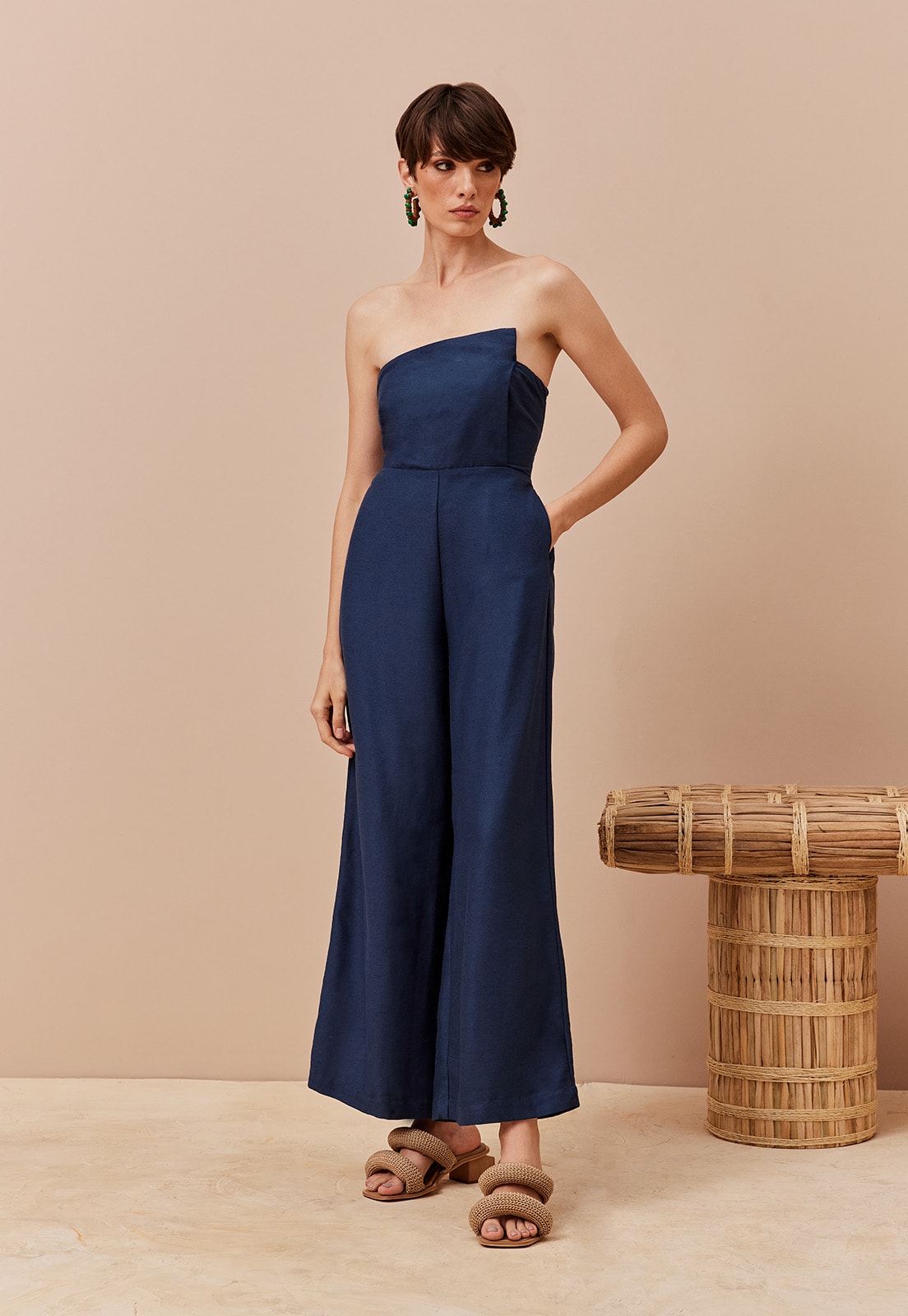 O macacão é confeccionado em tecido 50% algodão 29% viscose 15% modal e 6% linho. É um modelo tomara que caia sofisticado e elegante, que contém desenho belíssimo com a parte da frente assimétrica. Possui bolsos laterais e lastex nas costas, facilitando a vestibilidade da peça.