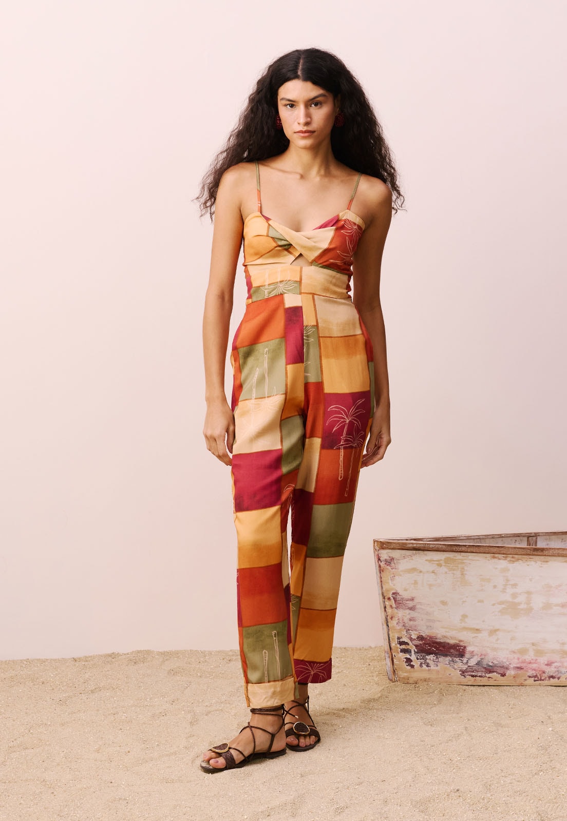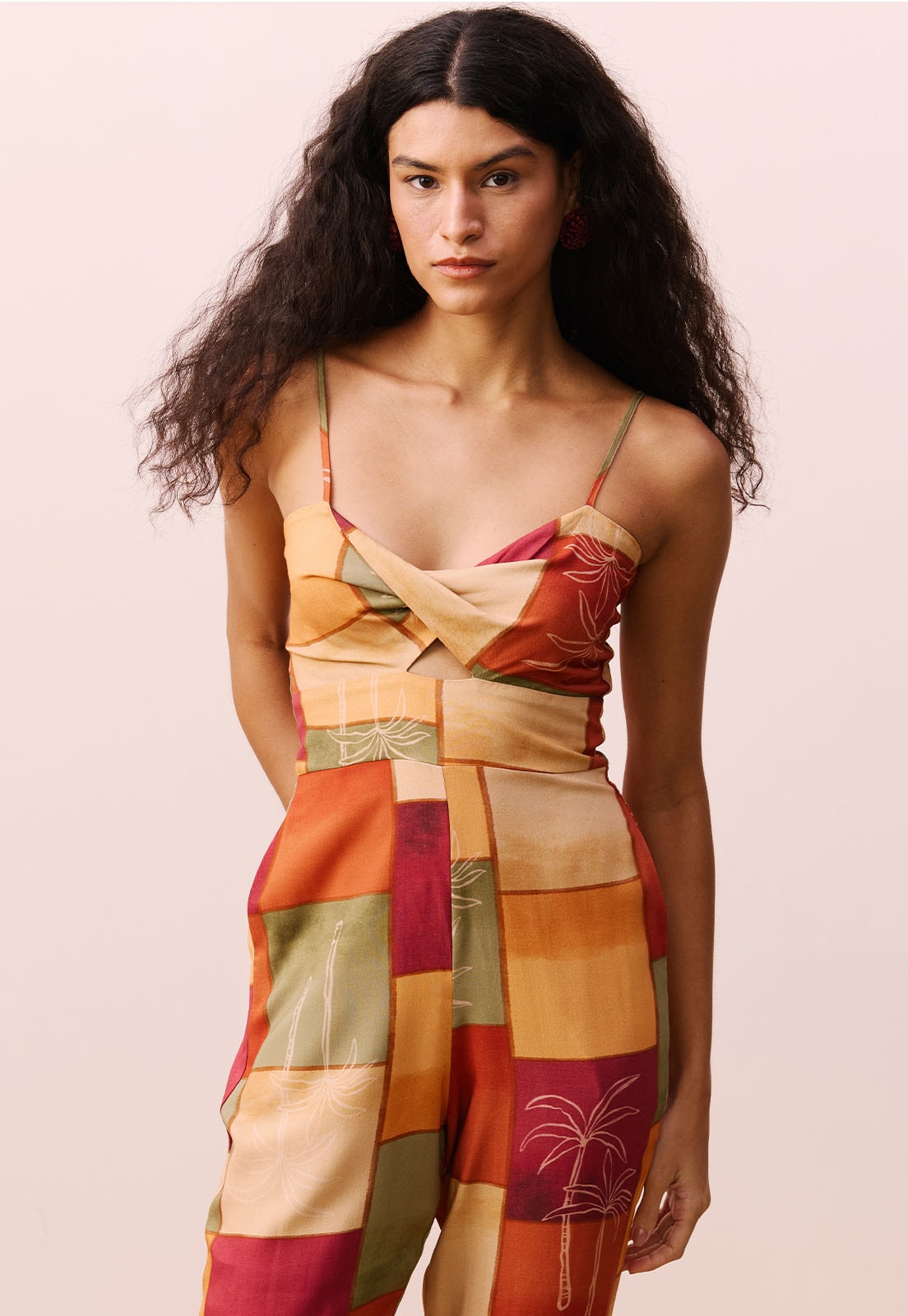 O Macacão Torção Busto Estampado Encontro das Águas da CaCay é a expressão perfeita de leveza e sofisticação para quem busca estilo com conforto. Confeccionado em 100% viscose, seu caimento fluido valoriza a silhueta com naturalidade, enquanto o decote em V cruzado e a torção no busto criam um ponto focal elegante e moderno. A estampa em blocos geométricos com elementos tropicais sutis remete à fluidez das águas e ao encontro de paisagens vibrantes, tornando a peça ideal para ocasiões que pedem frescor e personalidade de almoços ao ar livre a eventos casuais com toque criativo.