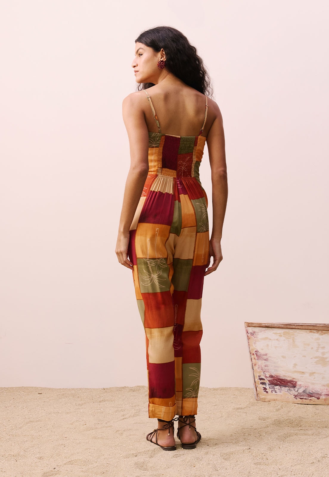 Com alças finas ajustáveis e cintura marcada por elástico confortável, o macacão oferece liberdade de movimento e ajuste perfeito ao corpo. As pernas retas com acabamento dobrado nos tornozelos adicionam um charme descomplicado, fácil de combinar com sandálias de tiras, rasteiras minimalistas ou até uma clutch artesanal para compor um look versátil e atemporal.