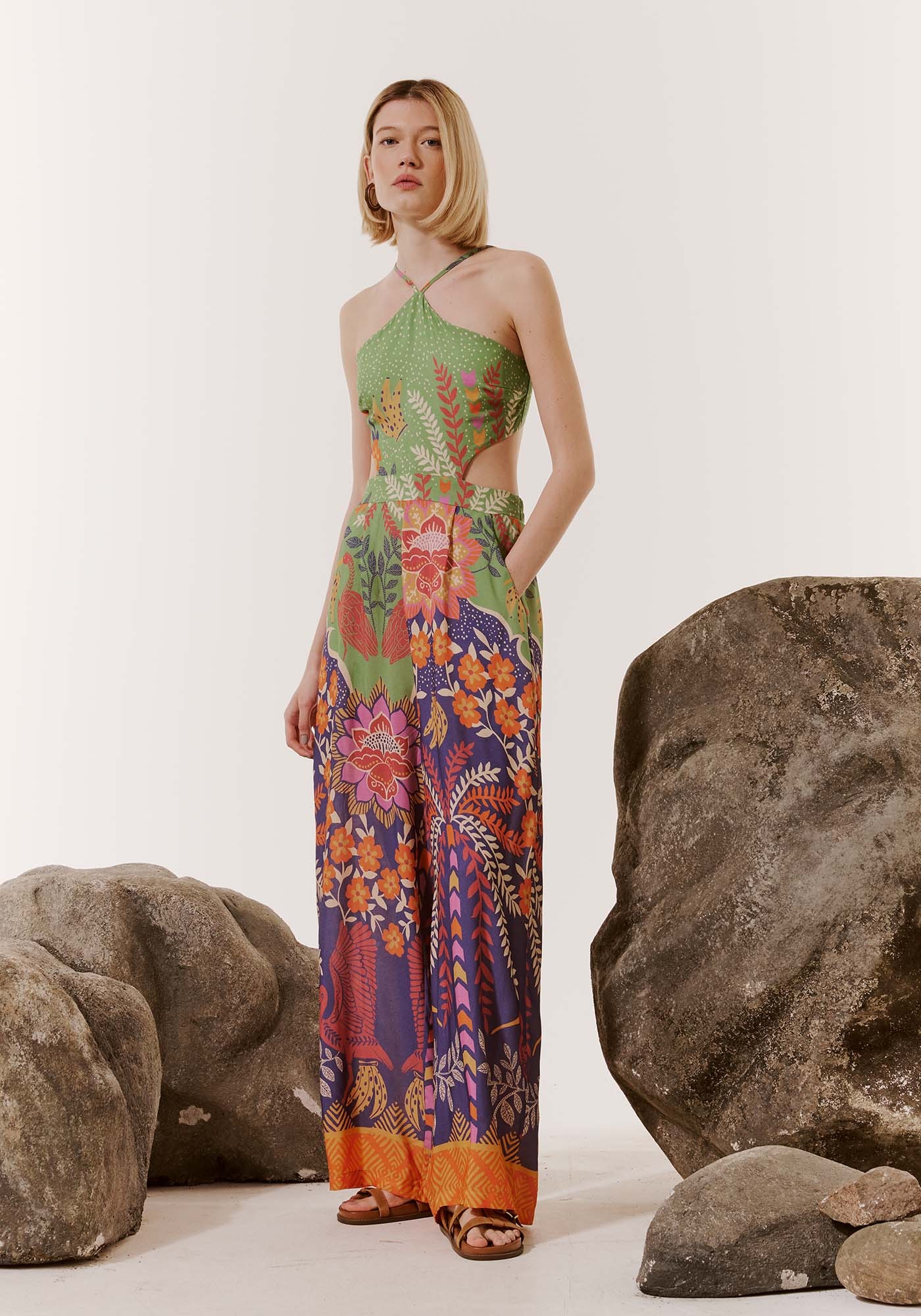 Encante-se como nosso MacacãoVazado Alça Fina Estampado Copaíba. Confeccionado em tecido 100% viscose, sua calça tem modelagem ampla e fluida,trazendo um caimento elegante e leve e que proporciona liberdade de movimento.Possui recortes na lateral que trazem mais modernidade e ousadia à peça, enquantoseu decote frente única e alças finas destacam o colo de forma sofisticada.Este apresenta a estampa Copaíba, que traz um toque tropical ao seu visual.Possui amarração na parte das costas.