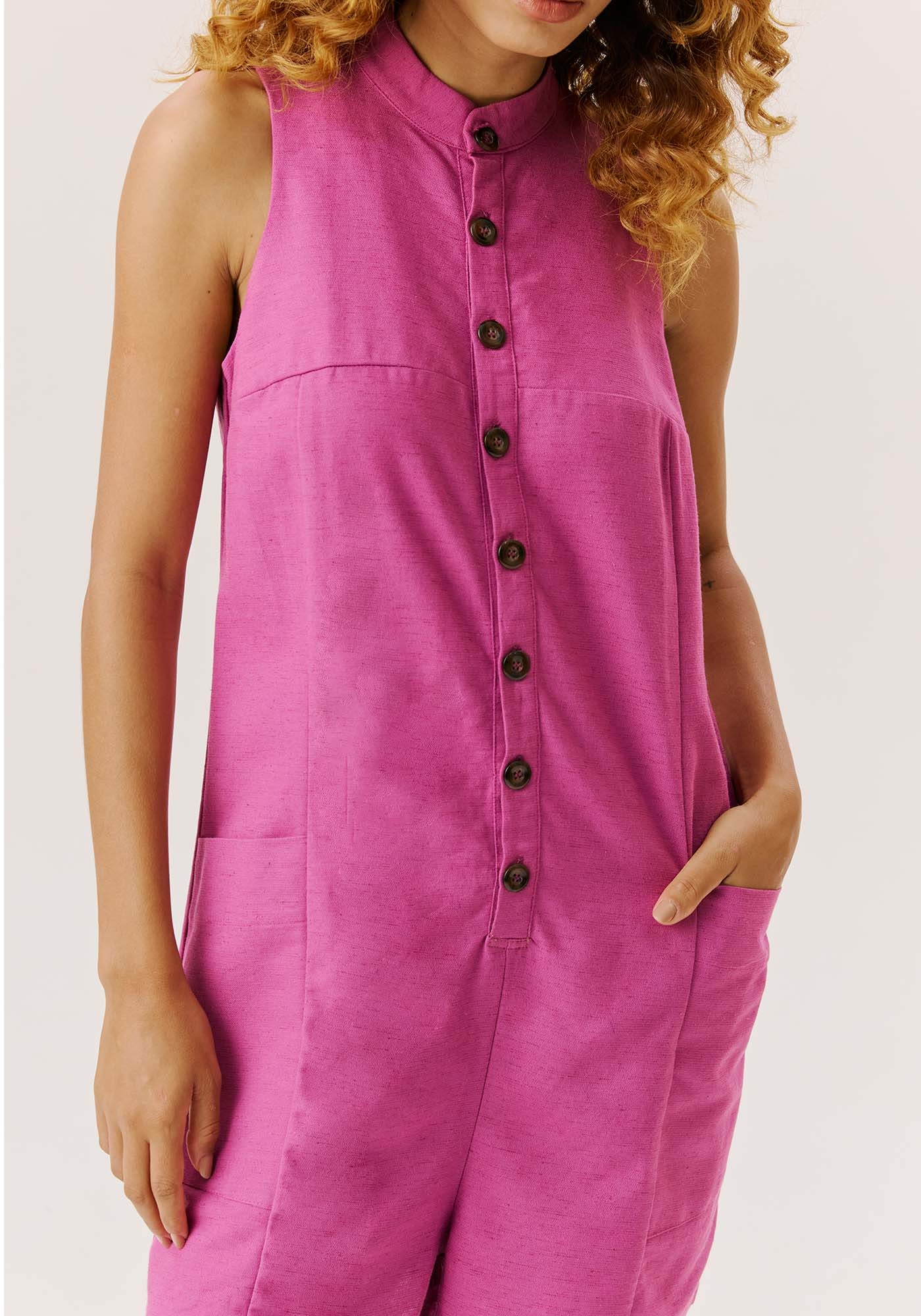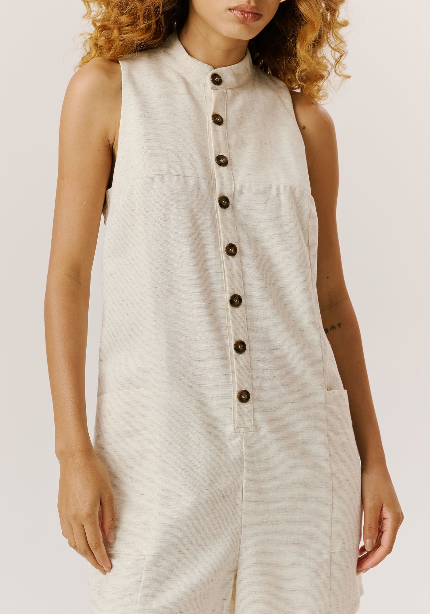 O macaquinho é uma peça versátil, que pode ser usado emdiferentes ocasiões. Confeccionado em tecido 42% algodão 38% viscose 14% modal 6% linho, possui abotoamento frontale golinha alta, com modelagem sem manga. Os bolsos lateraisdeixam a peça prática e confortável.