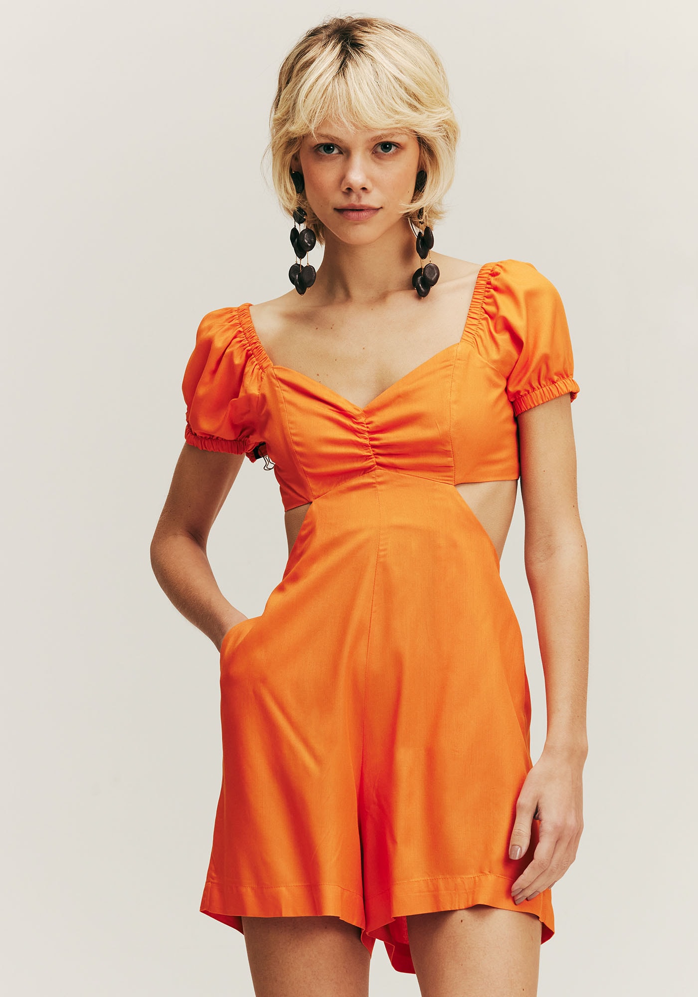 Estiloso e moderno, o macaquinho é a peçaperfeita para os dias mais quentes. É confeccionado com manguinha curta bufantee decote ajustado com detalhe franzido que valoriza o busto. Os recorteslaterais dão um toque sensual para a peça e os bolsos a deixam mais pratica. Ascostas possuem abertura, onde o lastex e o elástico facilitam a vestimenta.