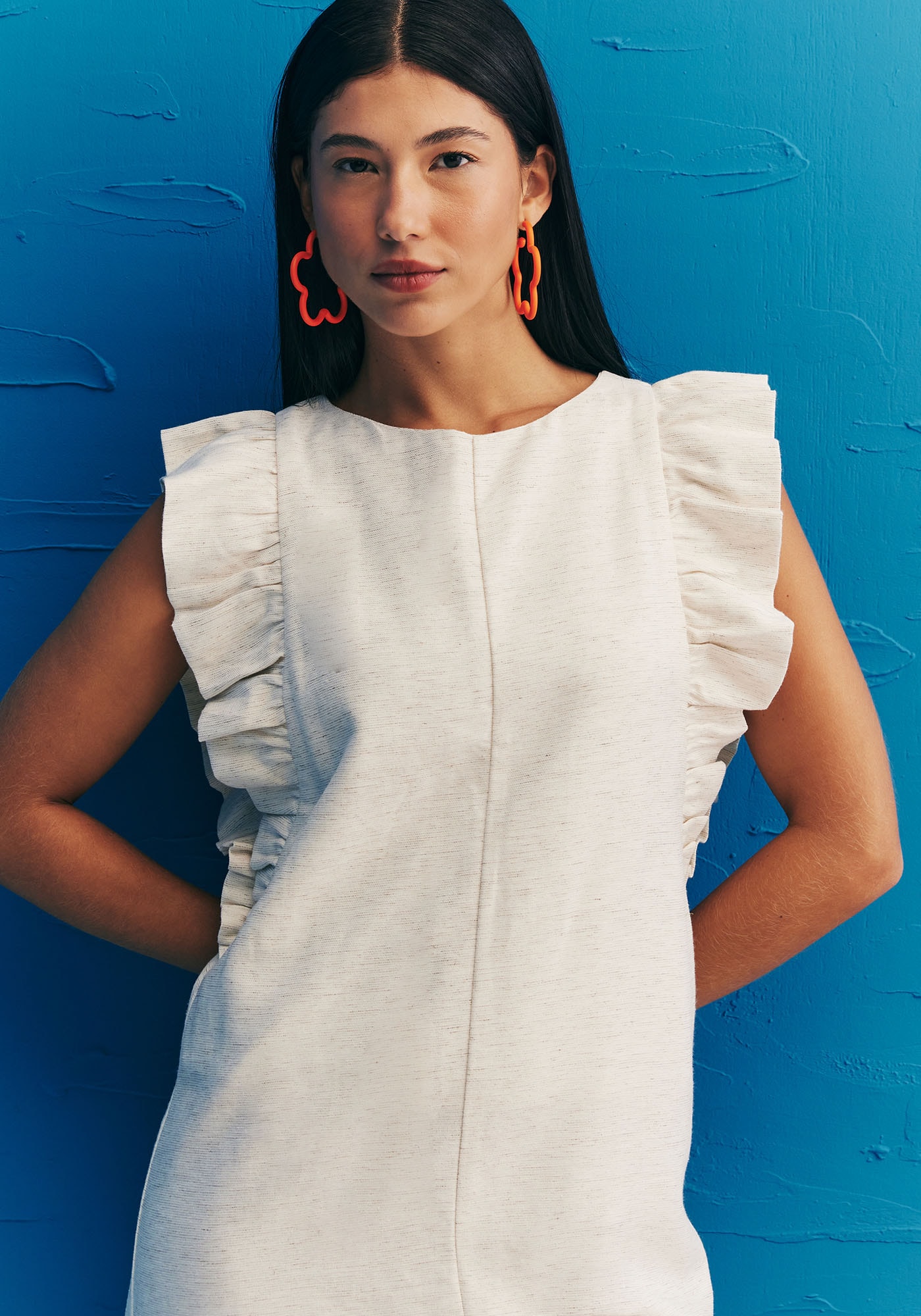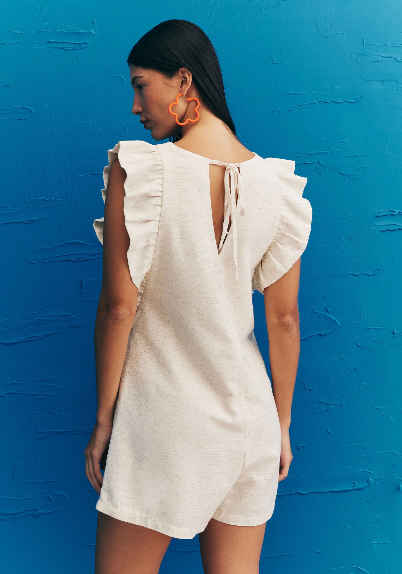 Confeccionado em tecido 50%algodão 29% viscose 15% modal e 6% linho, o macaquinho é uma peça sofisticada econfortável para o verão. O modelo possui babado na manga, dando um toque charmosoe bonito. A parte de trás contém uma amarração é finalizada com amarração.