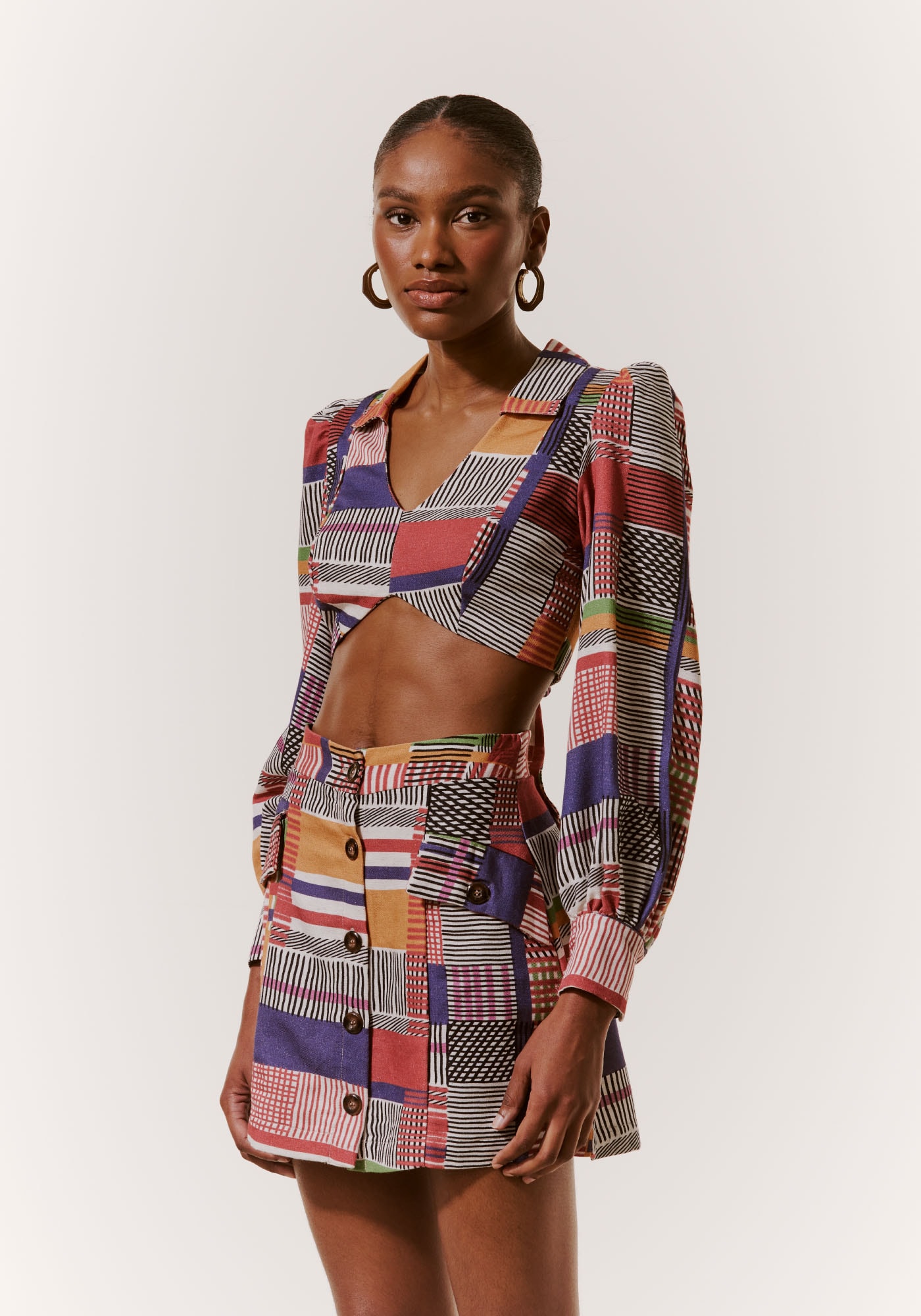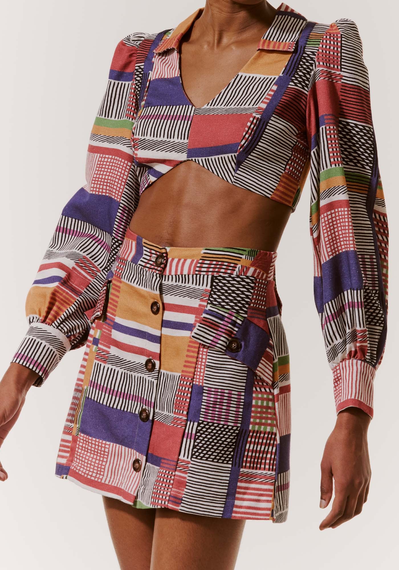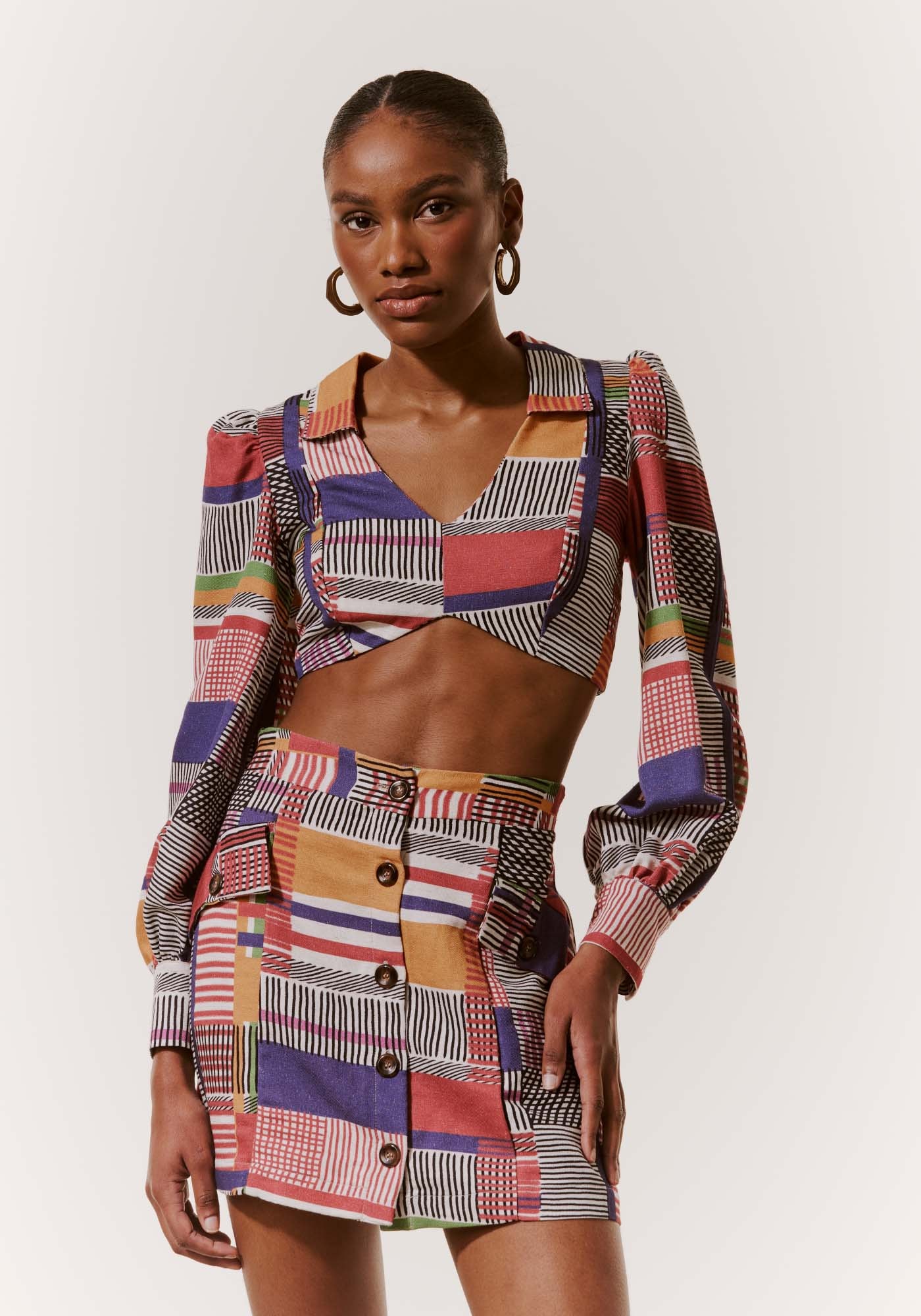 A mini saia é uma peça super estilosa. A estampa Ingá ésinônimo de estilo e modernidade com suas cores e formas geométricas.
