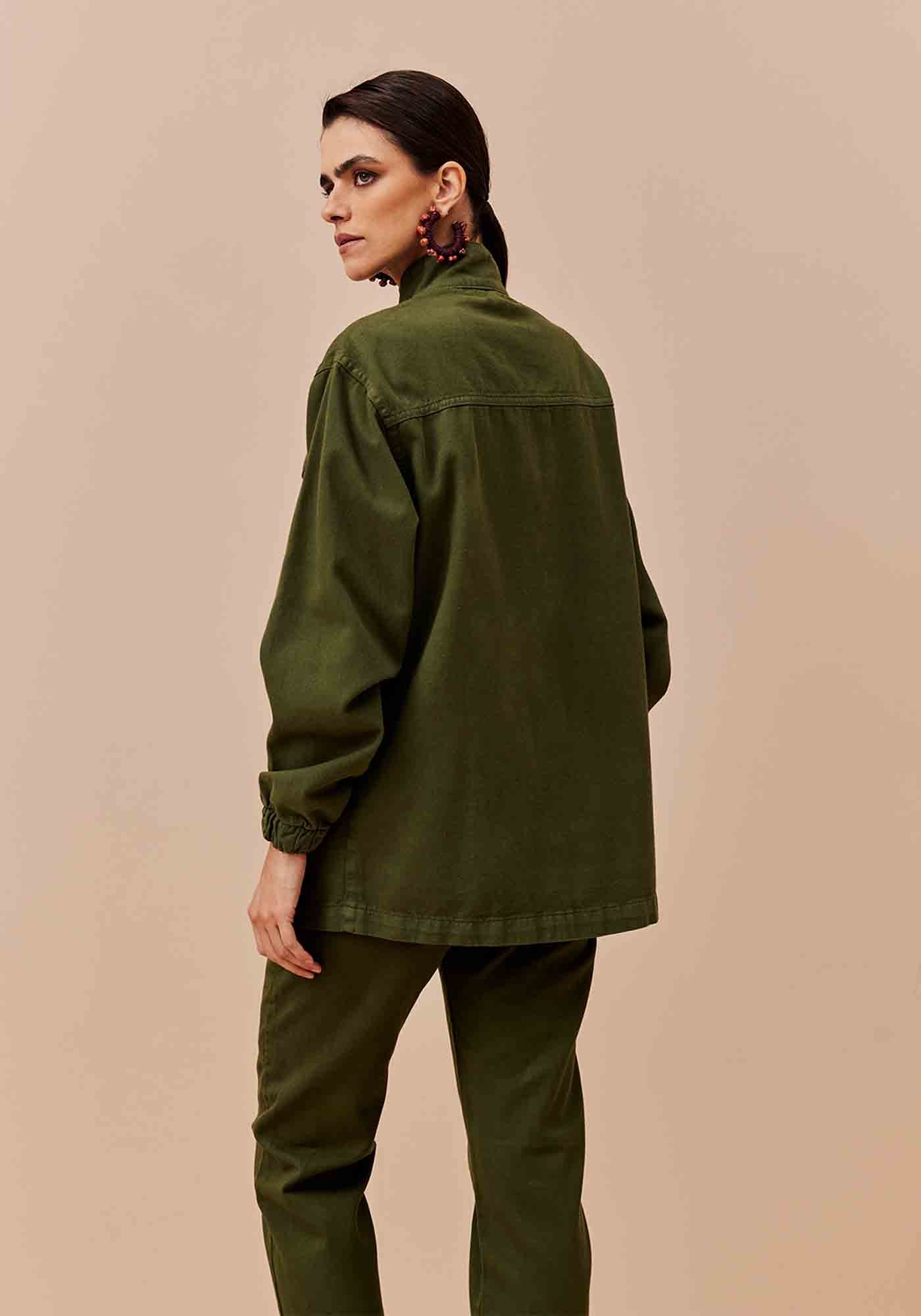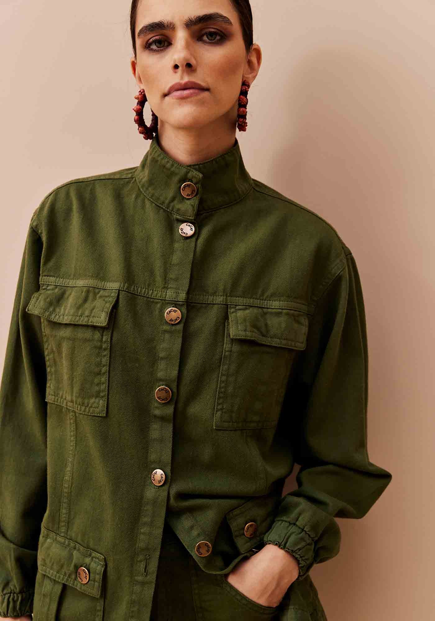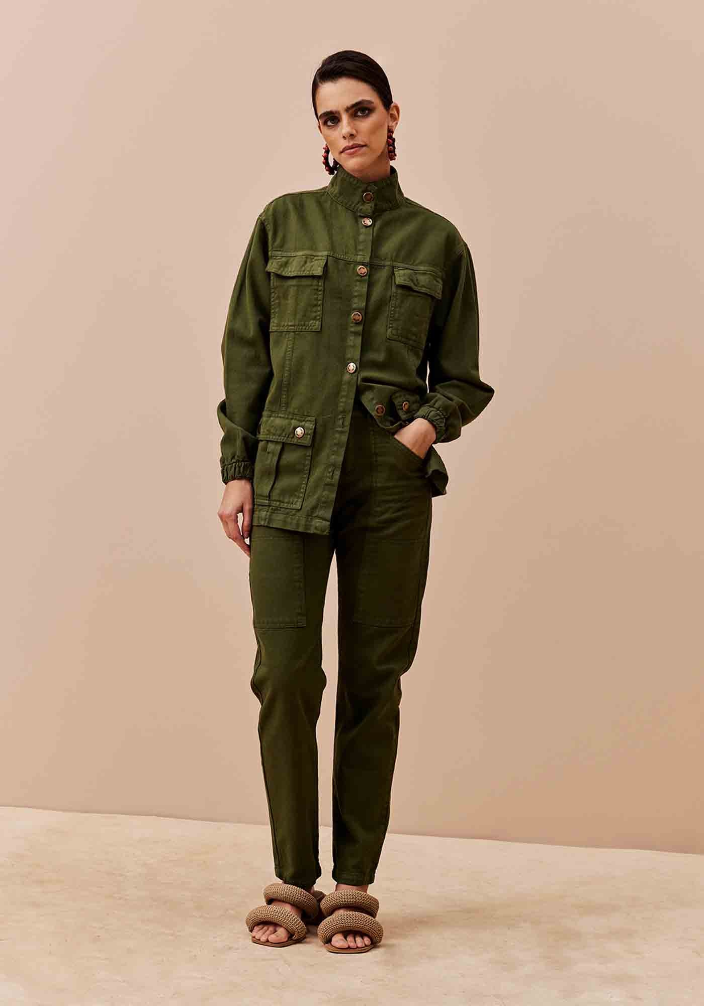 A parkacom estilo utilitário é um modelo urbano e moderno. Confeccionada em sarja 100% algodão, possui shape alongado com gola e fechamento frontal com botões de metal. Possui quatro bolsos grandes, que deixam a peça prática e estilosa.