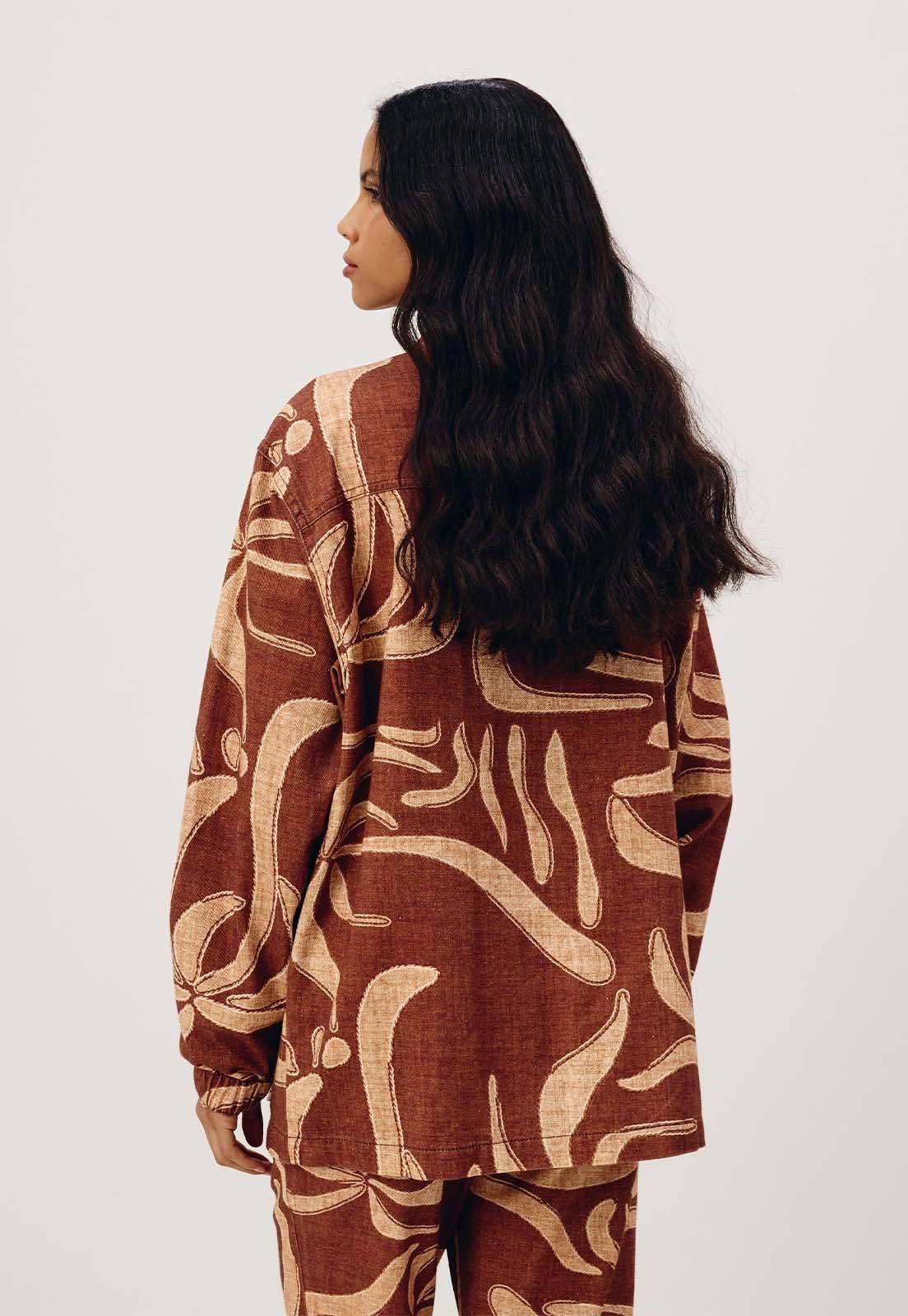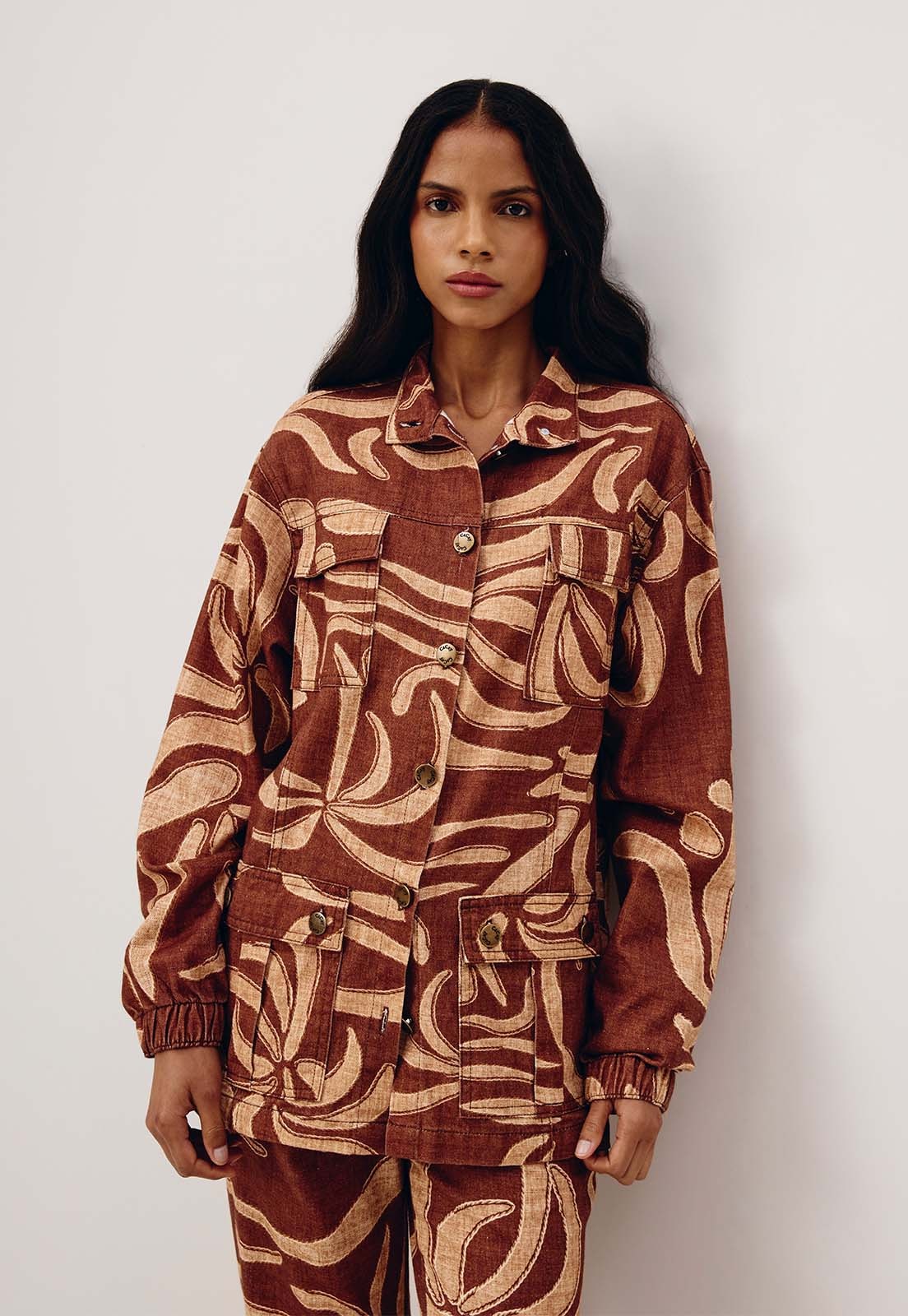 A Parka estampada Yucca é confeccionada em sarja 100% algodão. É um modelo que se destaca pelos bolsos grandes na parte da frente. Possui fechamento em botão e elástico na manga.
