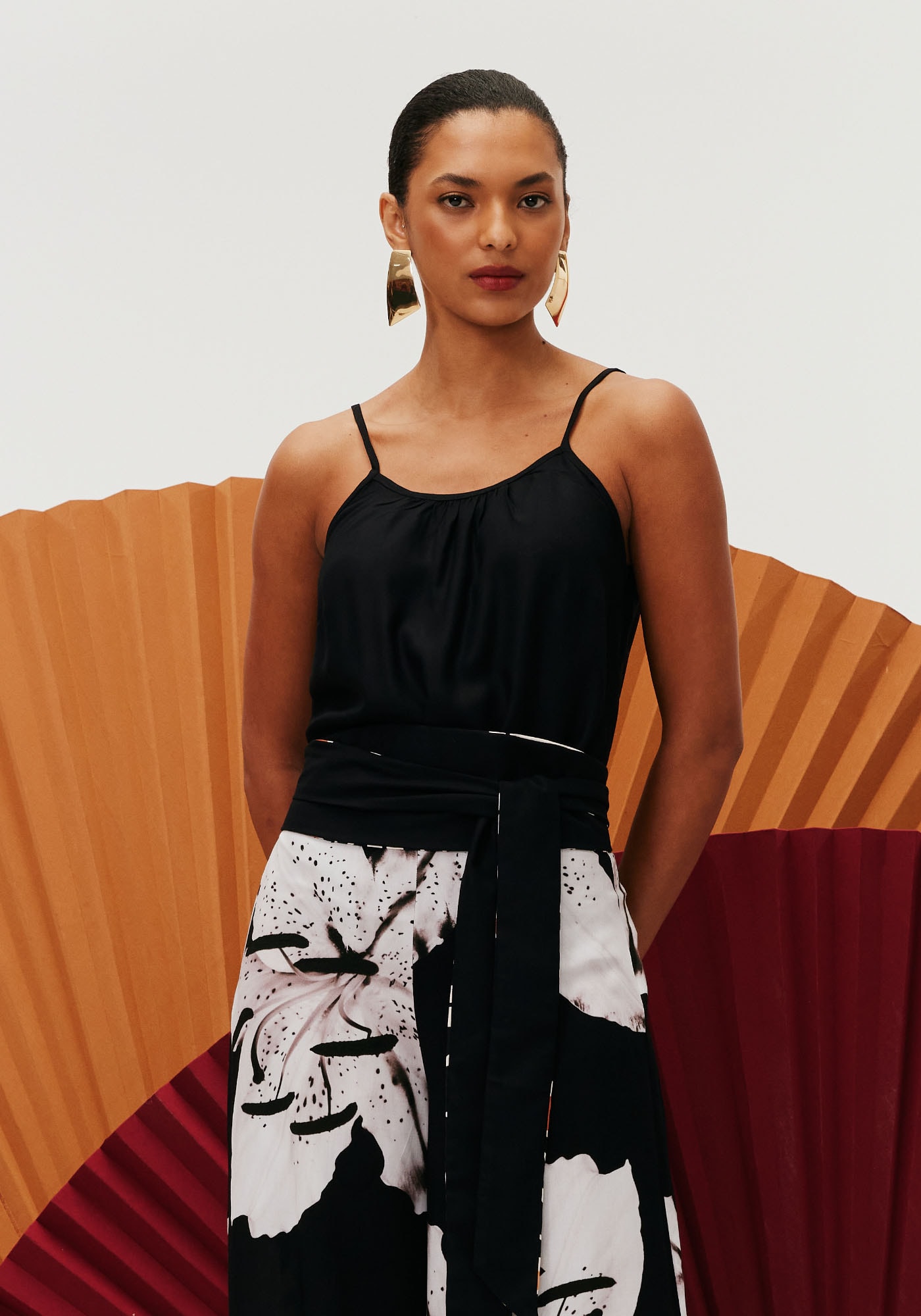 Confeccionado em tecido 100% viscose,a regata de alça fina é uma peça básica, que pode ser usada em diferentes lookspara montar uma composição.