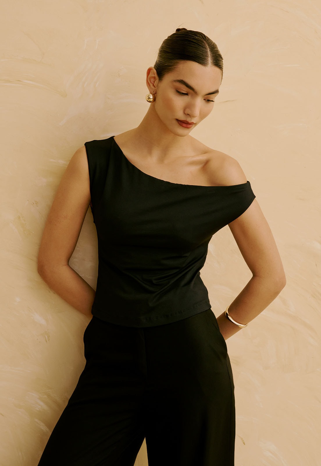 Confeccionada em poliamida com elastano, a regata possui elasticidade moderada que garante conforto prolongado e liberdade de movimento, ideal para o dia a dia, trabalho ou eventos casuais. O tecido é leve, pensado para uso versátil e sofisticado. Combine com calças de alfaiataria, saias fluidas ou acessórios minimalistas para criar composições que transitam entre o casual e o elegante.
