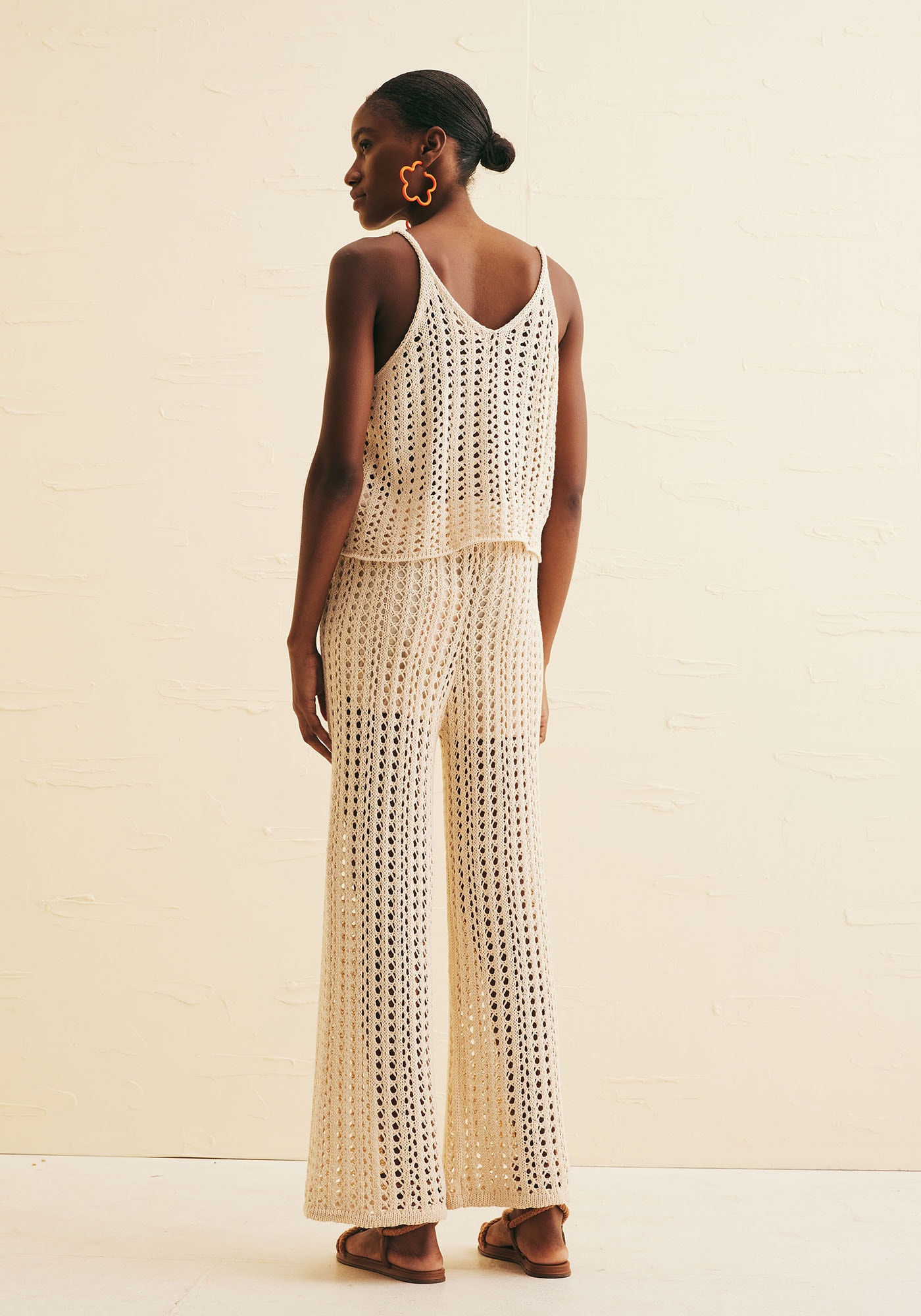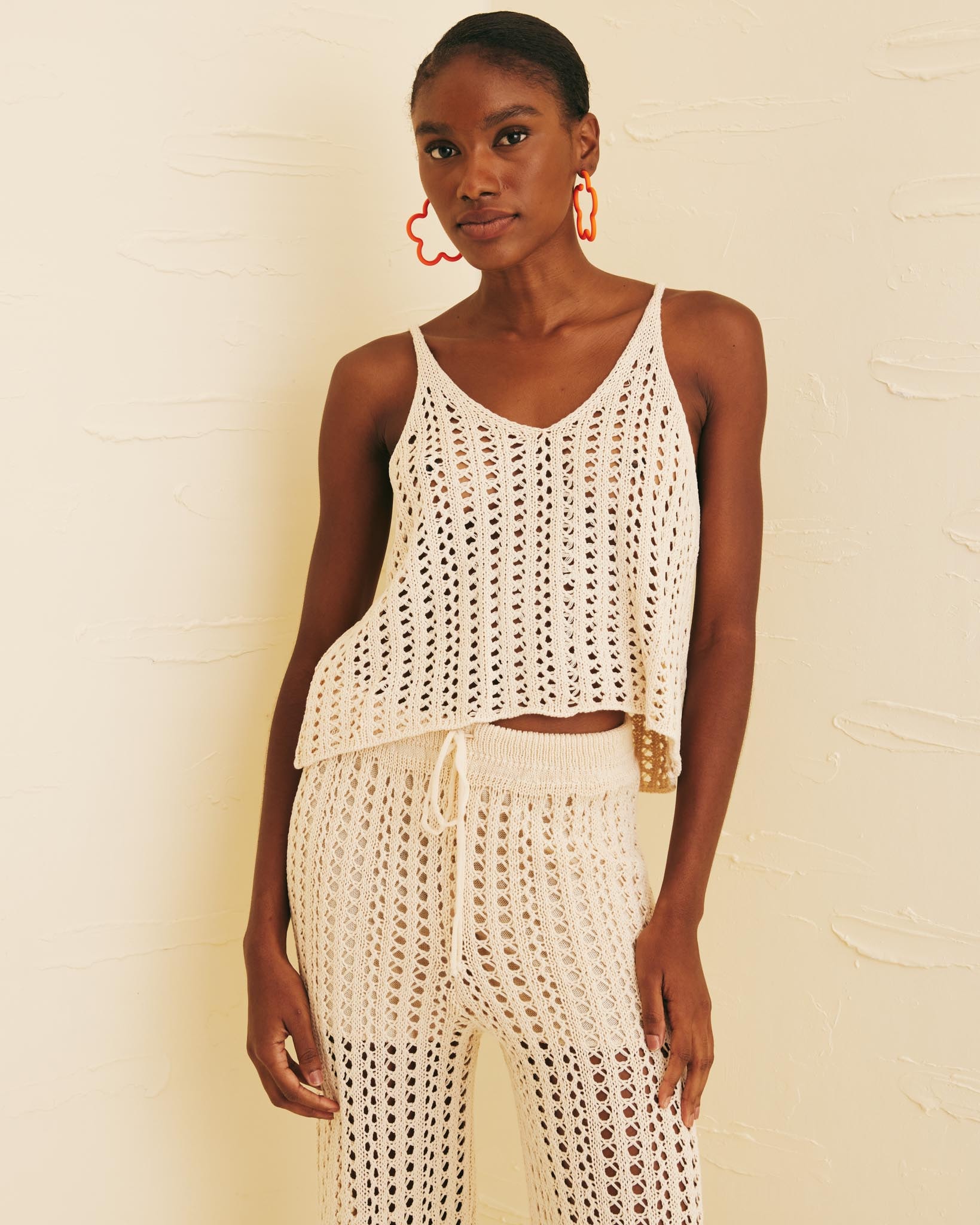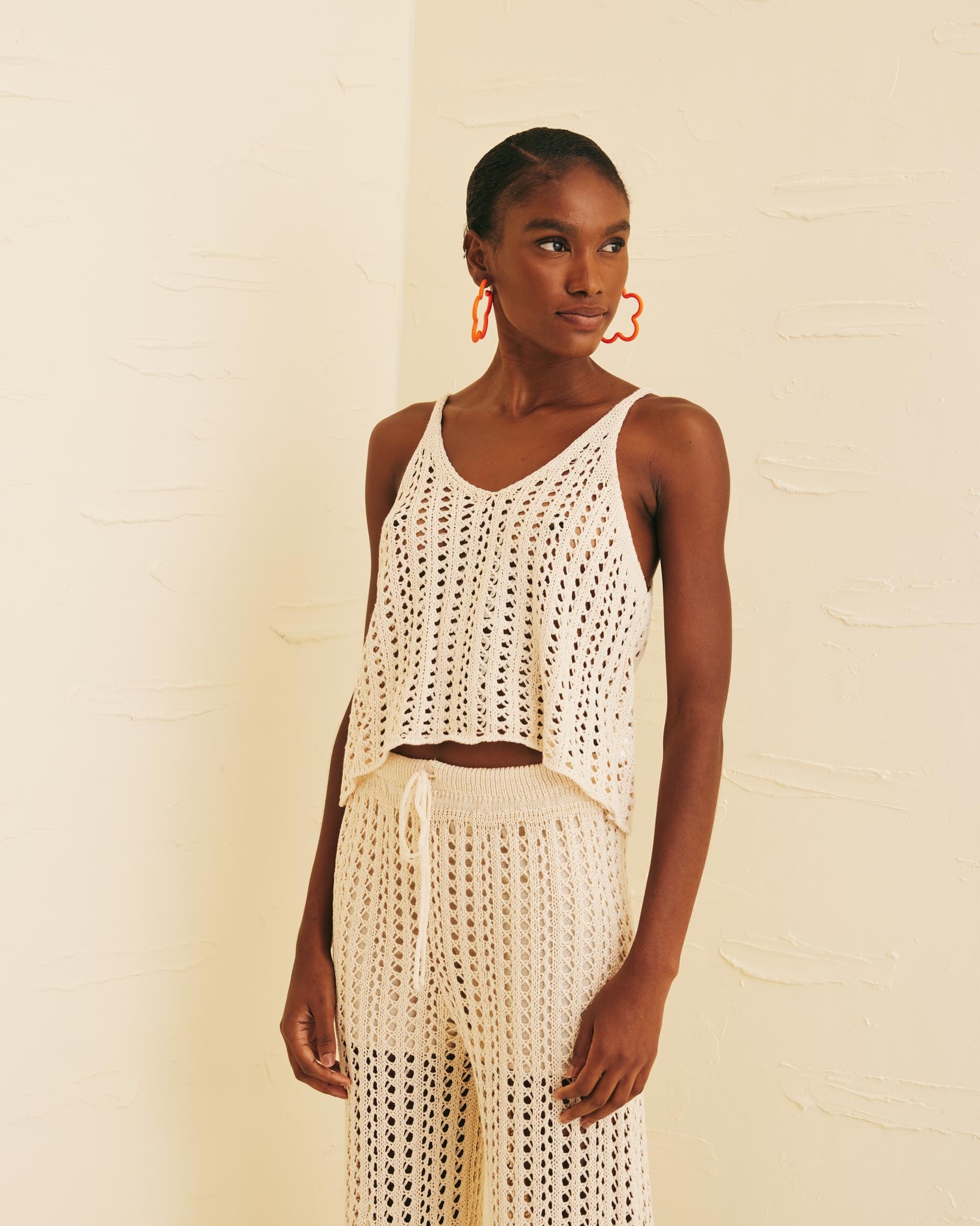 Estaregata em tricot no estilo crochê é uma peça versátil, moderna e cheia deestilo. Com sua modelagem solta e alças finas, ela proporciona frescor e elegâncianos dias de verão. Ideal para compor looks leves e modernos, a regata possuidecote em V tanto frontal como nas costas que valoriza a região do colo.