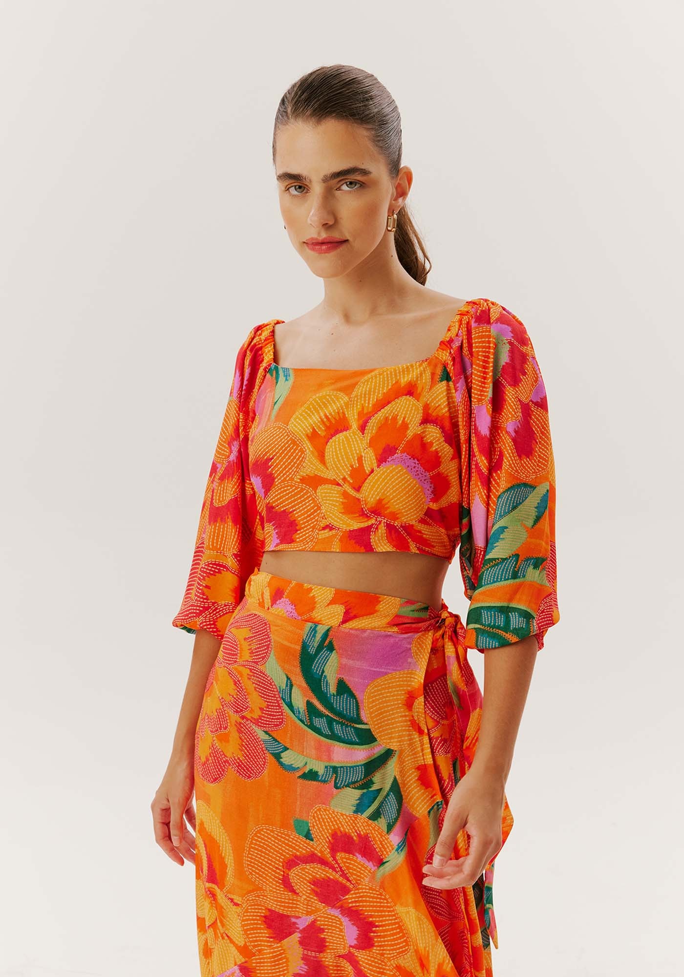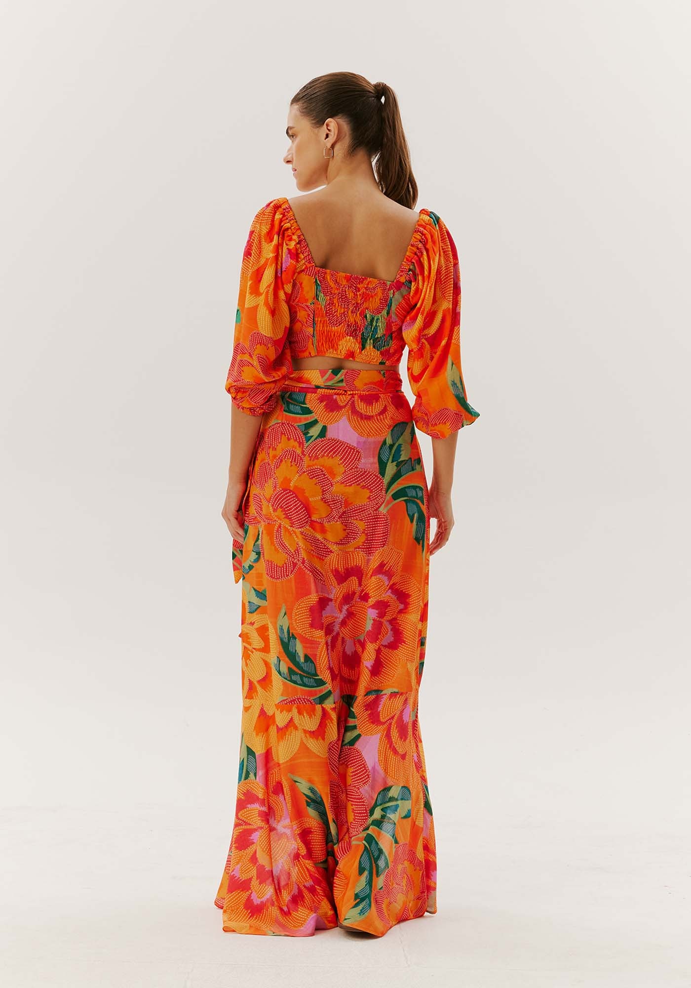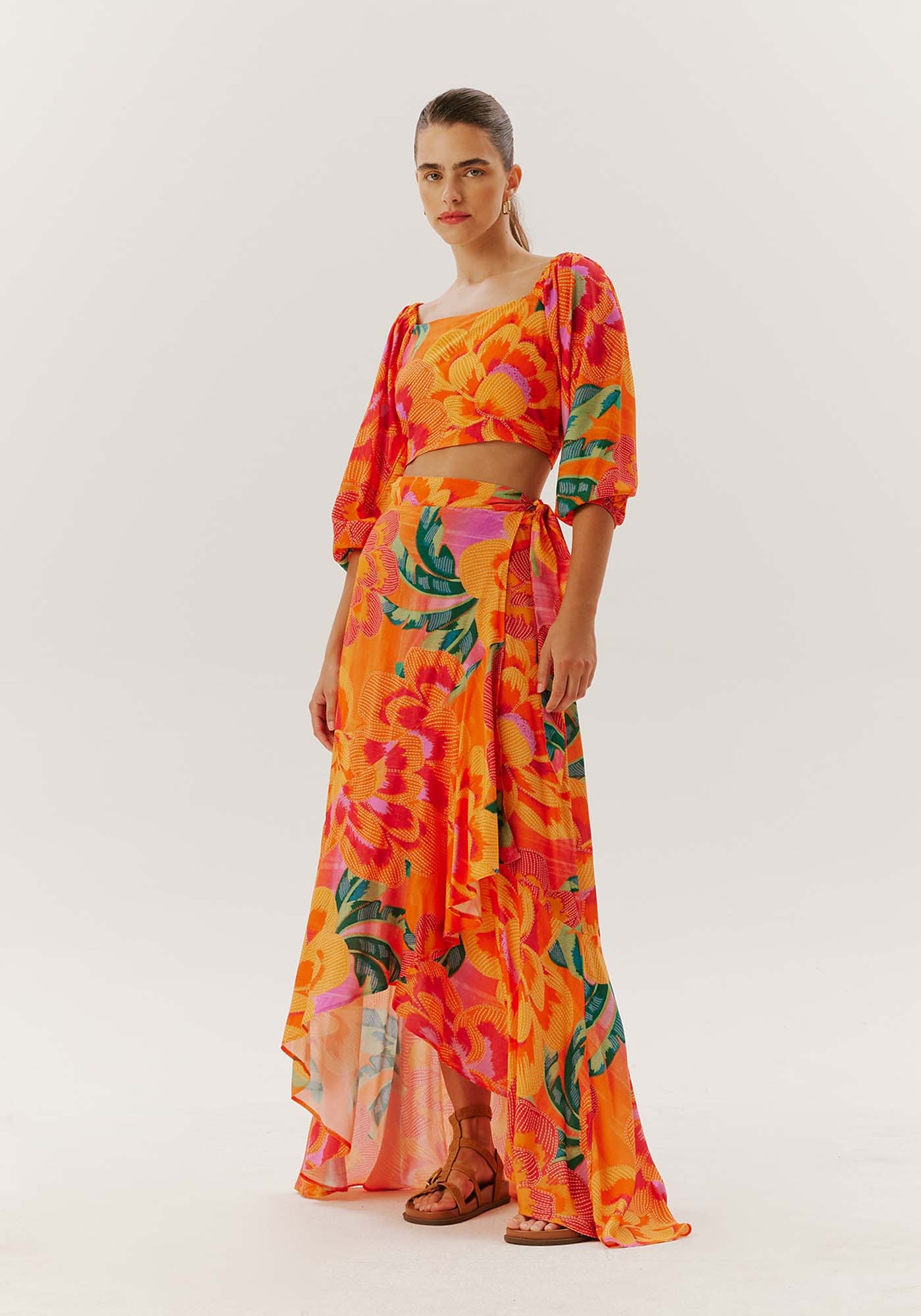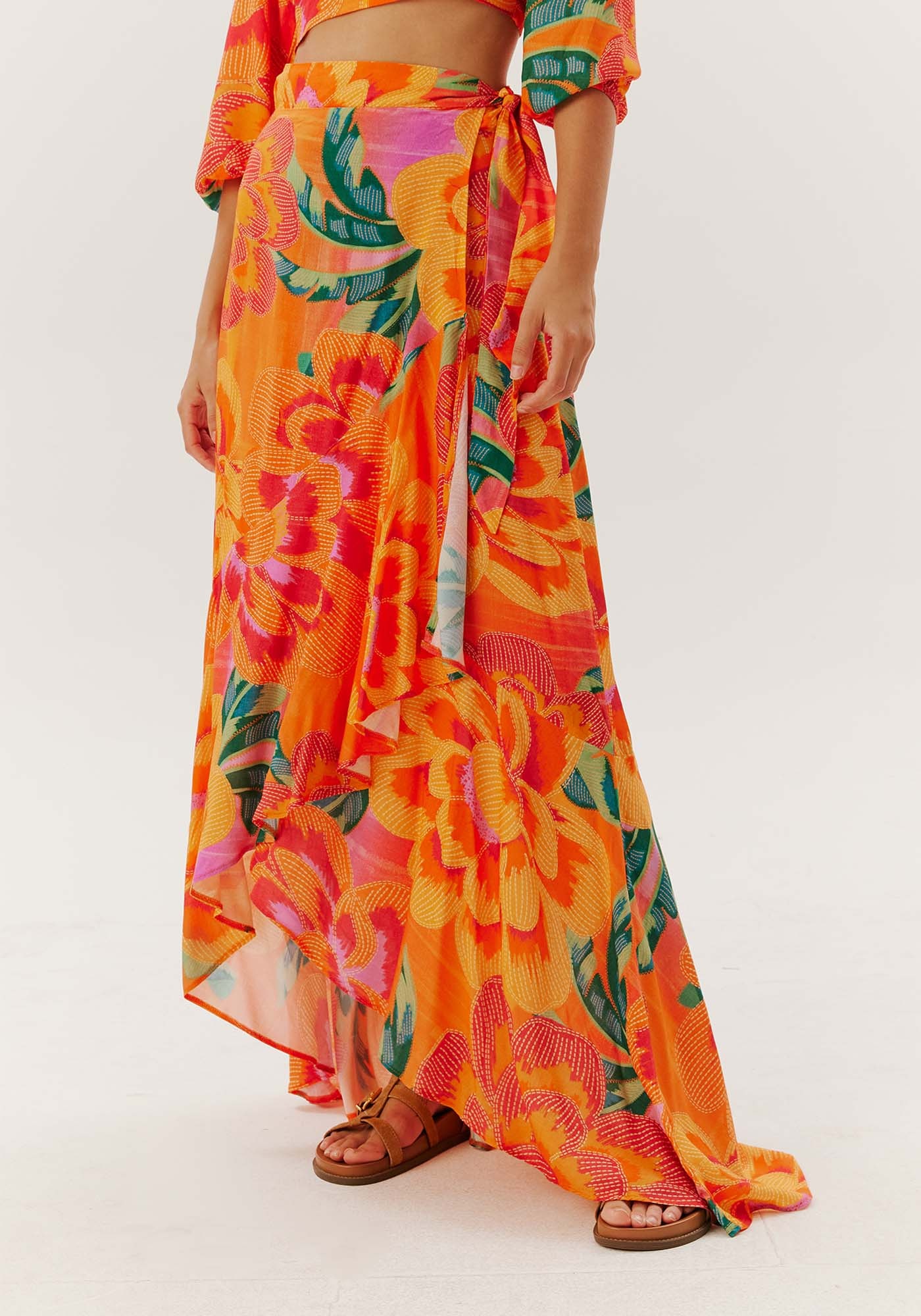 A saia longa é uma opçãoestilosa para o verão.Confeccionada em viscose, omodelo transpassado com amarração lateral deixa a peça mais bonita por conta da fenda lateral. Odetalhe da maria adicionada à barra deixa a saia mais fluída.