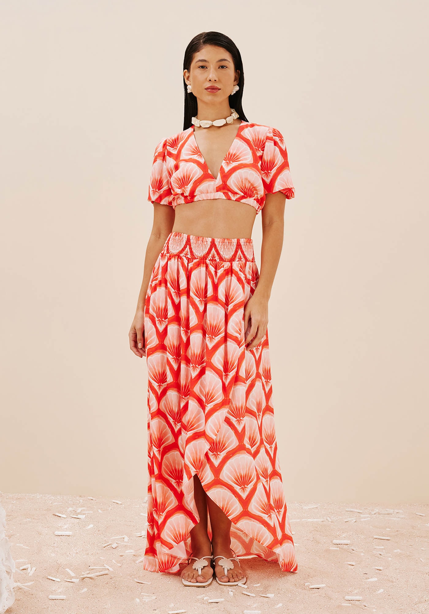 A saia estampada Pink Beach éconfeccionada em tecido 100% viscose. O modelo possui pala em lastex e aberturafrontal transpassada, que deixa o modelo fluído e com movimento. A saia éperfeita para o verão e fica belíssima combinada com outras peças da coleção.