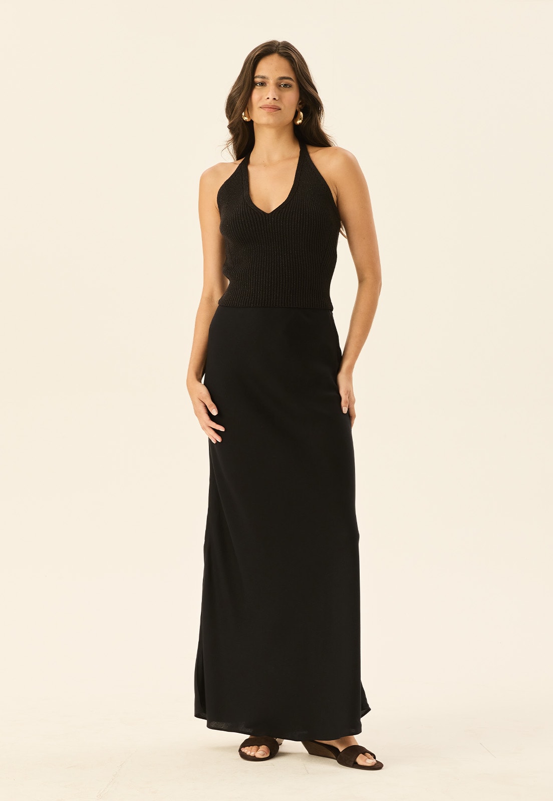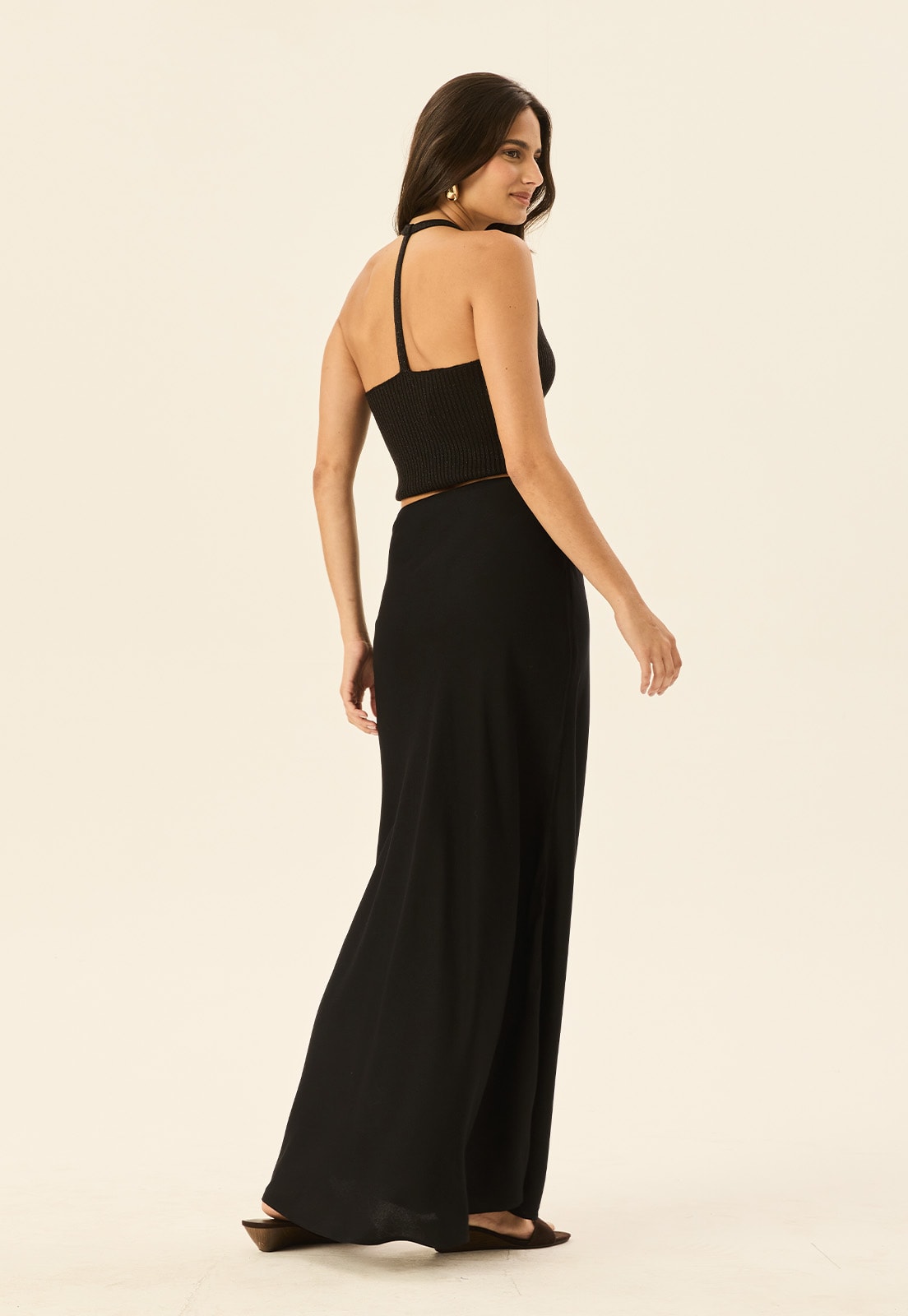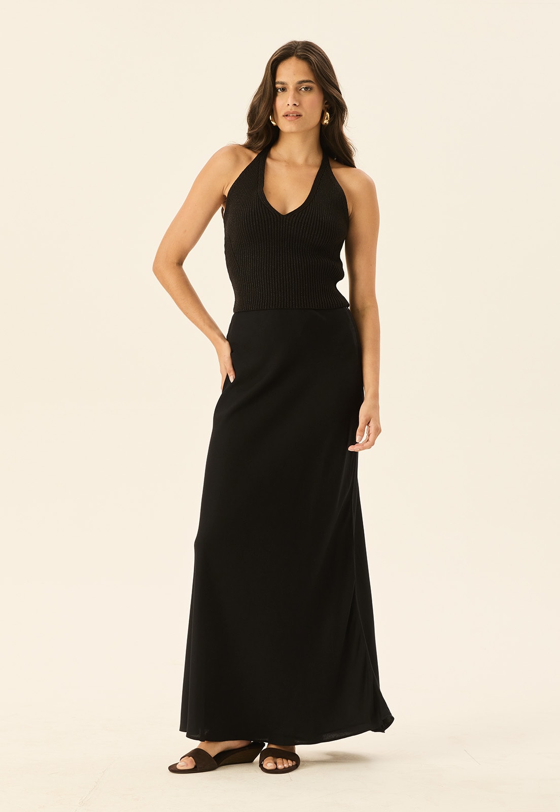 Seu design atemporal permite combinações infinitas: use com regatas minimalistas para um visual casual, ou aposte em blusas estruturadas e acessórios marcantes para eventos especiais. A saia enviesada é tendência para quem deseja unir estilo e praticidade.