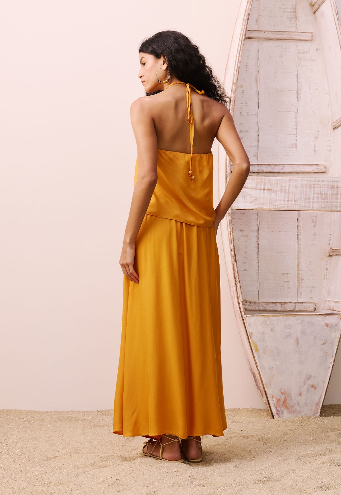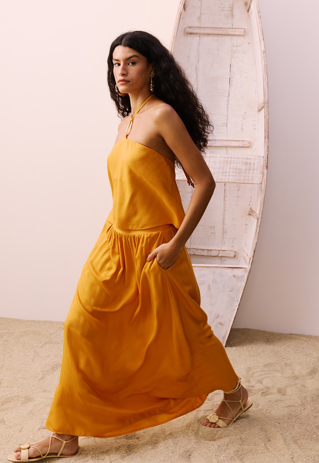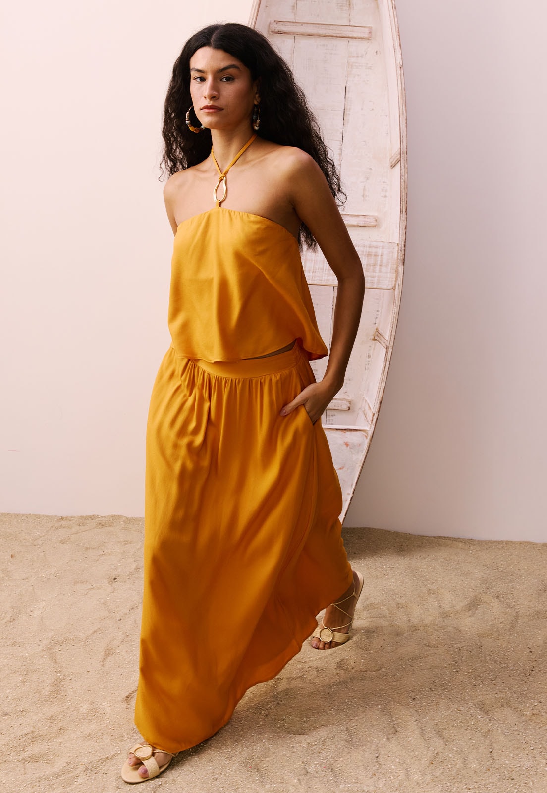 A saia midilisa é confeccionada em tecido 100% viscose. O modelo evasê possui pala com elástico nas costas, favorecendo a vestibilidade, e bolsos laterais, adicionado maior praticidade e modernidade. O shape é amplo e fluído.