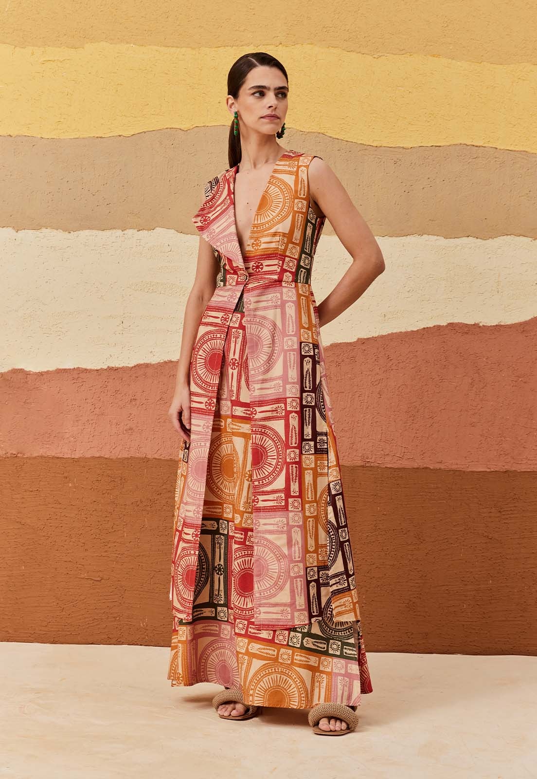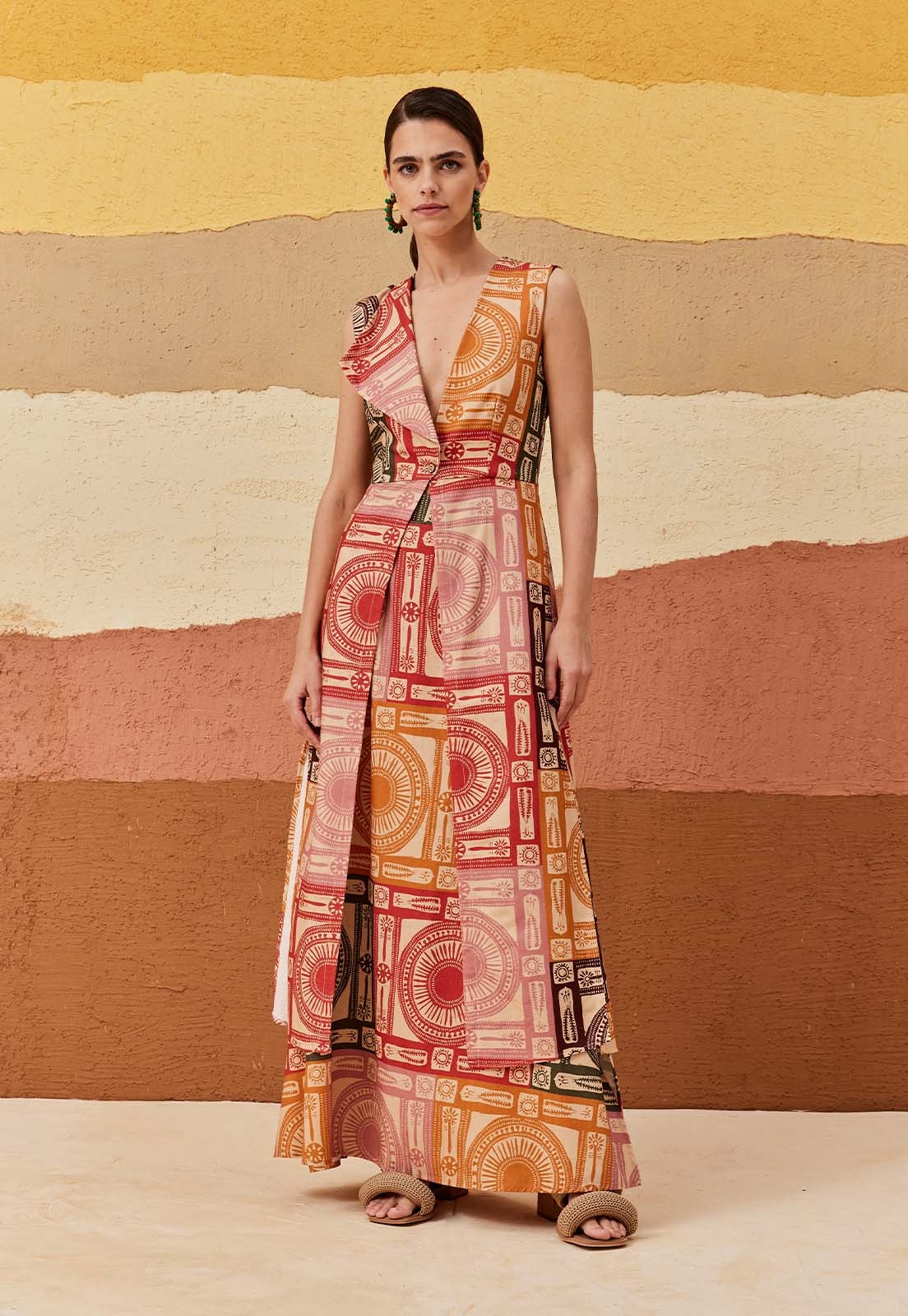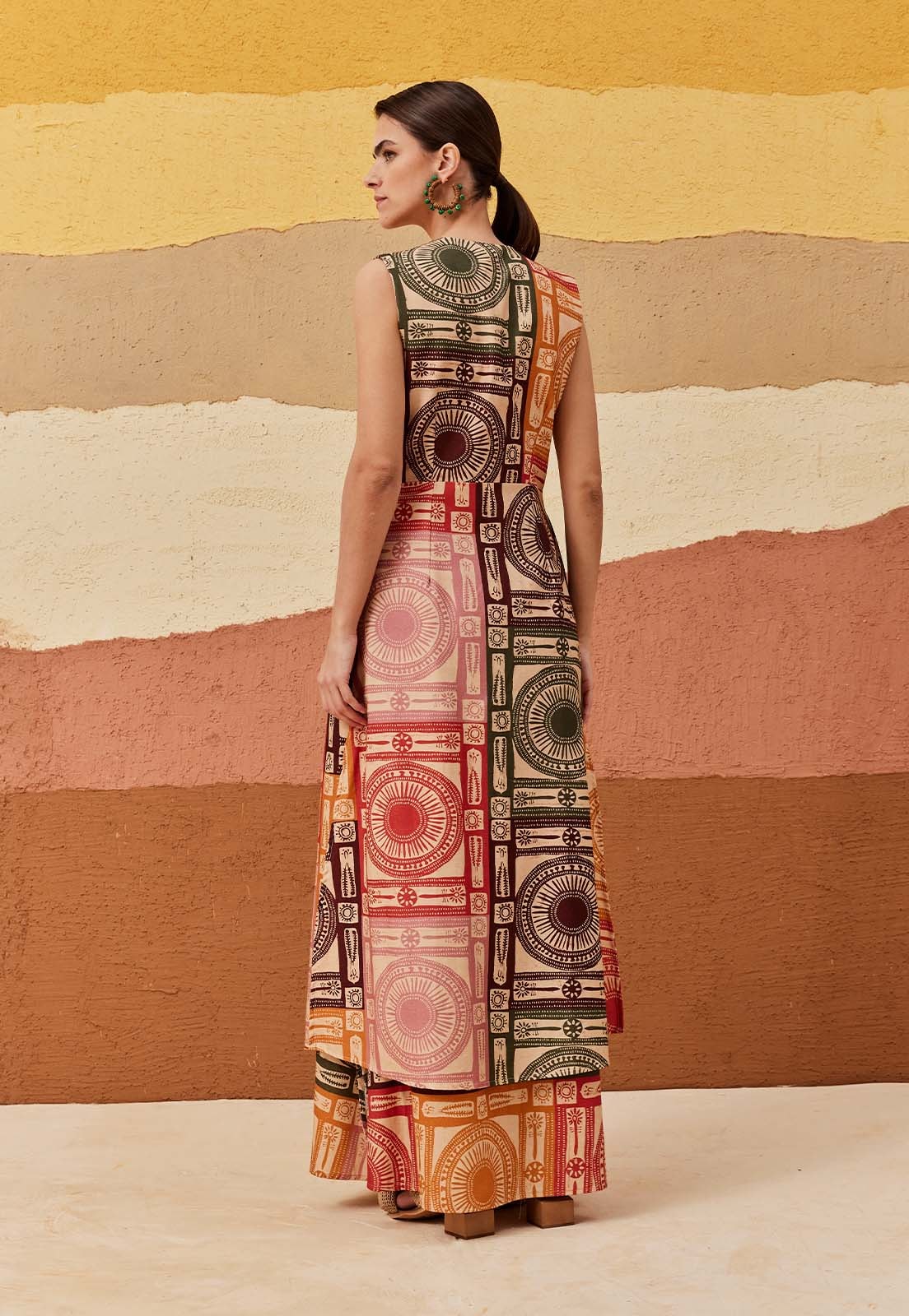 A saia longa estampada Huaso confeccionada é confeccionada em tecido 70%algodão e30% viscose. O modelo possui pala na cintura com elástico nas costas e fendas laterais.
