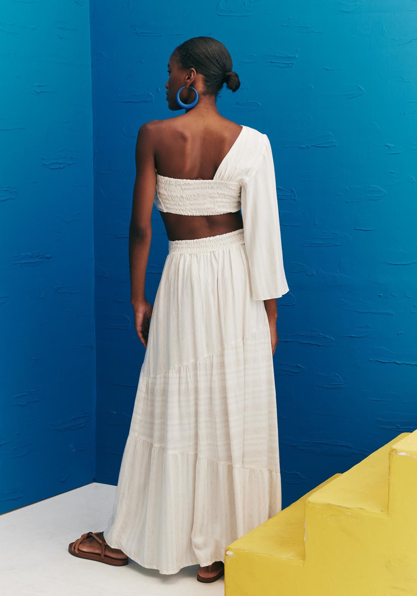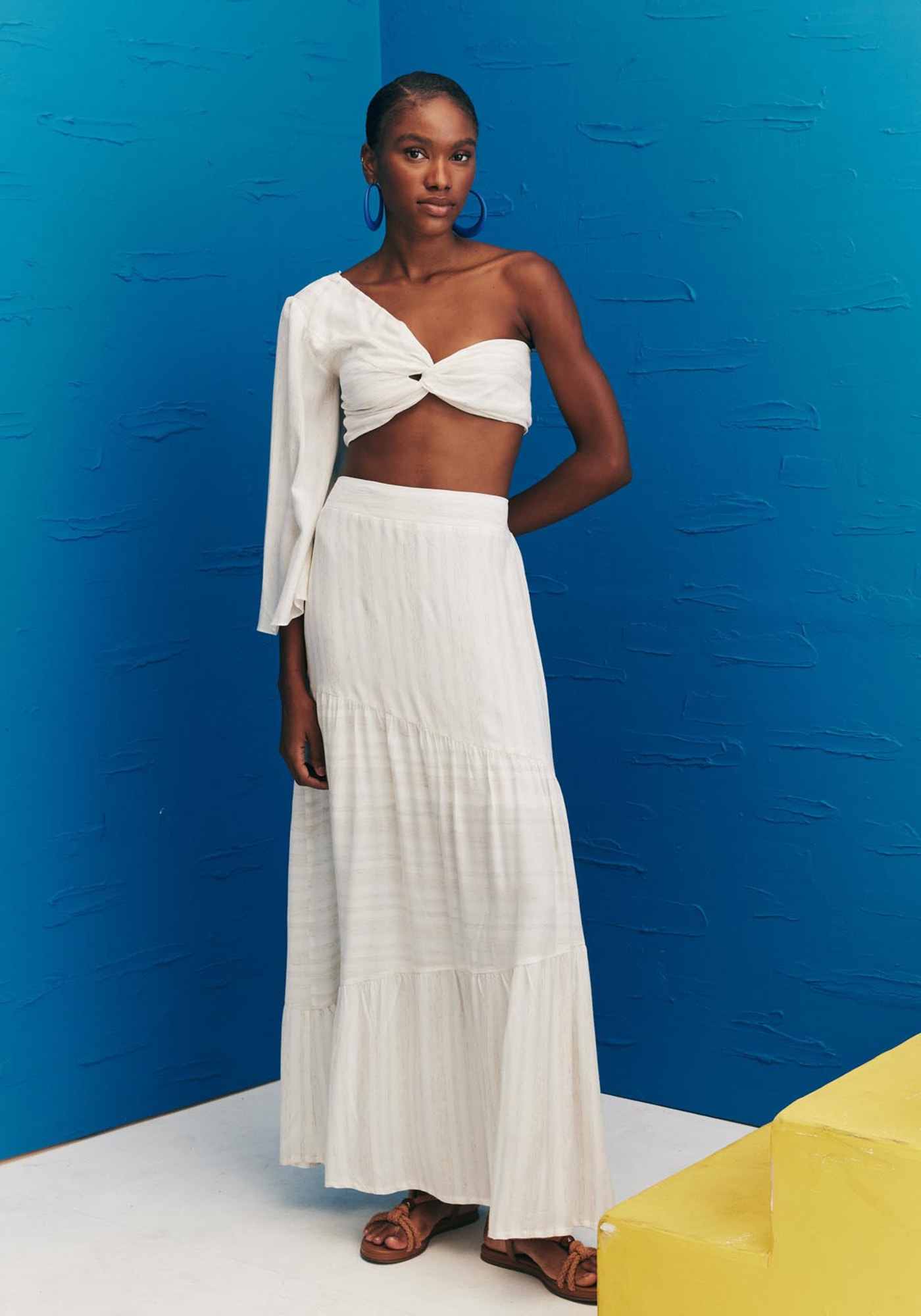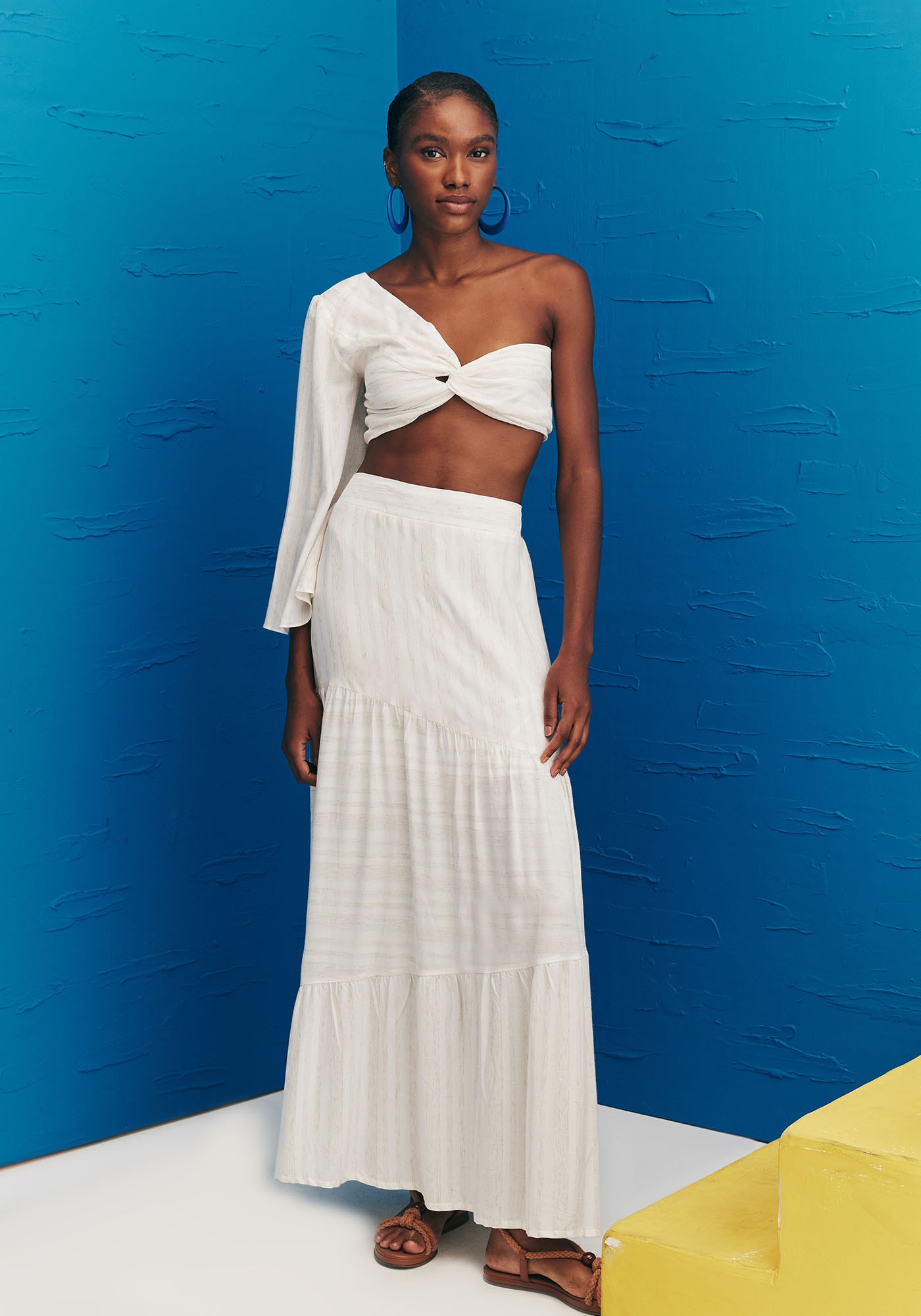 Confeccionada em tecido 97%viscose 3% linho, a saia longa é o modelo perfeito para completar os looks doverão. Com pala na cintura e elástico na parte de trás, a peça democrática eversátil possui recortes assimétricos que dão volume e movimento, aumentando aindamais a beleza da saia.
