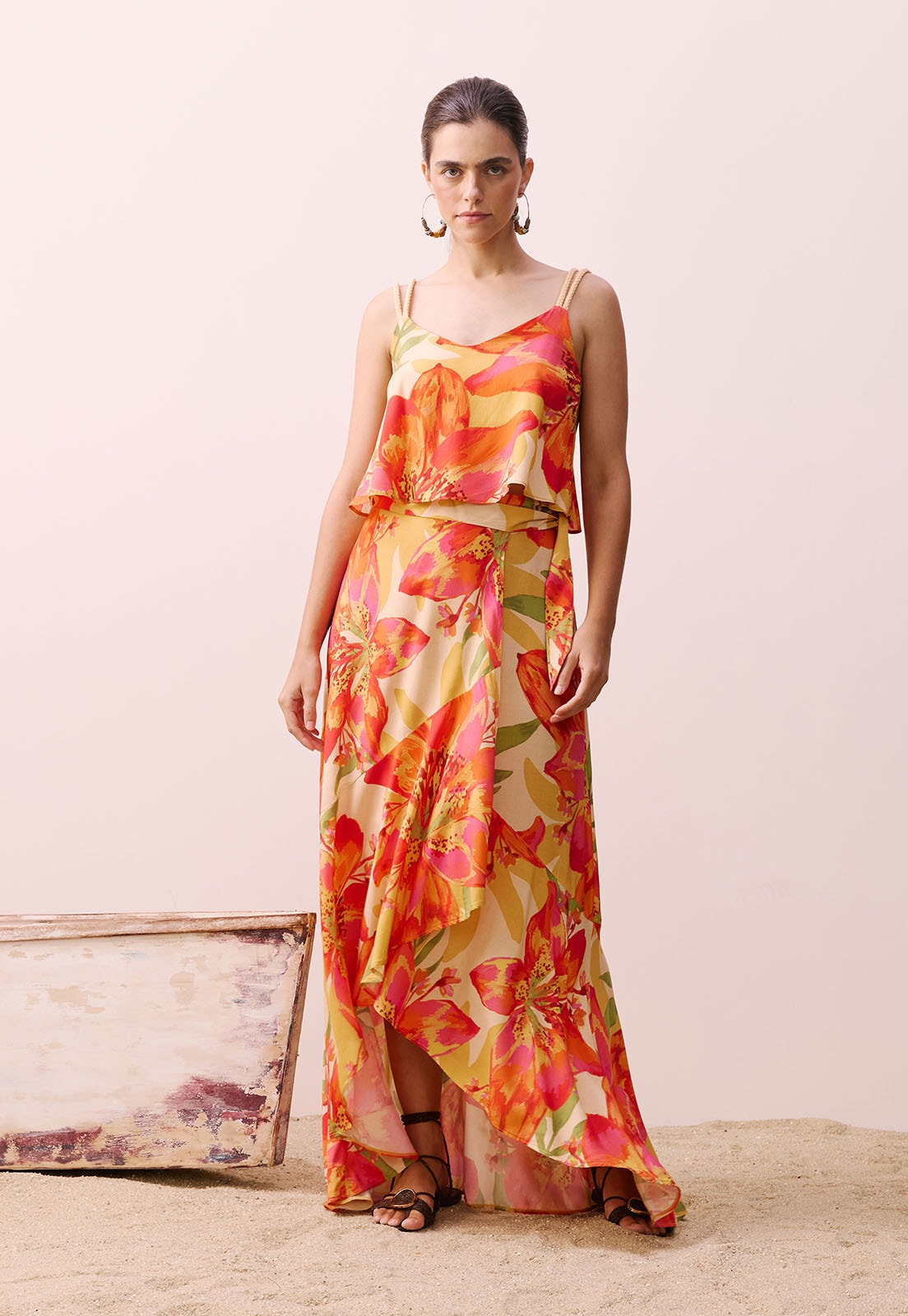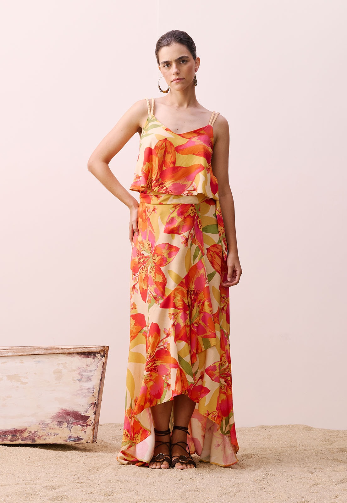 Versátil e cheia de personalidade, essa saia combina facilmente com blusas de tecidos naturais, sandálias de tiras ou acessórios artesanais, sendo perfeita para eventos ao ar livre, encontros casuais ou até mesmo ambientes de trabalho criativo. A modelo veste tamanho P e tem 1,77m de altura, evidenciando o comprimento ideal e o ajuste impecável da peça.