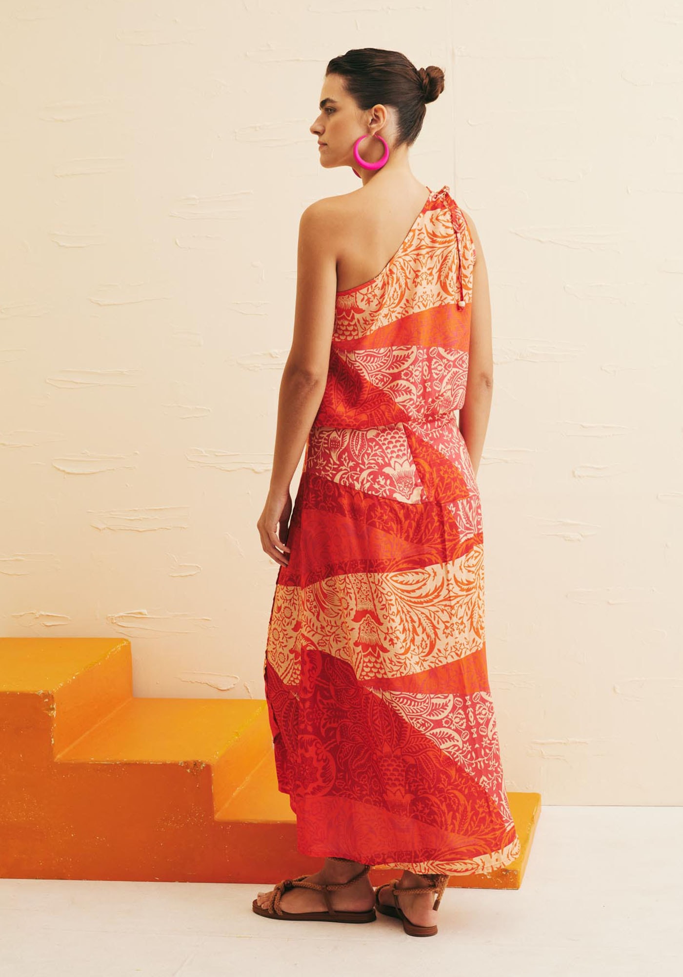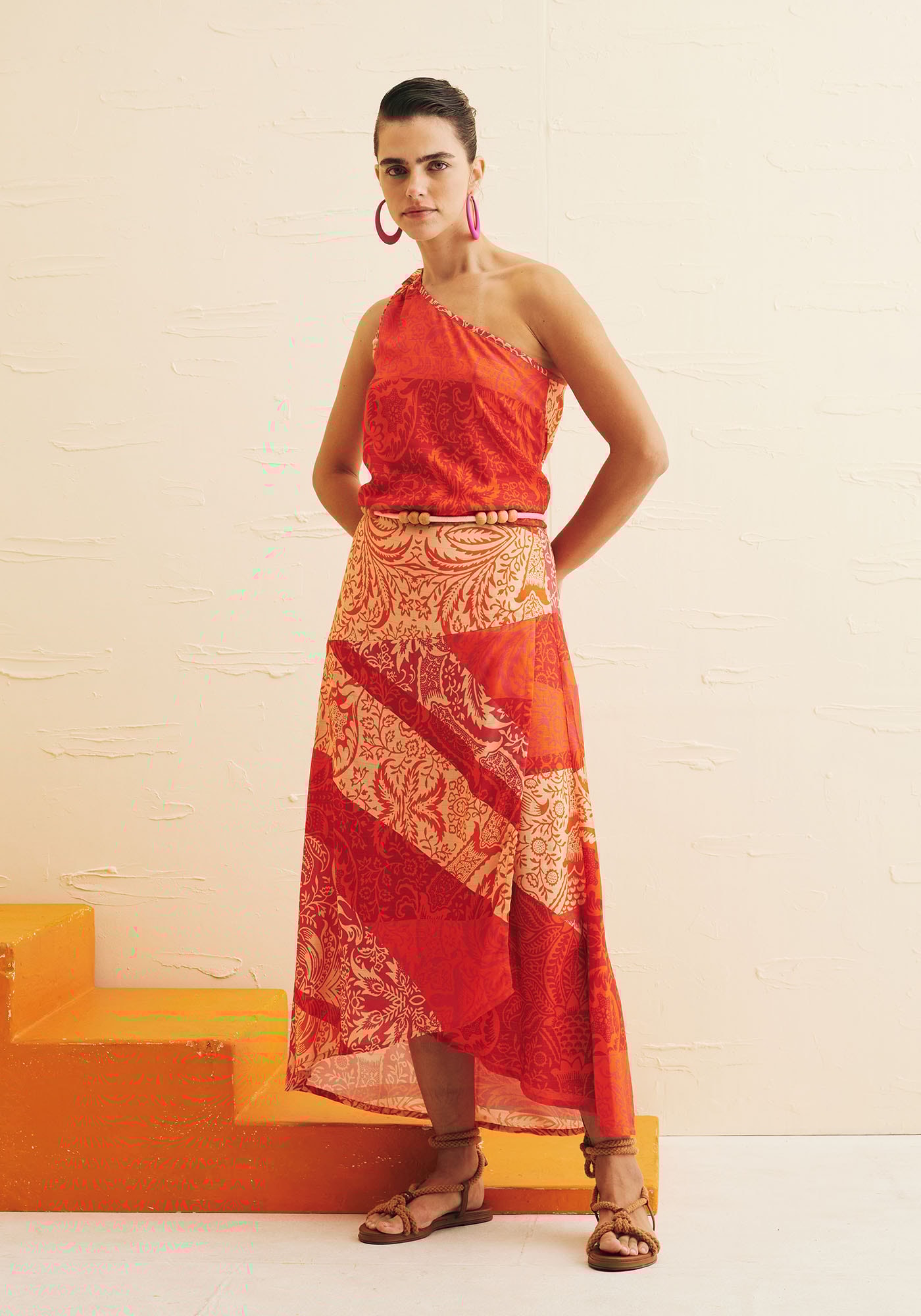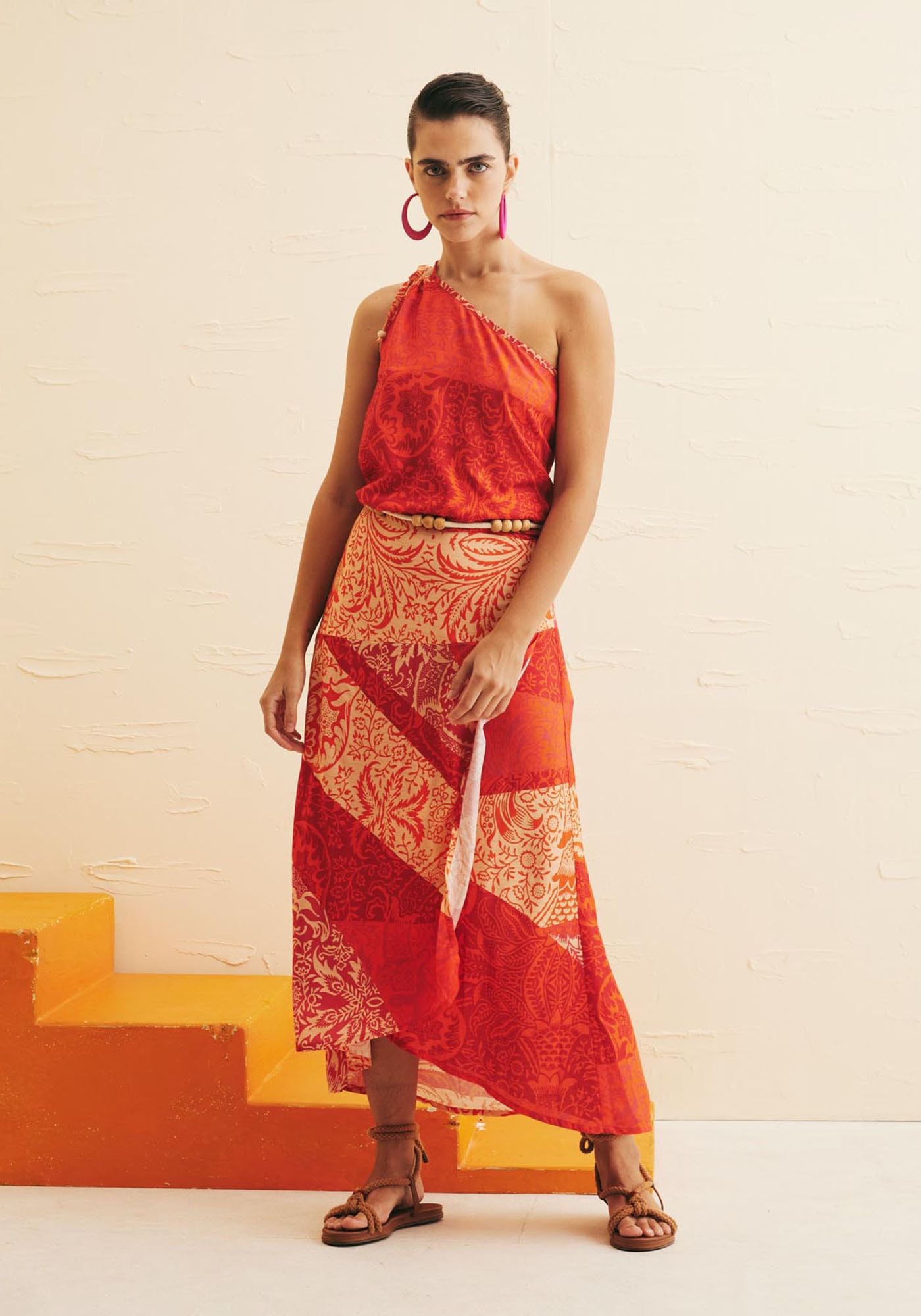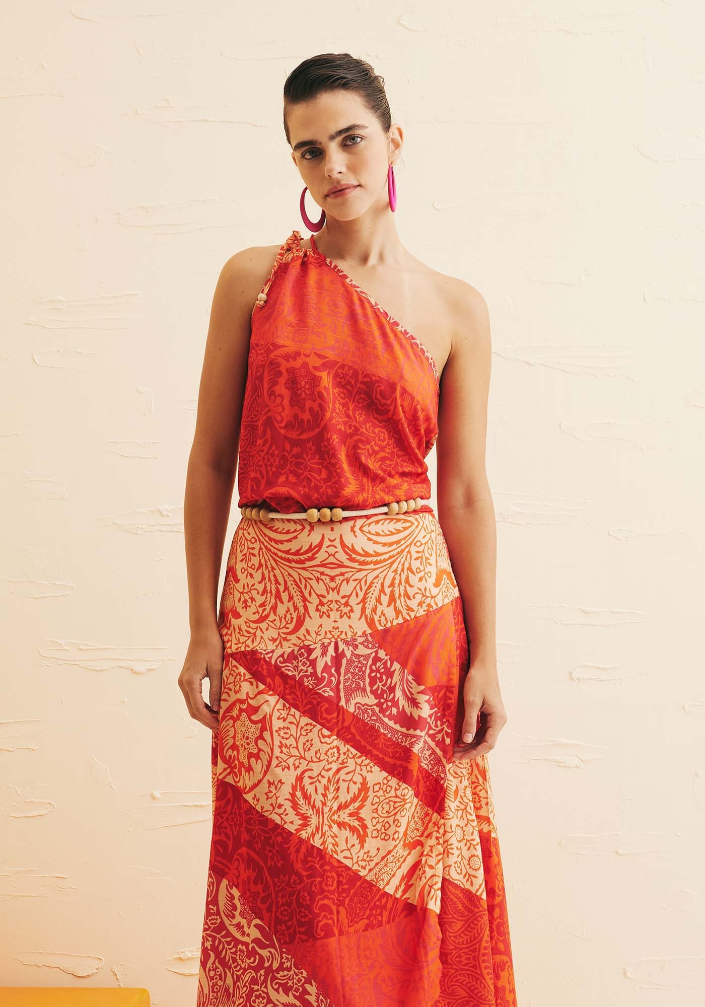 A saiamidi estampada Nueva Cáncion é perfeita para dias quentes e ensolarados.Confeccionada em tecido 99% viscose 1% poliéster, o modelo transpassado dá movimentoe fluidez para a saia e a pala assimétrica orna perfeitamente com a estampa, quetraz as cores do verão.