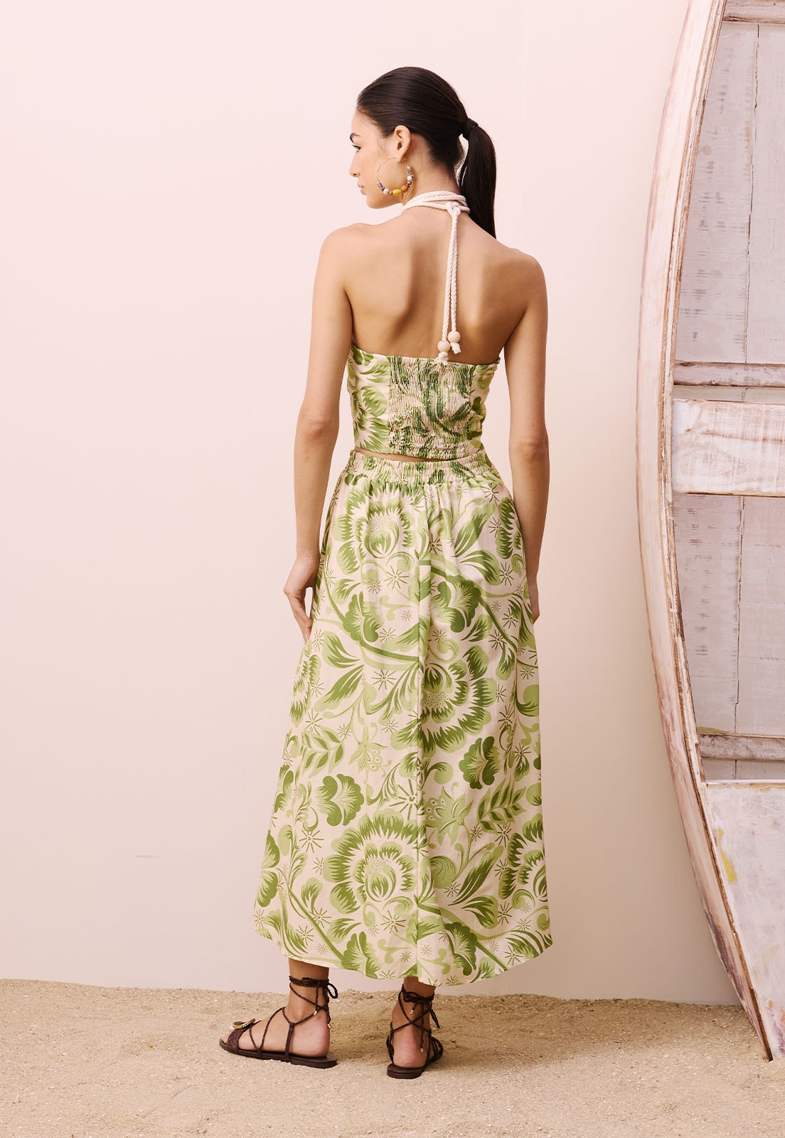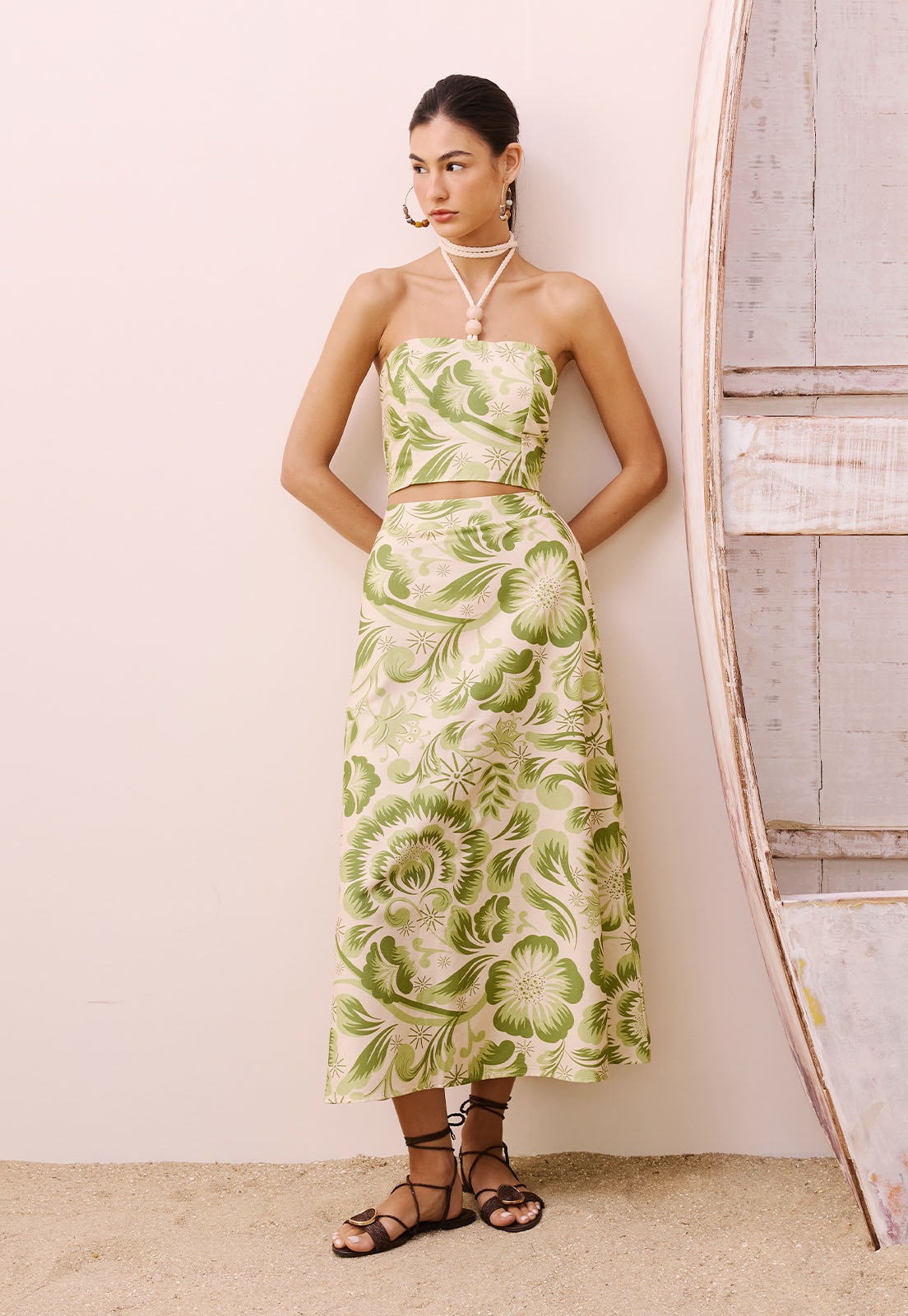 Estampa exclusiva e caimento leve em uma saia midi versátil perfeita para os dias de verão com estilo e frescor.