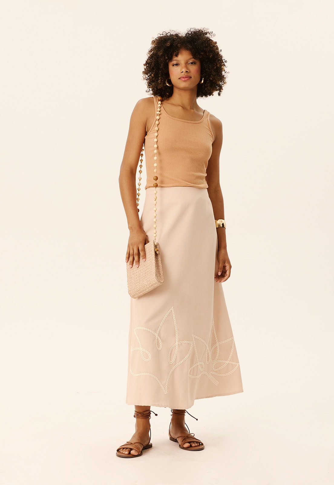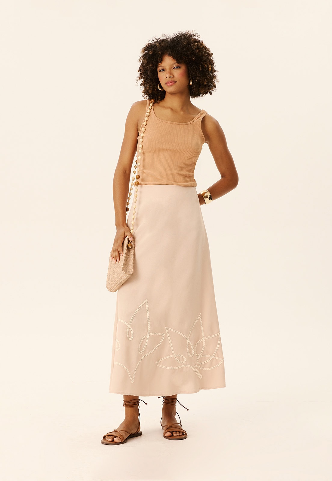 A Saia Midi Folha Bordada CaCay é a tradução perfeita do equilíbrio entre sofisticação e leveza. Com comprimento midi e caimento fluido, ela valoriza o movimento natural do corpo, oferecendo conforto e elegância em cada passo. O bordado em formato de folhas na barra adiciona um toque artesanal e atemporal, ideal para quem busca peças com identidade e acabamento refinado. Confeccionada em tecido de composição 70% algodão e 30% viscose, proporciona uma sensação suave ao toque e excelente respirabilidade, perfeita para o dia a dia ou ocasiões especiais.