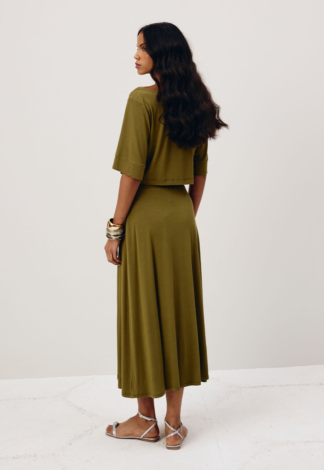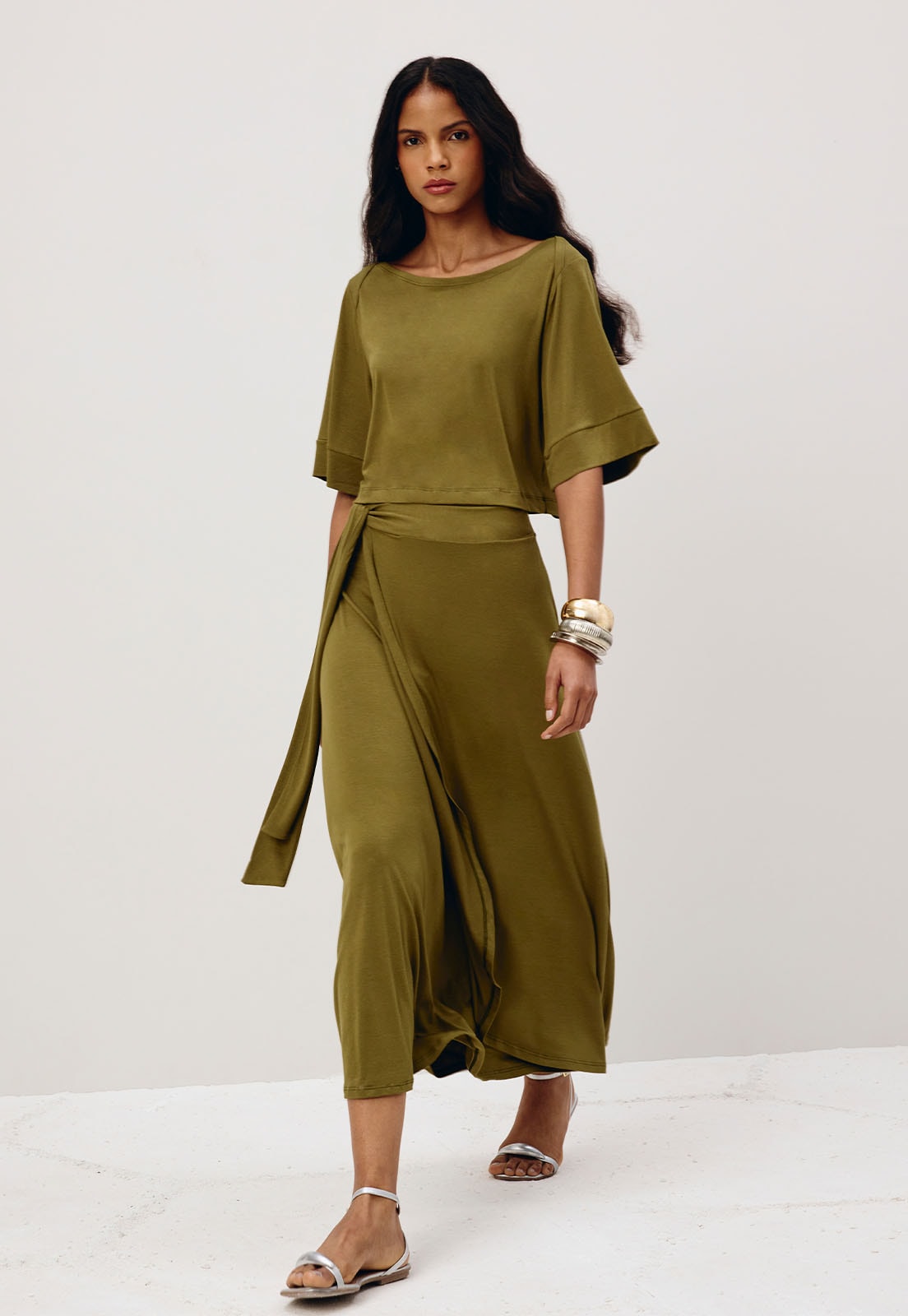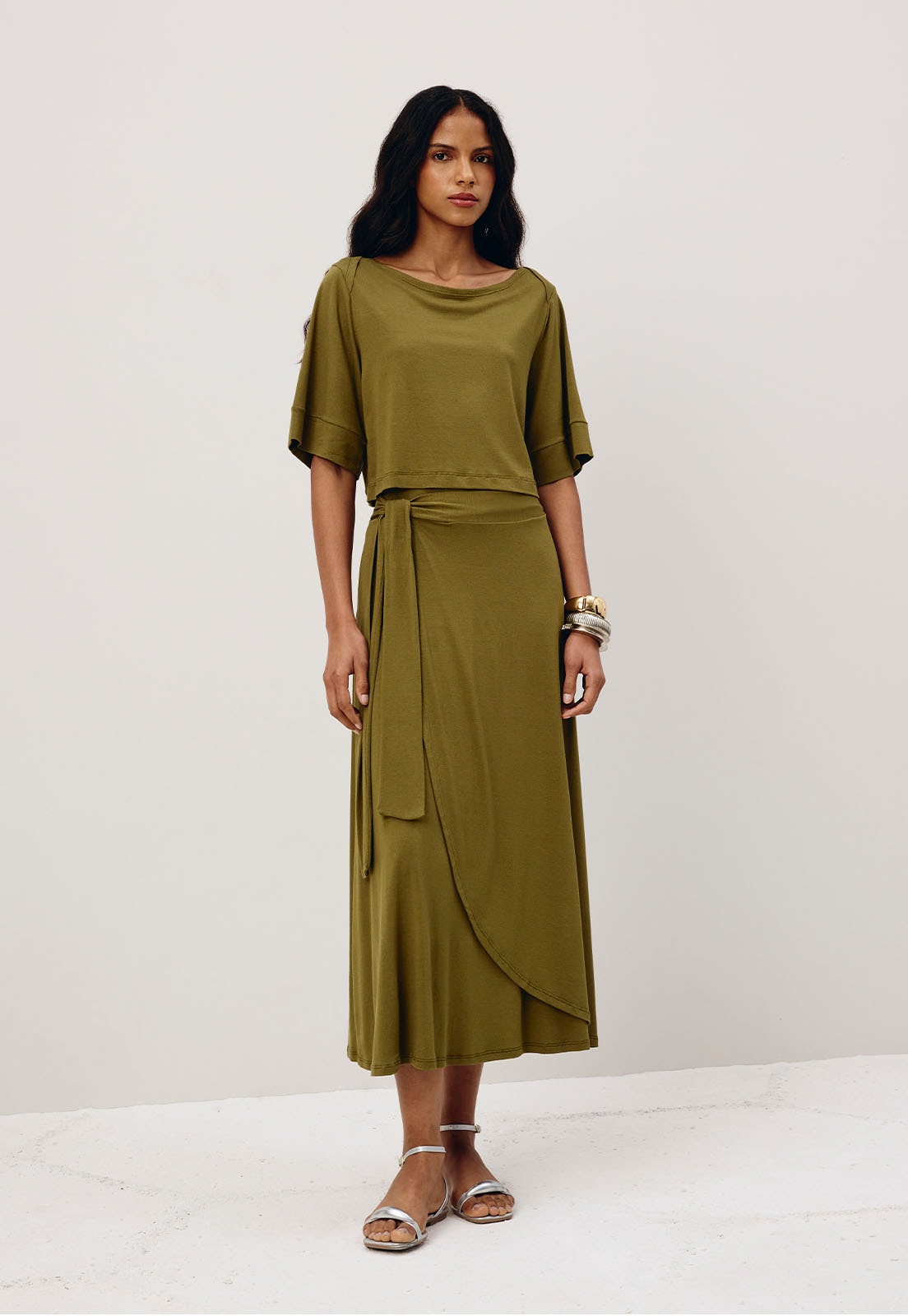 A saiaé confeccionada em malha 96% viscose 4% elastano. É um modelo midi transpassado possui pala na cinturacom amarração lateral.