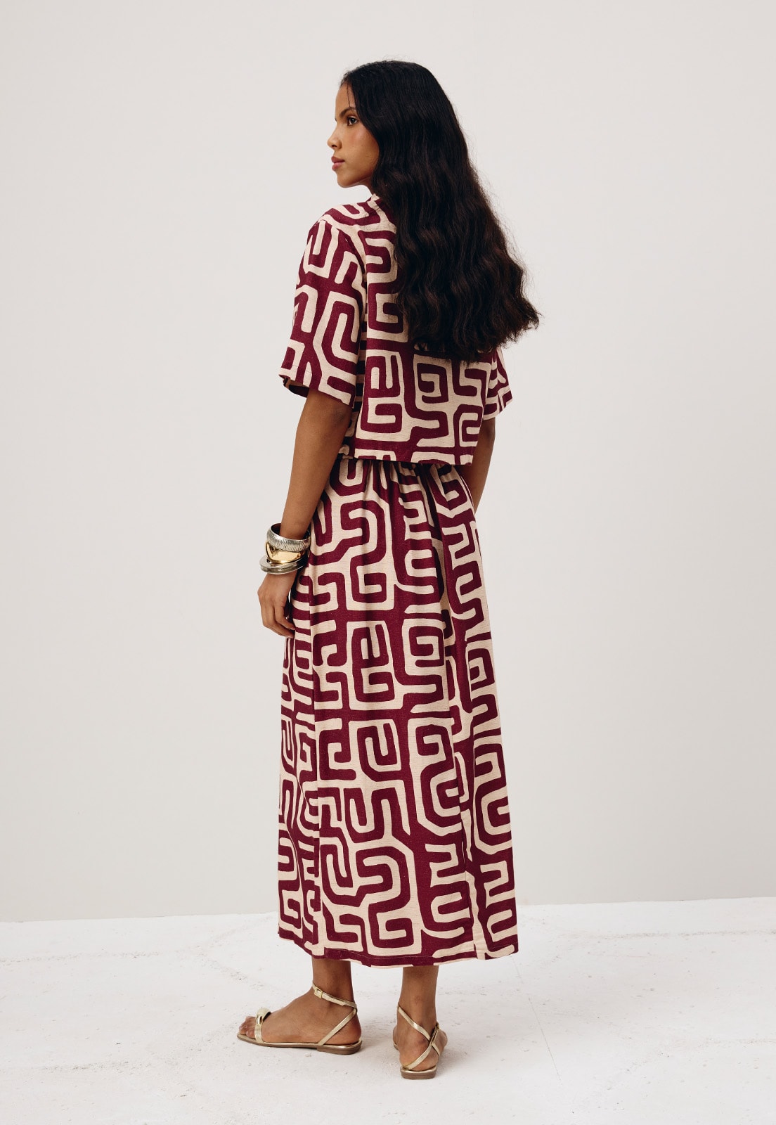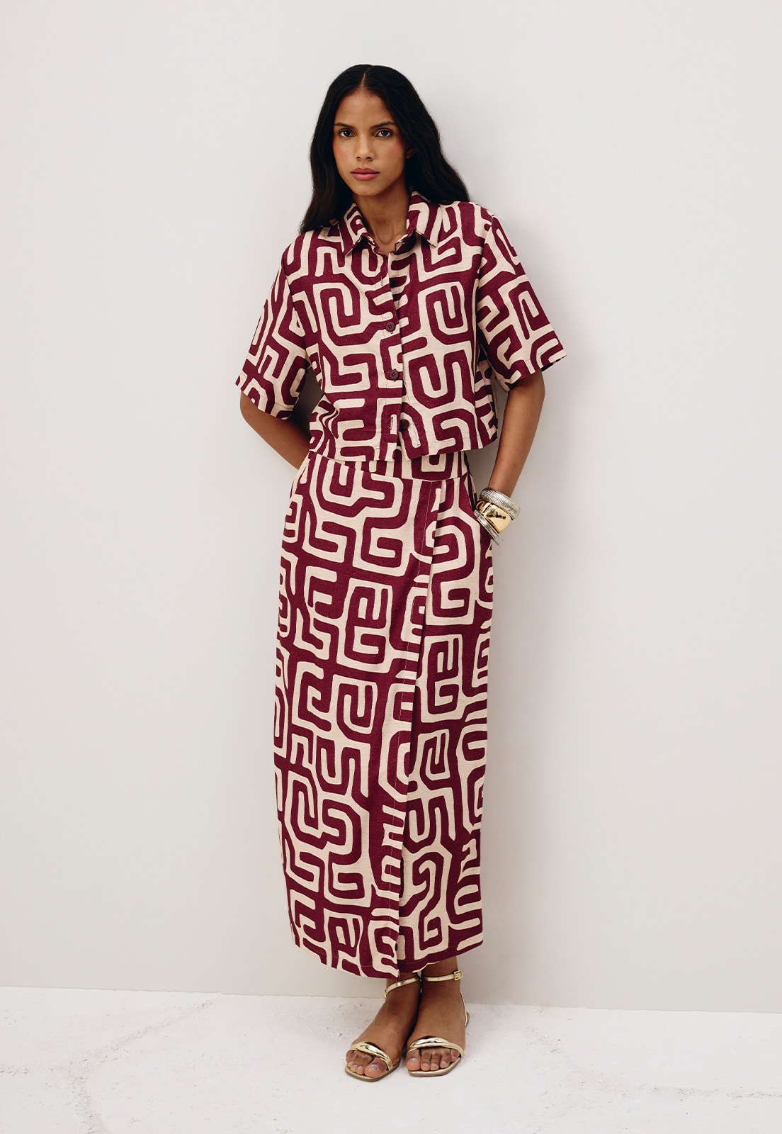 A saia estampada Yala é confeccionada em tecido 42% algodão 38% viscose 15% modal e 6% linho. É um modelo transpassado com pala na cintura e elástico na parte da trás, elegante e sofisticado .