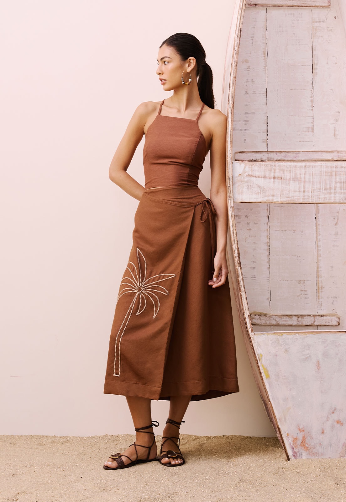 A Saia Transpassada Coqueiro da CaCay é a união perfeita entre design autoral e conforto. Com comprimento midi e modelagem transpassada, ela valoriza a silhueta com caimento fluido e toque suave. O bordado de coqueiro na parte frontal adiciona um charme artesanal ao visual, enquanto a amarração lateral e os detalhes cruzados nas costas garantem ajuste personalizado e acabamento sofisticado. Sua composição 50% algodão, 29% viscose, 15% modal e 6% linho proporciona respirabilidade, leveza e durabilidade, ideal para quem busca estilo com bem-estar.