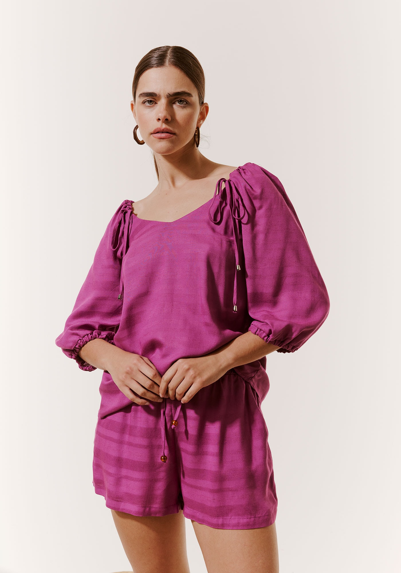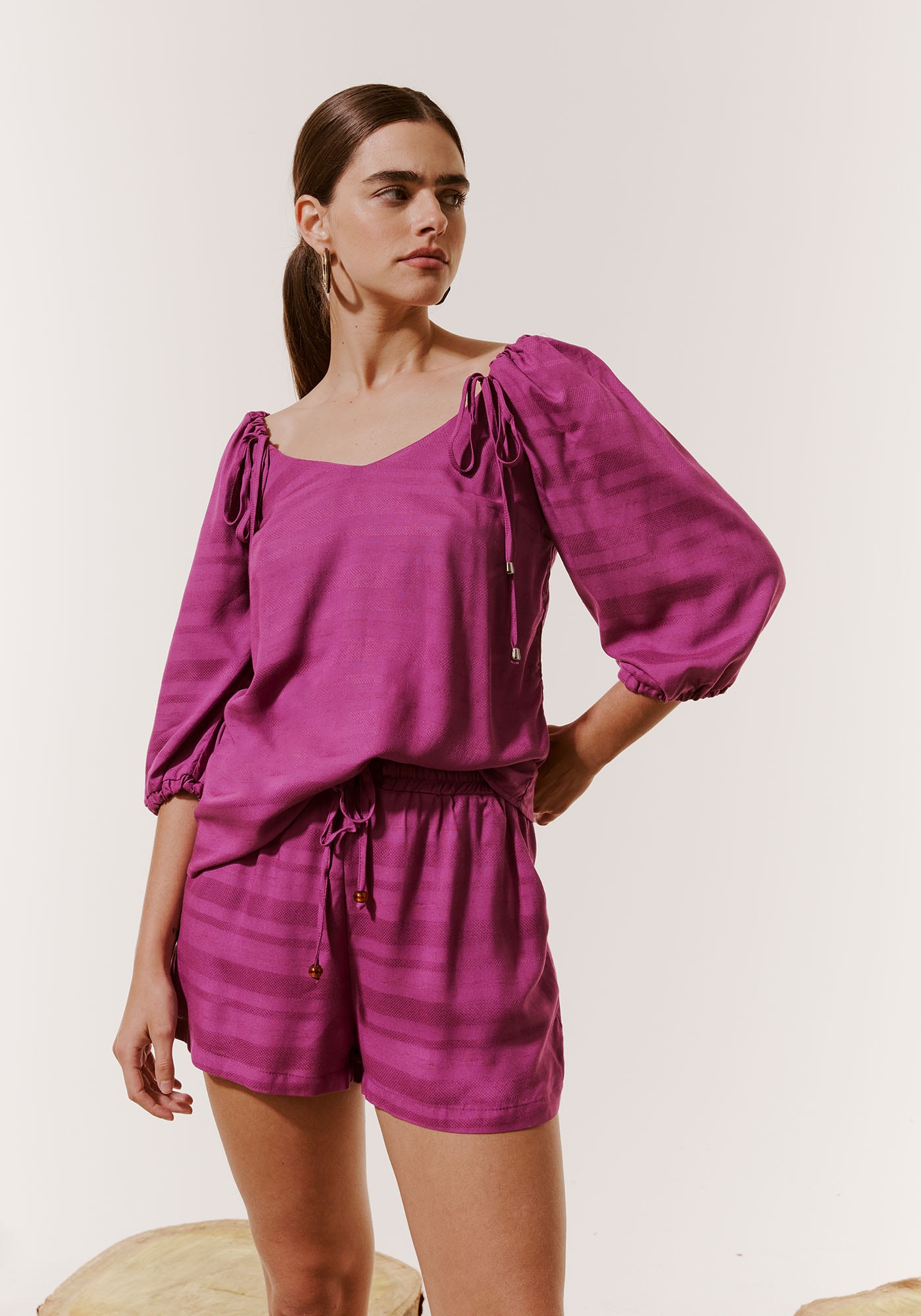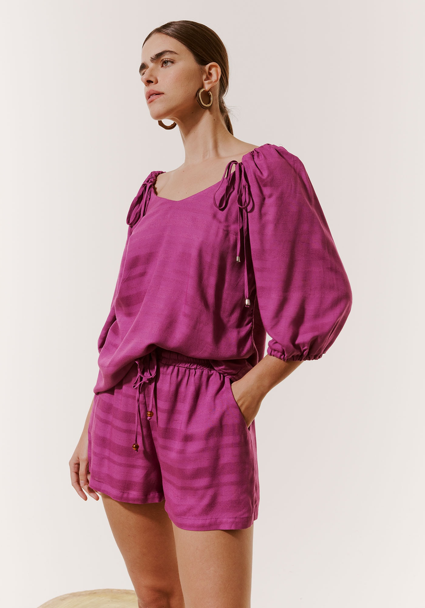 O short com amarração é uma peçasofisticada e versátil. Confeccionado em tecido 97% viscose e 3% linho, omodelo possui pala com lastex e amarração. Os bolsos laterais deixam o modeloprático para o uso no dia a dia.