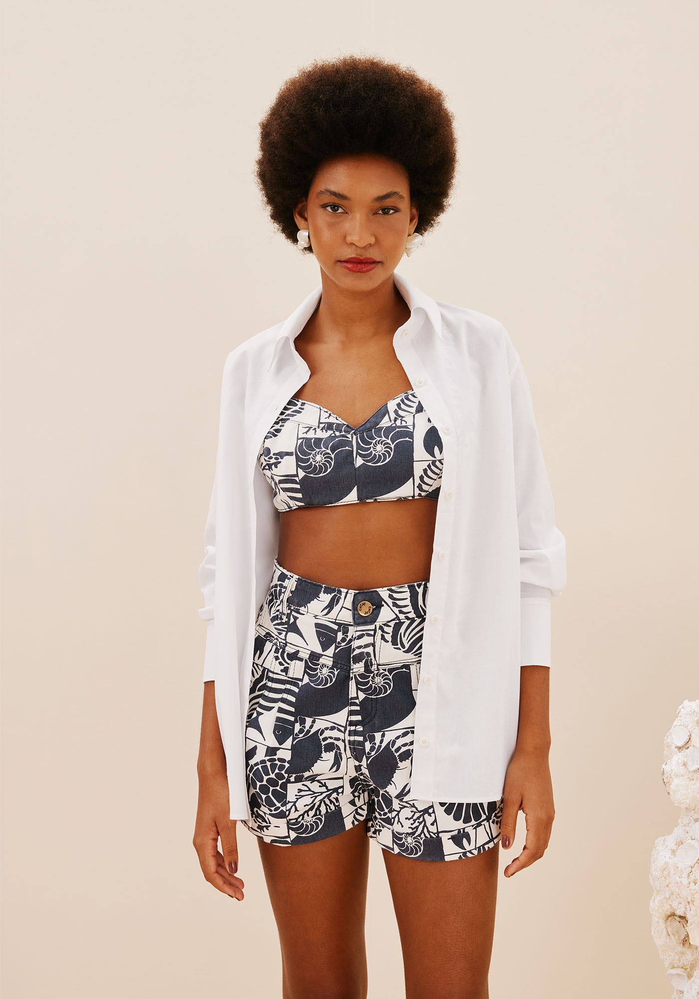 O shortestampado Mar é confeccionado em sarja em 100% algodão. O modelo cintura alta ésuper charmoso e a cara do verão. Possui fechamento com botão e zíper e passadorpara cinto. As pregas e a barra dobrada dão um charme a mais para o modelo curtinho.