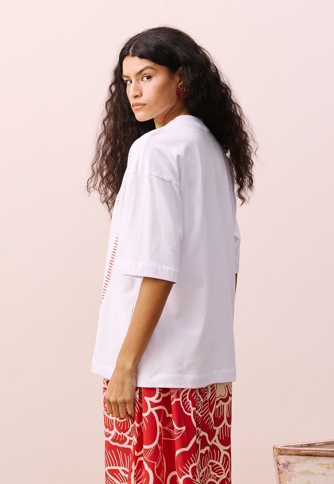 Ideal para compor looks casuais com jeans, alfaiataria desconstruída ou até bermudas de linho, essa t-shirt também conversa bem com acessórios minimalistas e tênis neutros. O caimento é confortável e favorece diferentes tipos de corpo a modelo veste tamanho P e tem 1,77m de altura. Perfeita para o dia a dia, encontros informais ou momentos de lazer com estilo.