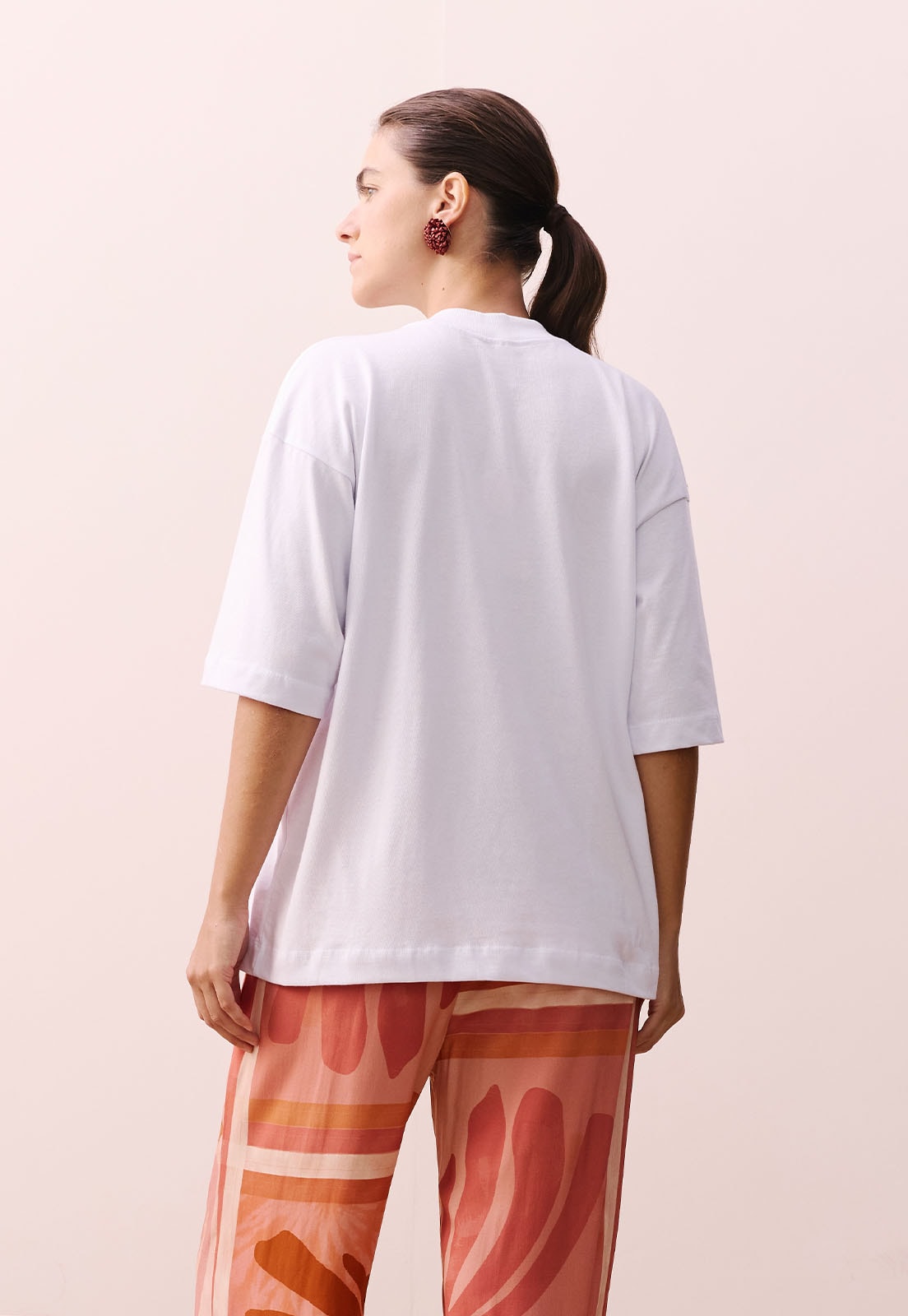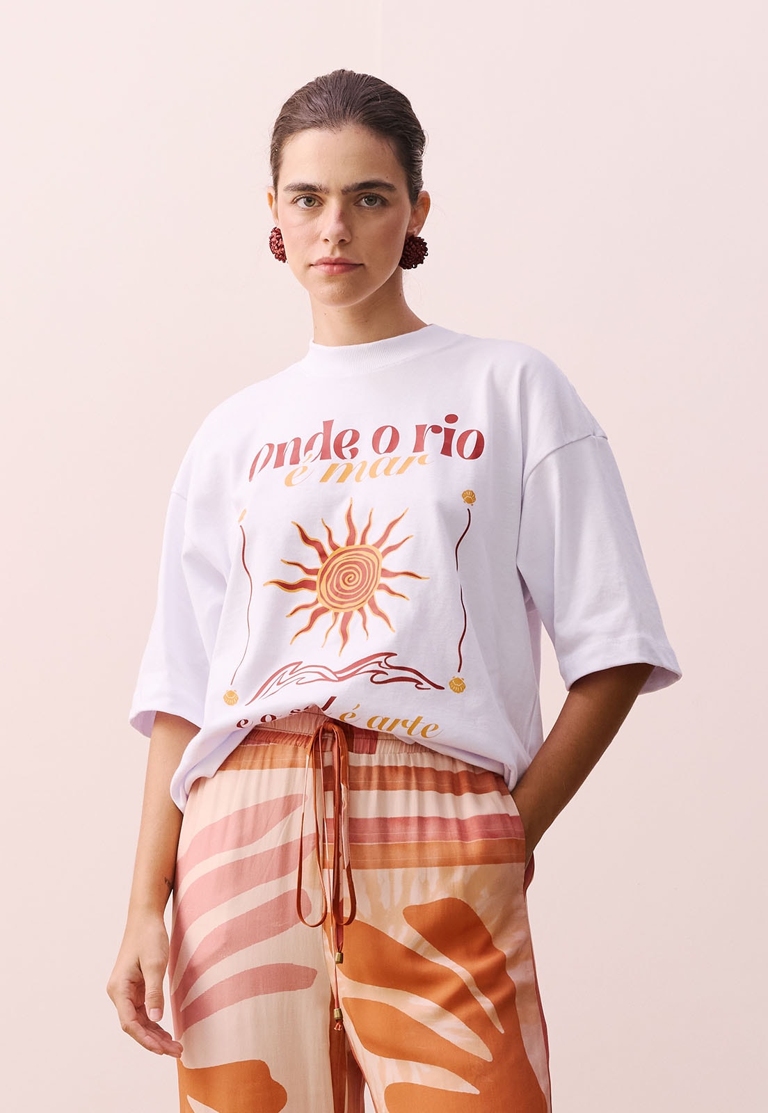A T-shirt "Rio é Mar" é uma homenagem à essência carioca e à liberdade que o verão inspira. Com silk frontal exclusivo, ela traz a frase que conecta cidade, natureza e arte. A peça possui modelagem reta, mangas curtas e é confeccionada em malha leve, garantindo conforto e estilo para o dia a dia.