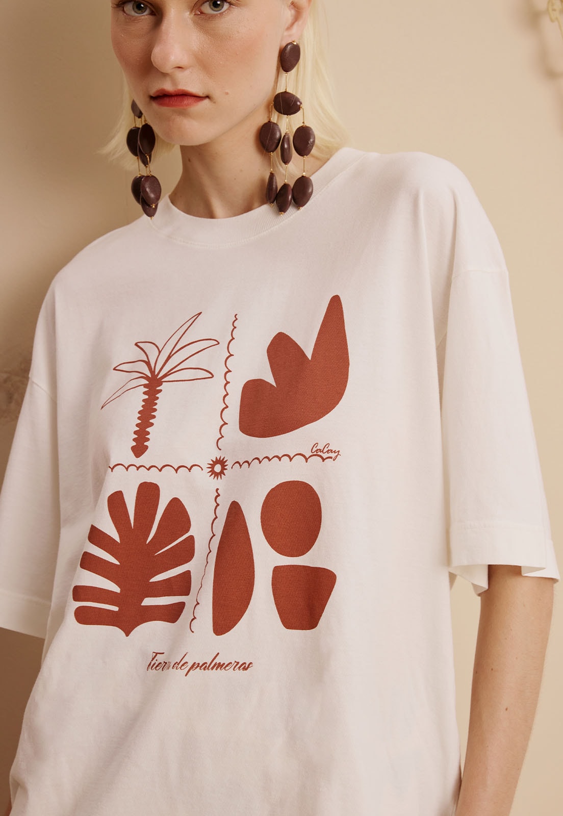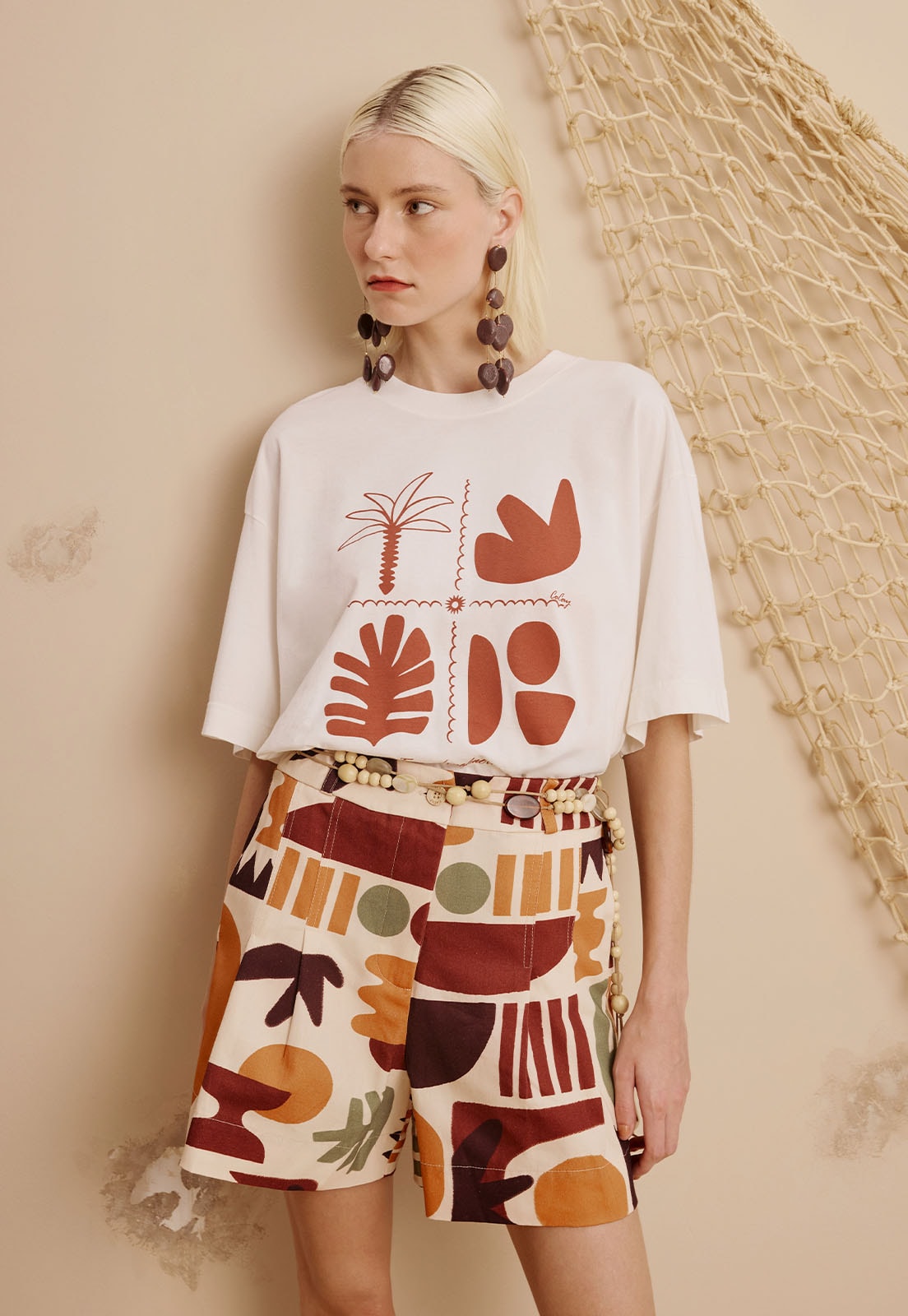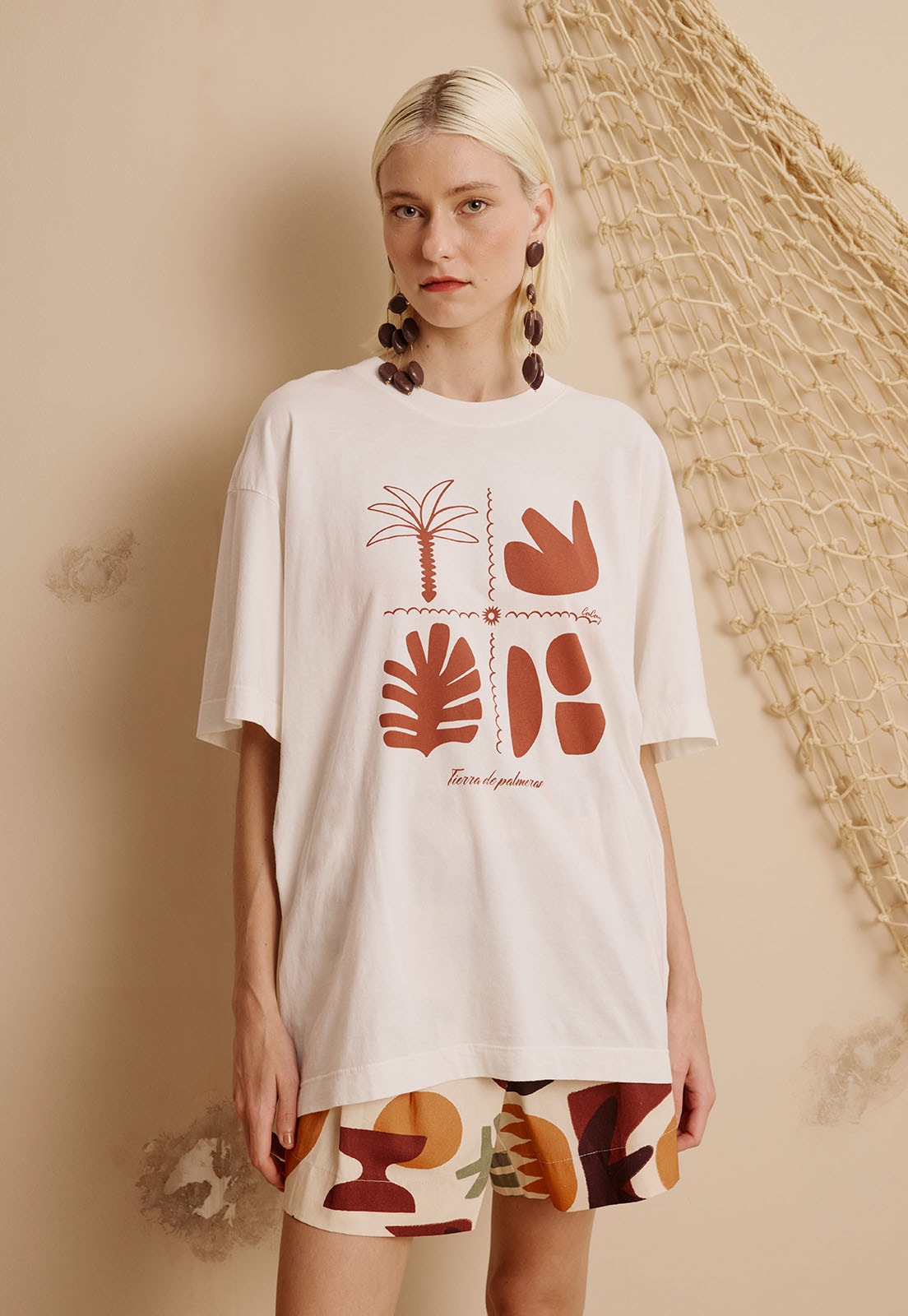 A T-shirt Tierra de Palmeiras CaCay é uma peça que traduz a essência do design autoral com um toque artístico e atemporal. Seu destaque está na estampa frontal dividida em quatro quadrantes, que combinam elementos gráficos como palmeiras, formas orgânicas e composições geométricas, criando uma narrativa visual única. Com modelagem reta e caimento confortável, ela veste bem em diferentes tipos de corpo a modelo, por exemplo, mede 1,77m e usa tamanho P, evidenciando sua versatilidade.