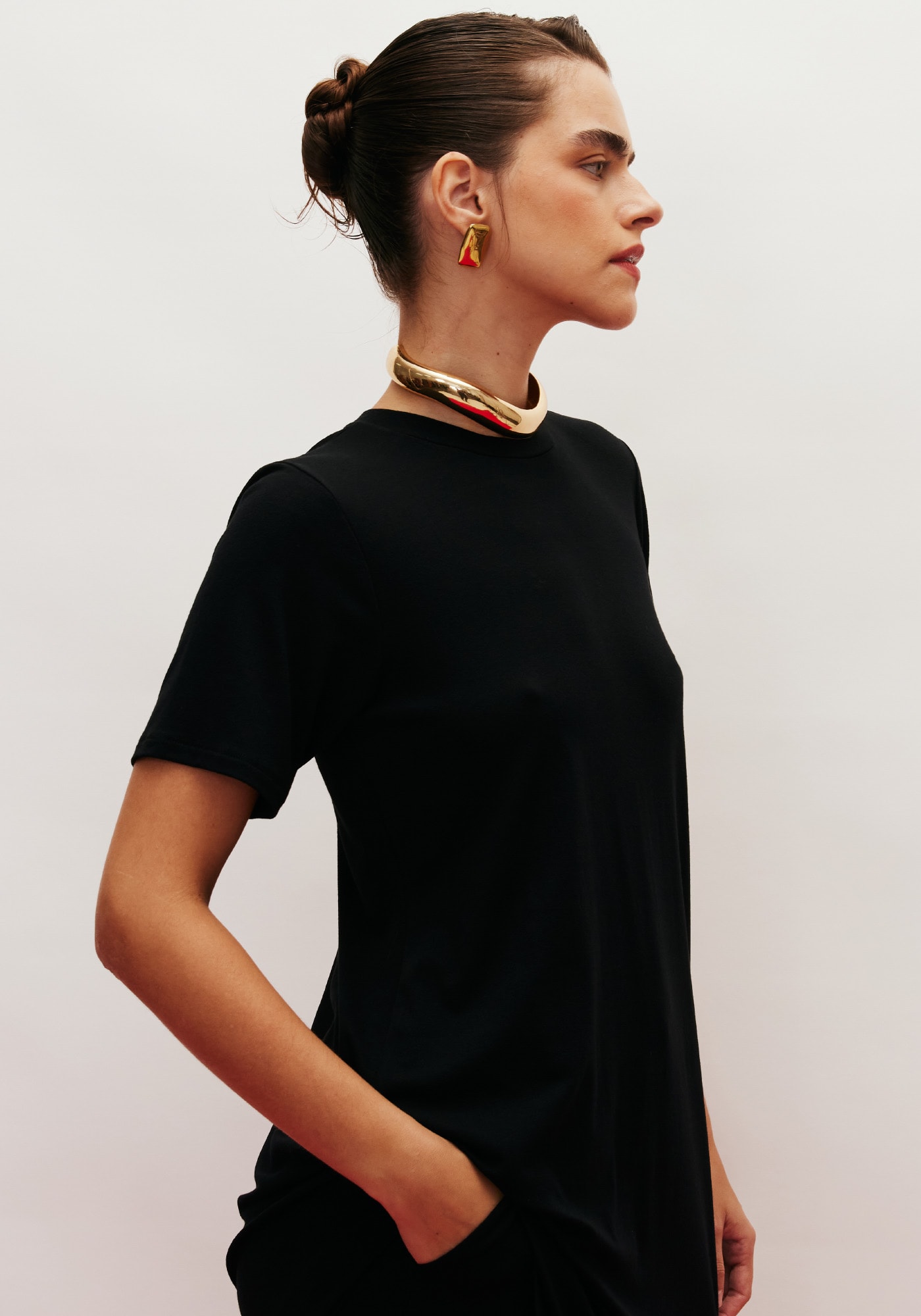 Confeccionada em malha,96% viscose 4% elastano, a túnica é uma peça que une conforto e estilo. O modelocom manga possui um desenho assimétrico único e pode ser usado de formasofisticada e elegante como complemento de outra peça.