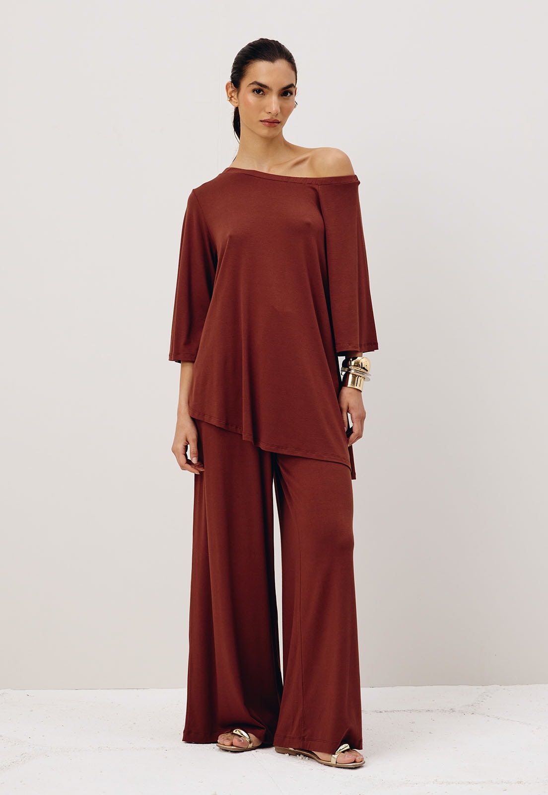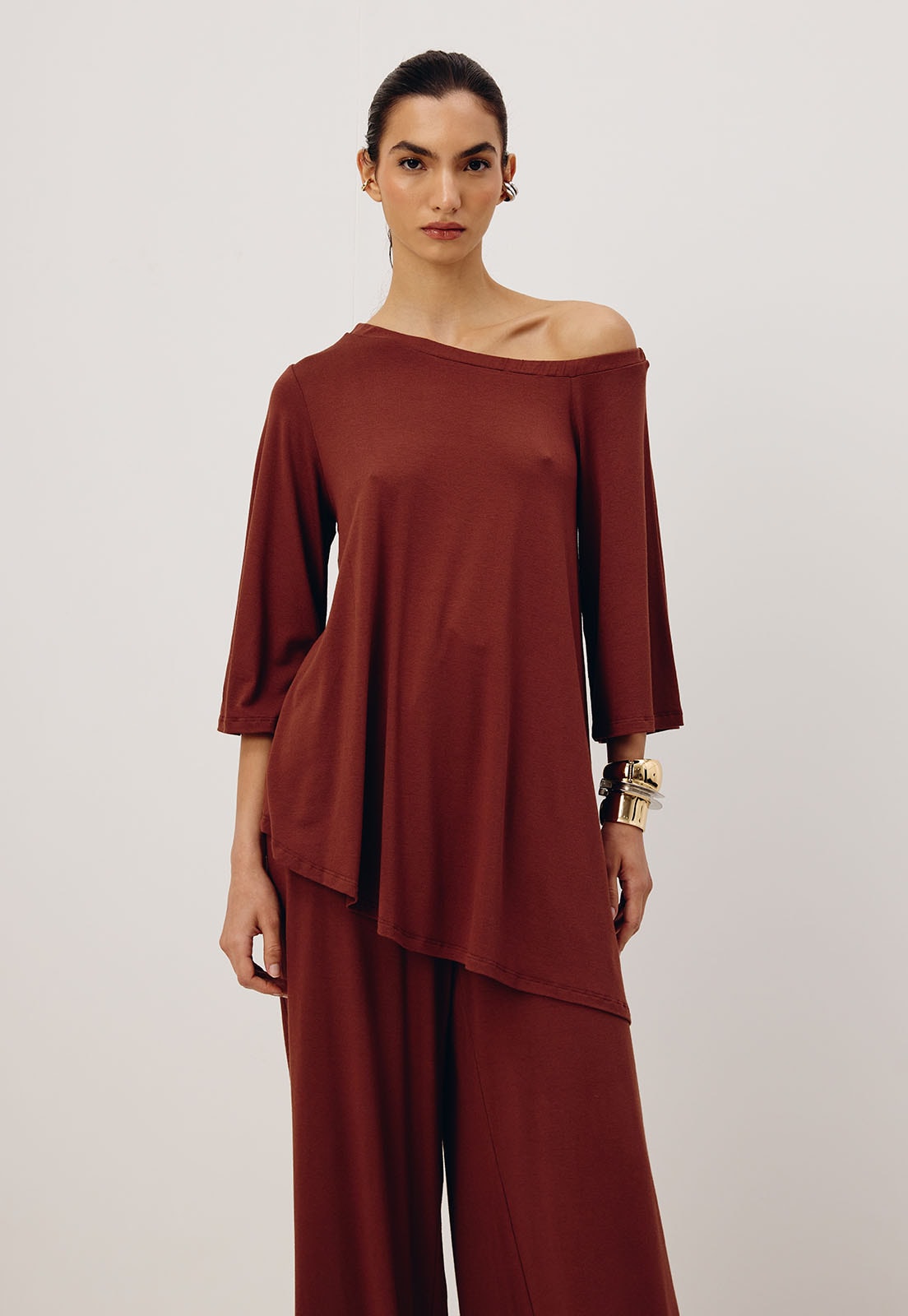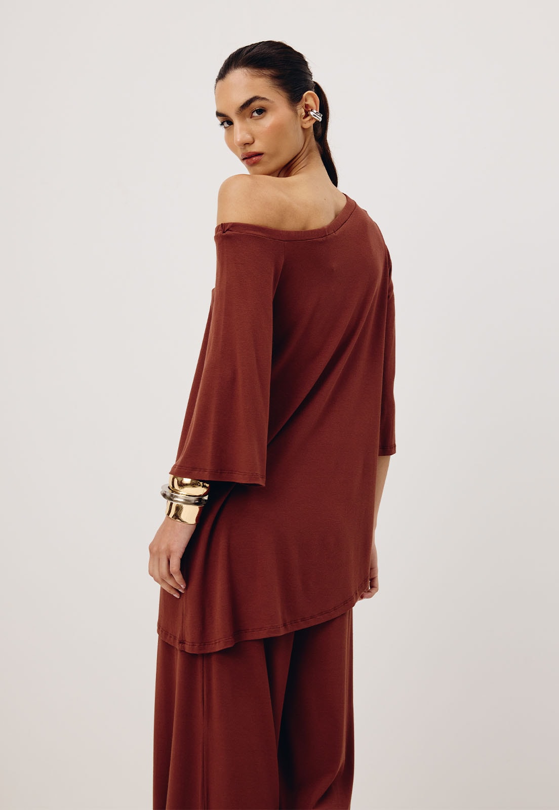 Perfeita para diferentes ocasiões do look casual chic ao office style a túnica combina bem com calças retas, pantalonas ou até saias midi, além de acessórios como maxi colares ou pulseiras estruturadas. Aposte em sandálias minimalistas ou flats para um visual descomplicado e elegante.