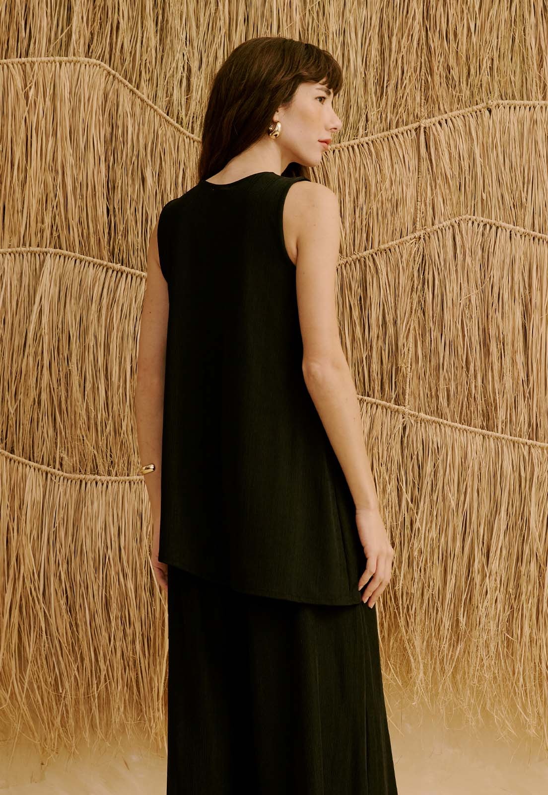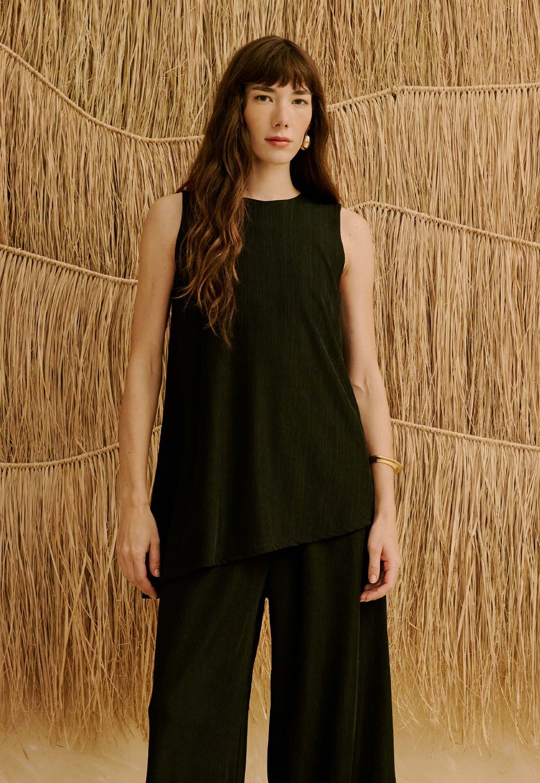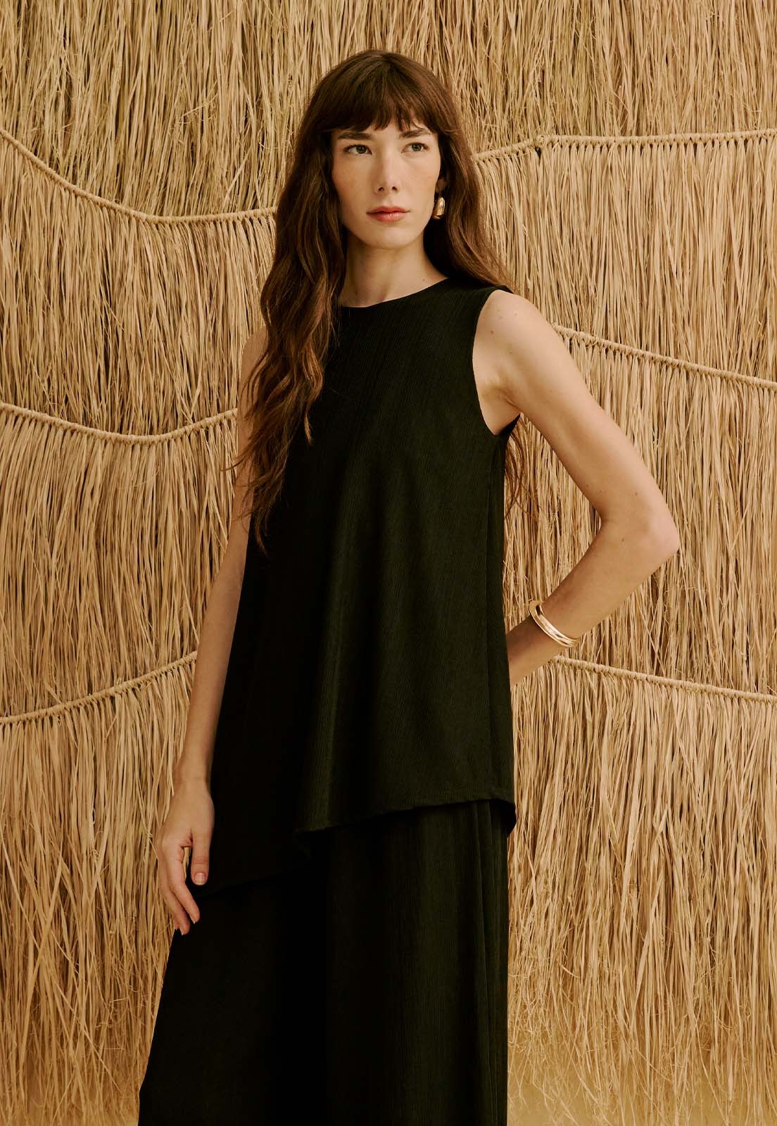 Confeccionada em poliéster com elastano, a peça tem toque macio e elasticidade moderada, ideal para uso prolongado com conforto. A túnica é perfeita para o dia a dia, trabalho ou eventos casuais, com estilo versátil que transita entre o minimalismo e o urbano. Combine com brincos marcantes ou uma sandália leve para compor um look sofisticado sem esforço.