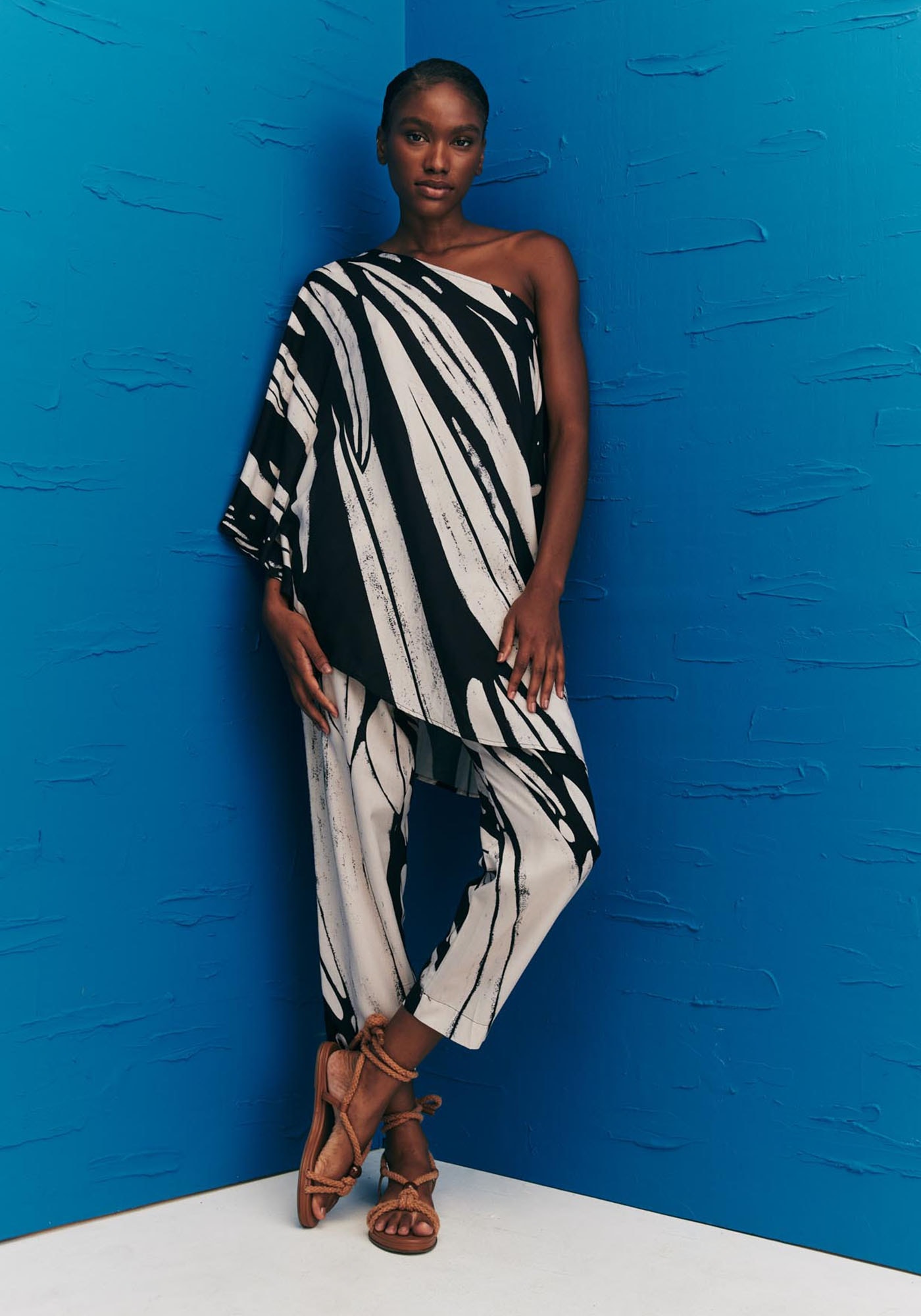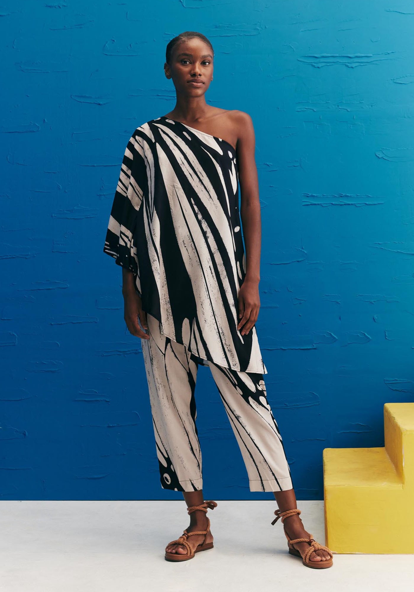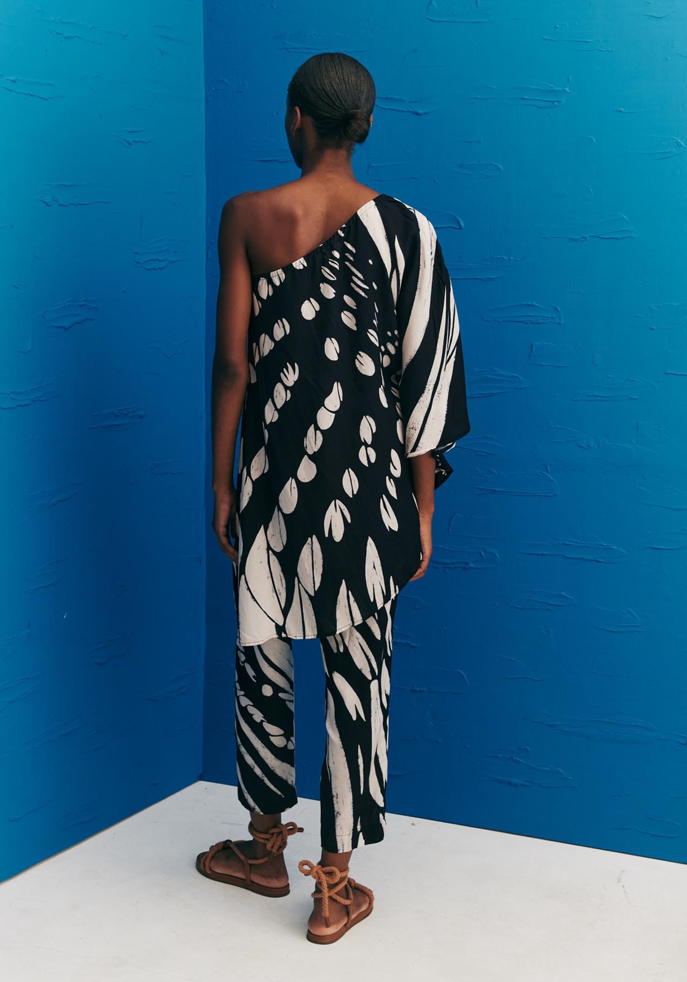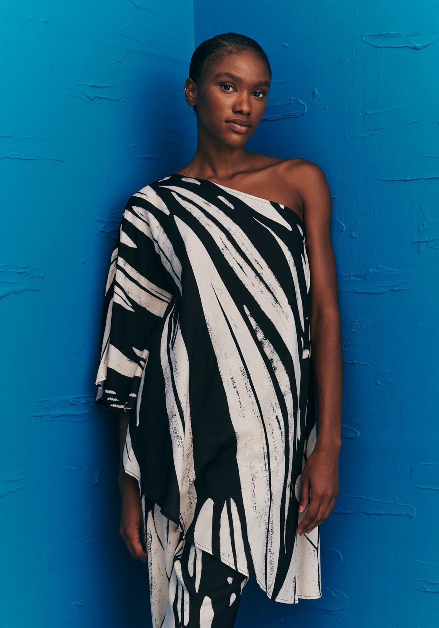 A túnica estampadaColombiana é um modelo elegante e sofisticado. Confeccionada em tecido 100%viscose, o modelo de um ombro só possui manga ampla e uma modelagem assimétricamoderna, que dá movimento e fluidez para a peça.