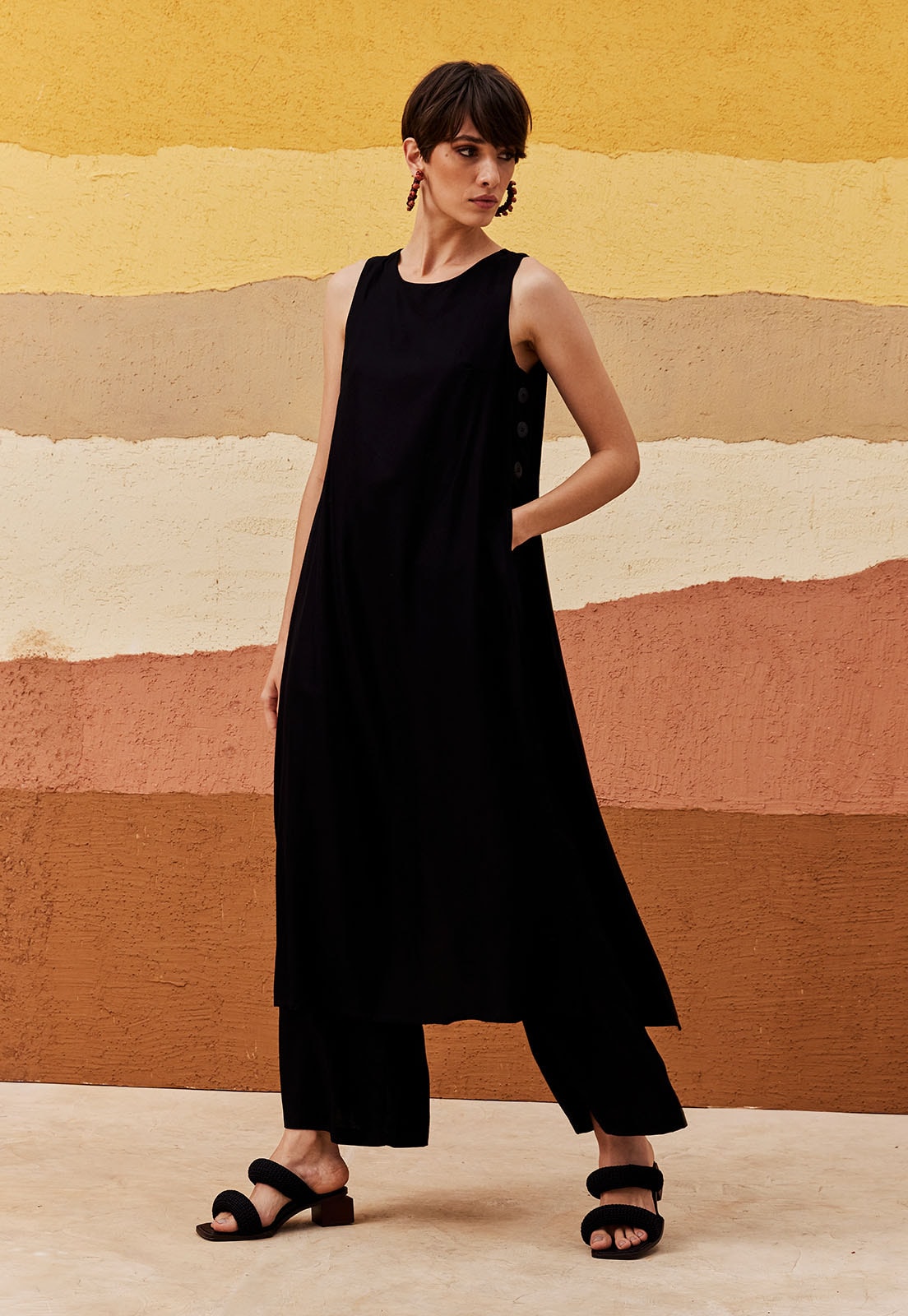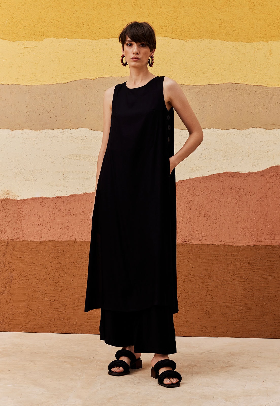 A Veste Alongada Botão Lateral CaCay é a escolha perfeita para quem busca sofisticação com leveza. Confeccionada em 100% viscose, essa peça sem mangas tem caimento fluido e toque suave, garantindo conforto absoluto em qualquer ocasião. Seu design atemporal se destaca pelo corte reto e comprimento alongado até os tornozelos, ideal para compor looks versáteis que transitam do casual ao elegante com facilidade. Os botões decorativos na lateral adicionam um charme sutil e moderno, enquanto a abertura discreta nas costas valoriza a silhueta com delicadeza.