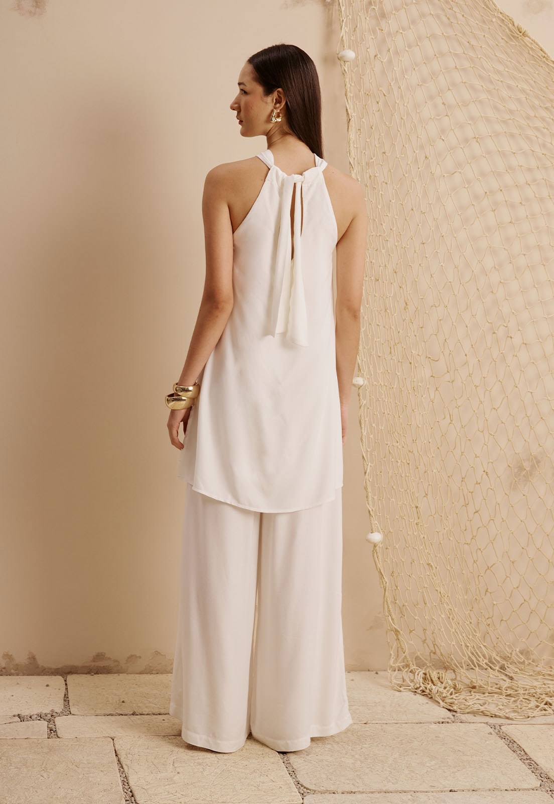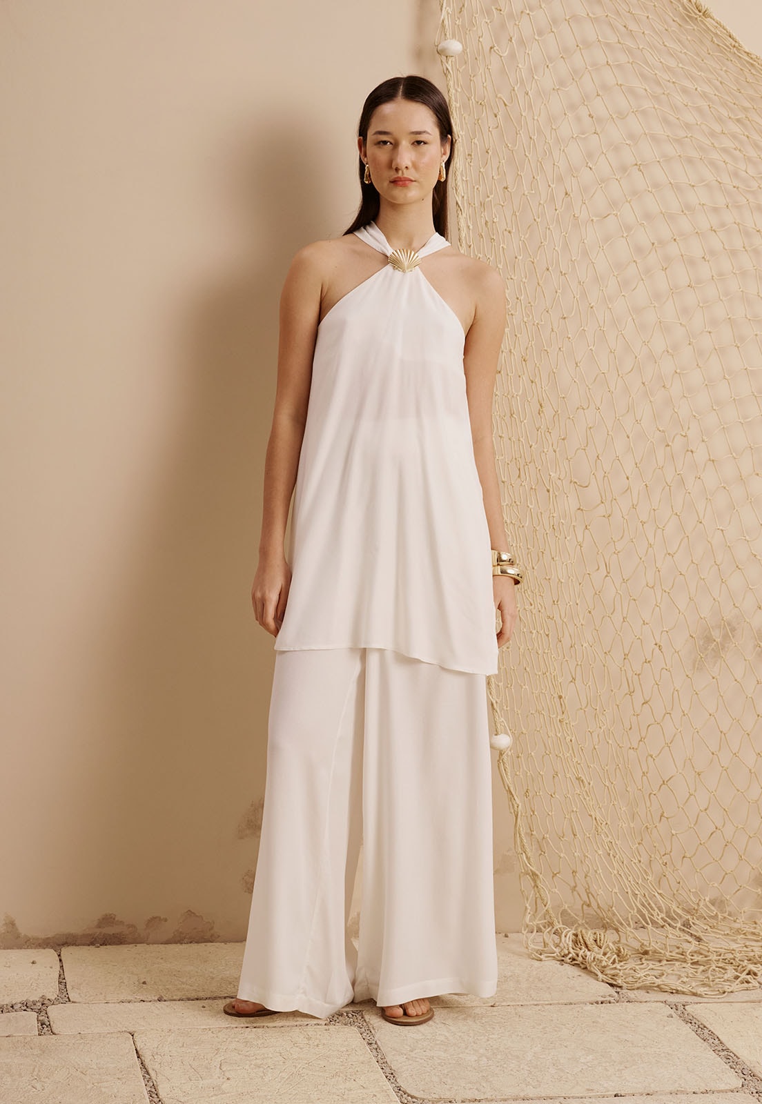A CaCay apresenta uma peça que une leveza e sofisticação em cada detalhe: a Veste Detalhe Concha Dourada é confeccionado em 100% viscose, garantindo toque suave e caimento fluido. A blusa de alças cruzadas com amarração posterior valoriza o colo com elegância. O design é enriquecido por elementos inspirados na estética orgânica, com destaque para o detalhe em formato de concha dourada, que adiciona um toque artesanal e contemporâneo à composição.