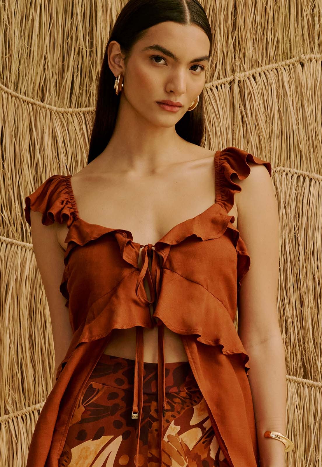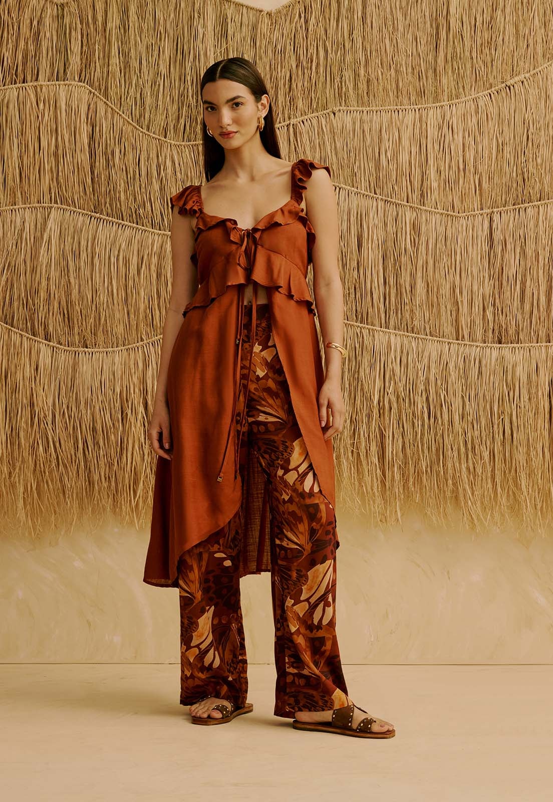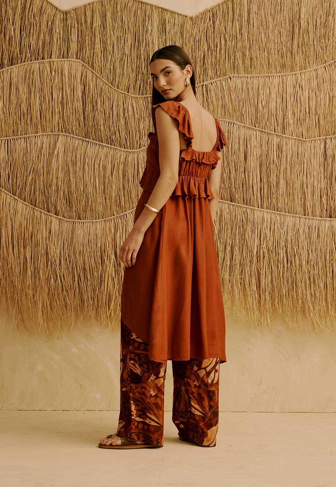 Confeccionado em viscose, o tecido é fresco, sem elasticidade e pensado para uso prolongado com conforto. A peça é versátil e pode ser usada em momentos casuais, no dia a dia ou em ocasiões que pedem um toque elegante sem esforço. O detalhe em amarração adiciona personalidade, enquanto os babados trazem movimento atemporal. Combine com acessórios delicados, sandálias ou uma bolsa estruturada para criar composições cheias de estilo.