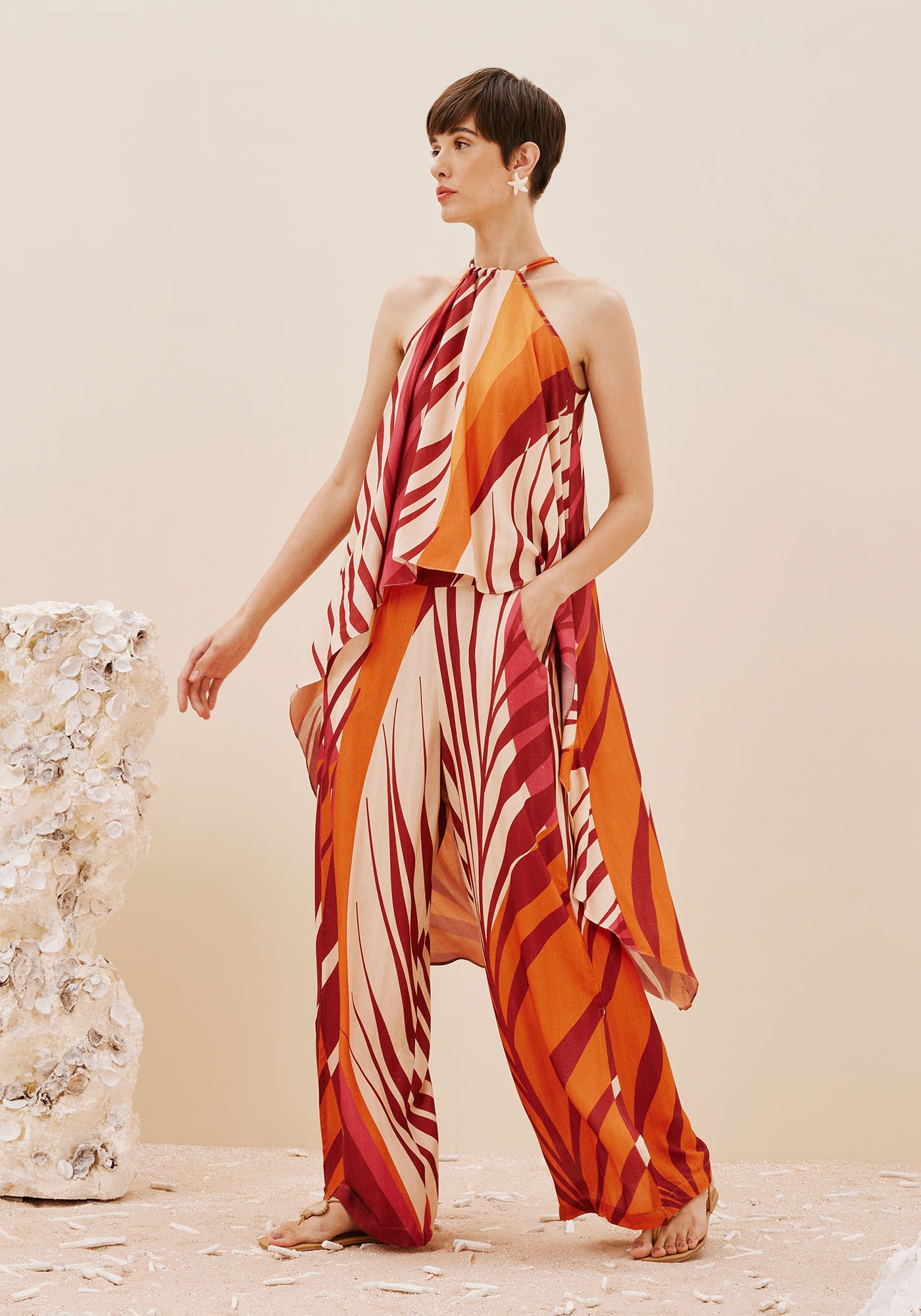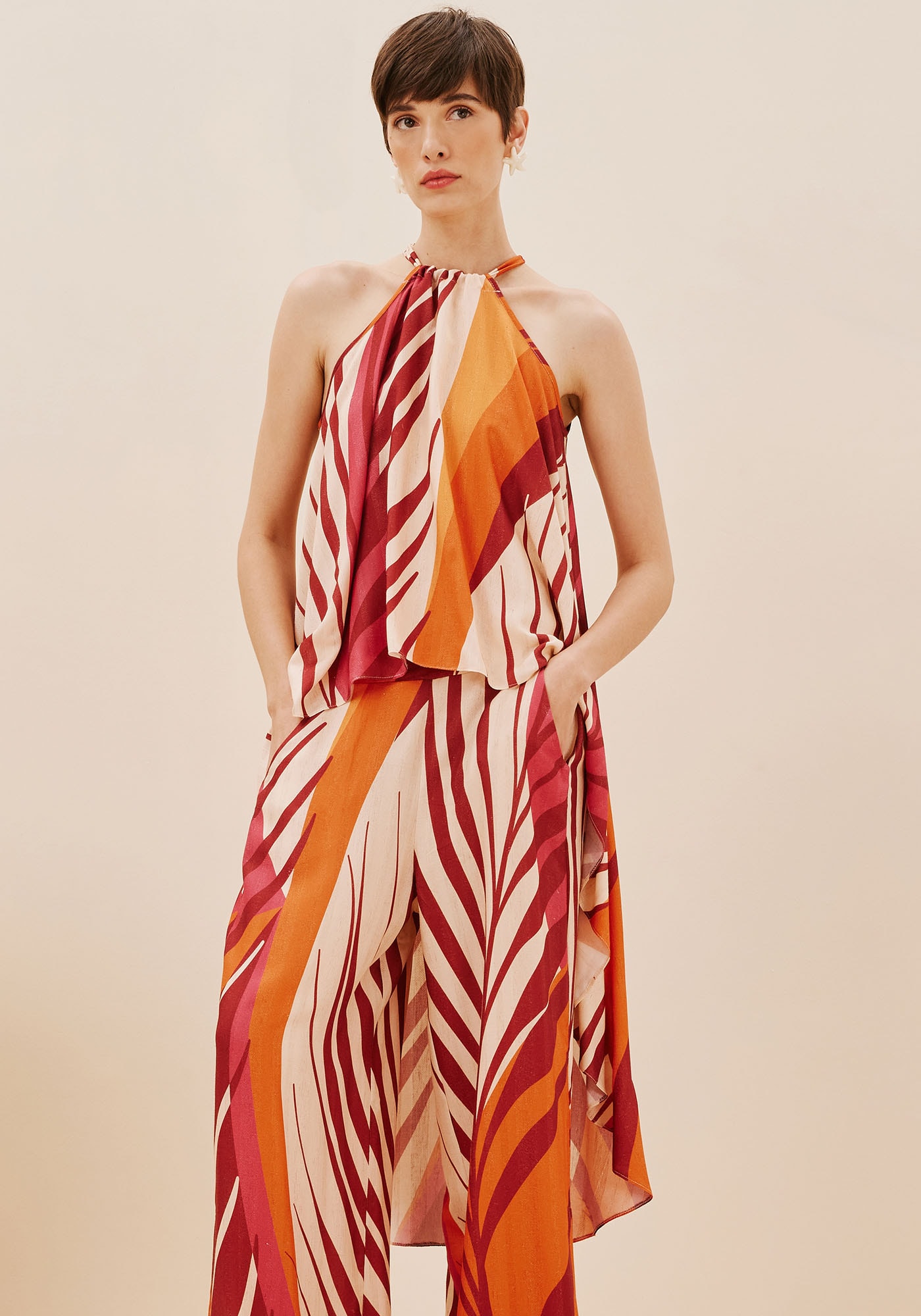 Esta Veste fluida com designmullet é perfeita para elevar o estilo em qualquer look. A gola alta comamarração nas costas adiciona sofisticação com um ajuste personalizado,enquanto a sua estampa Palm traz um toque tropical e moderno à peça.Confeccionada em 97% viscose 3% linho, oferece leveza e frescor para os dias deverão.