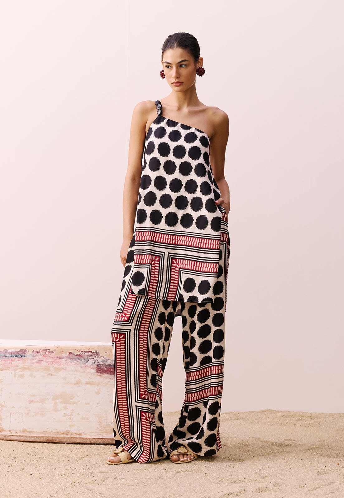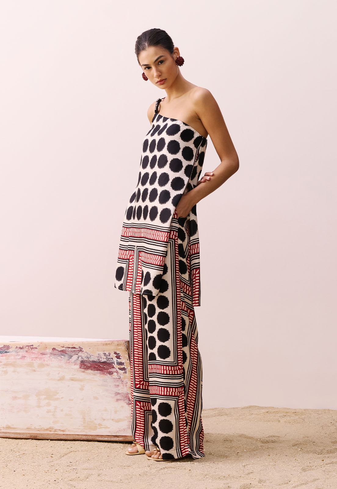 A Veste Um Ombro Só Estampada Açaí da CaCay é a união perfeita entre design contemporâneo e conforto. Com alça única no ombro direito e corte assimétrico, essa peça valoriza a silhueta com elegância e personalidade. A estampa exclusiva combina formas circulares na parte superior com padrões geométricos na inferior, criando um visual sofisticado e fluido. Produzida em 100% viscose, garante toque leve e caimento solto, ideal para quem busca liberdade de movimento com estilo.