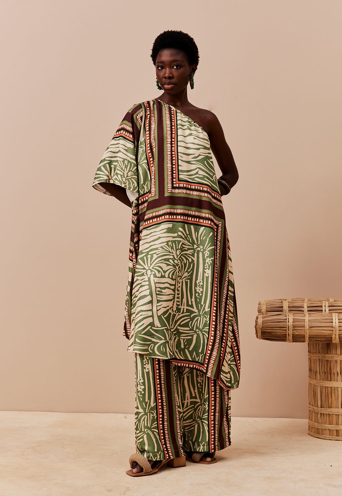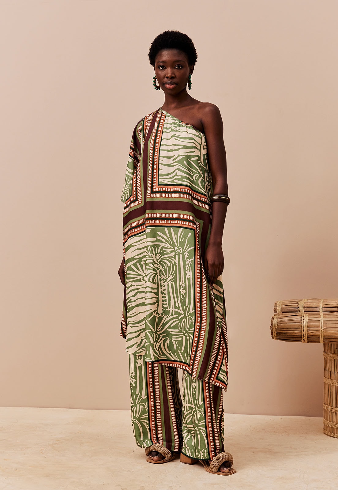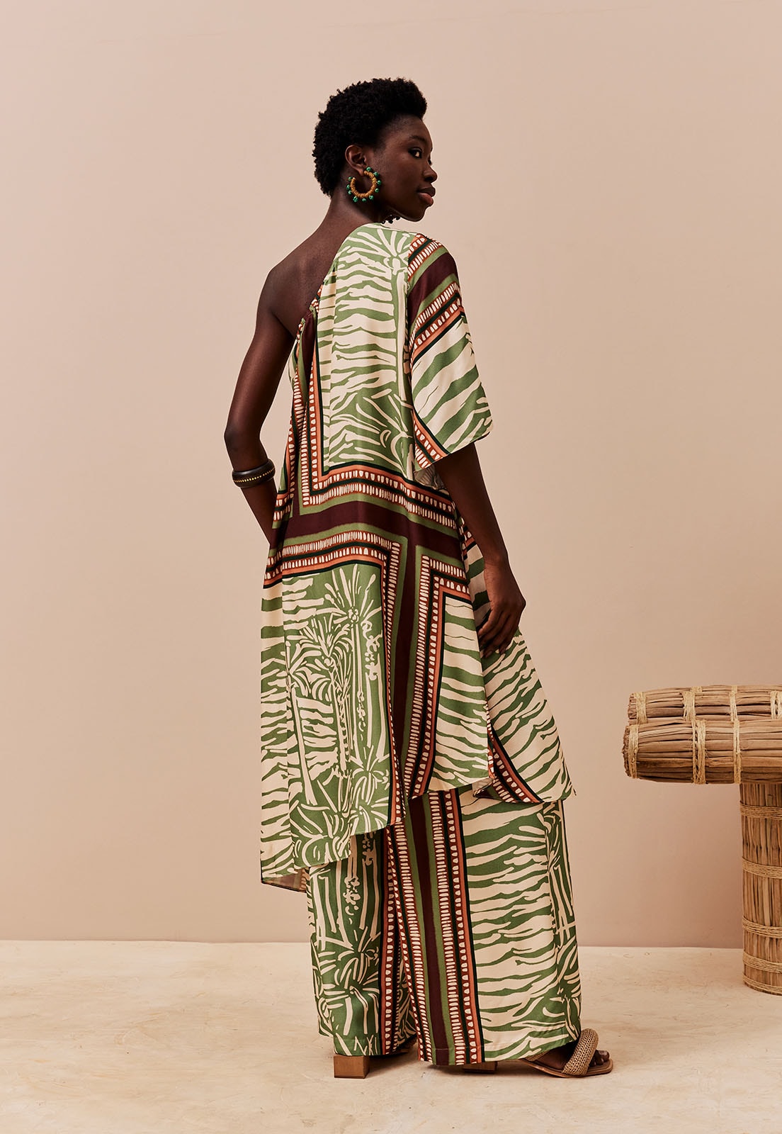 A veste estampada Laguna é confeccionada em tecido 100% viscose. É um modelo moderno, de um ombro só, com shape amplo e fluído, de pontas irregulares.