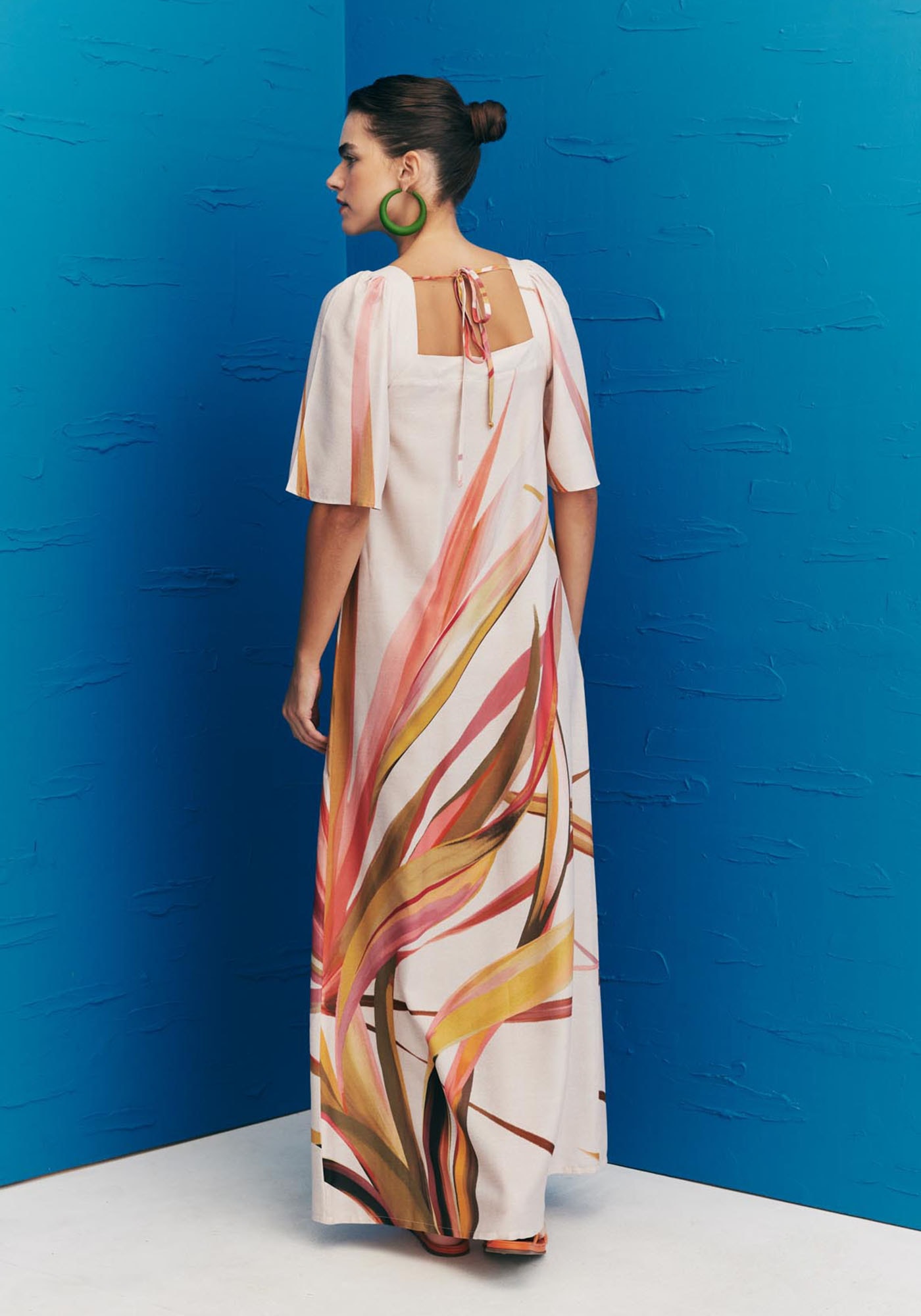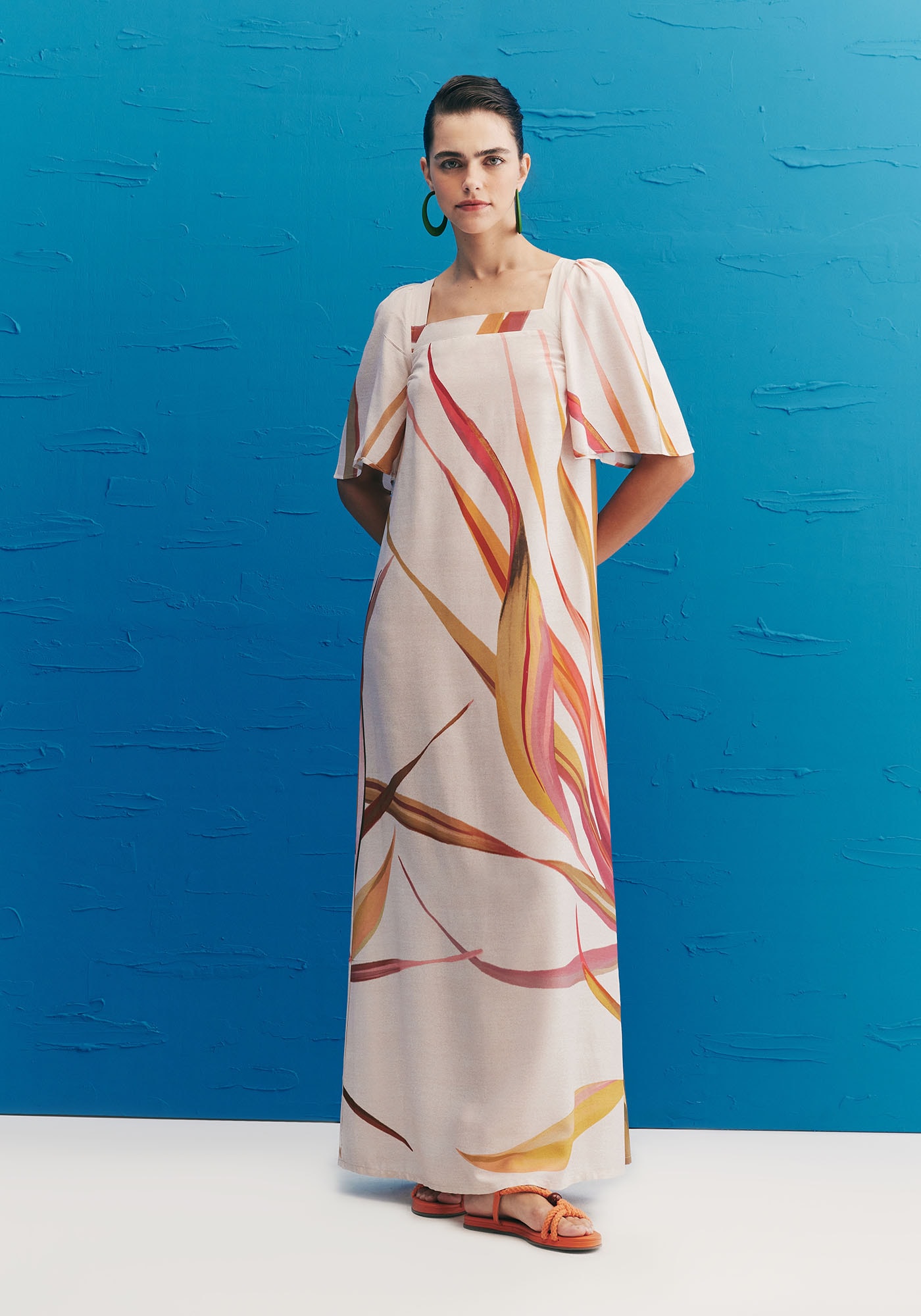 O Vestido Amplo com Manga Estampado Belize é uma peça versátil,prática e cheia de estilo. Com modelagemevasê, ele apresenta um decote quadrado na frente e nas costas além de mangascurtas e amplas que garantem um visual sofisticado e confortável. A amarraçãonas costas adiciona um detalhe além de oferecer um ajuste personalizado.Confeccionada em 100% viscose, apresenta um caimento leve e fluido.